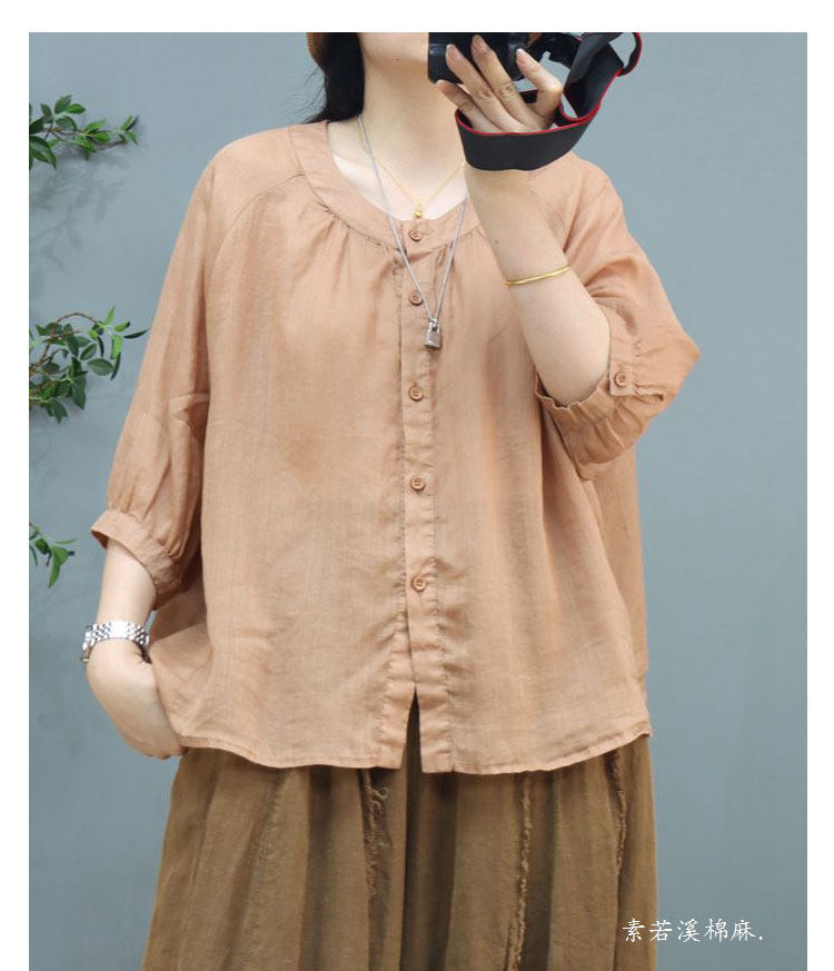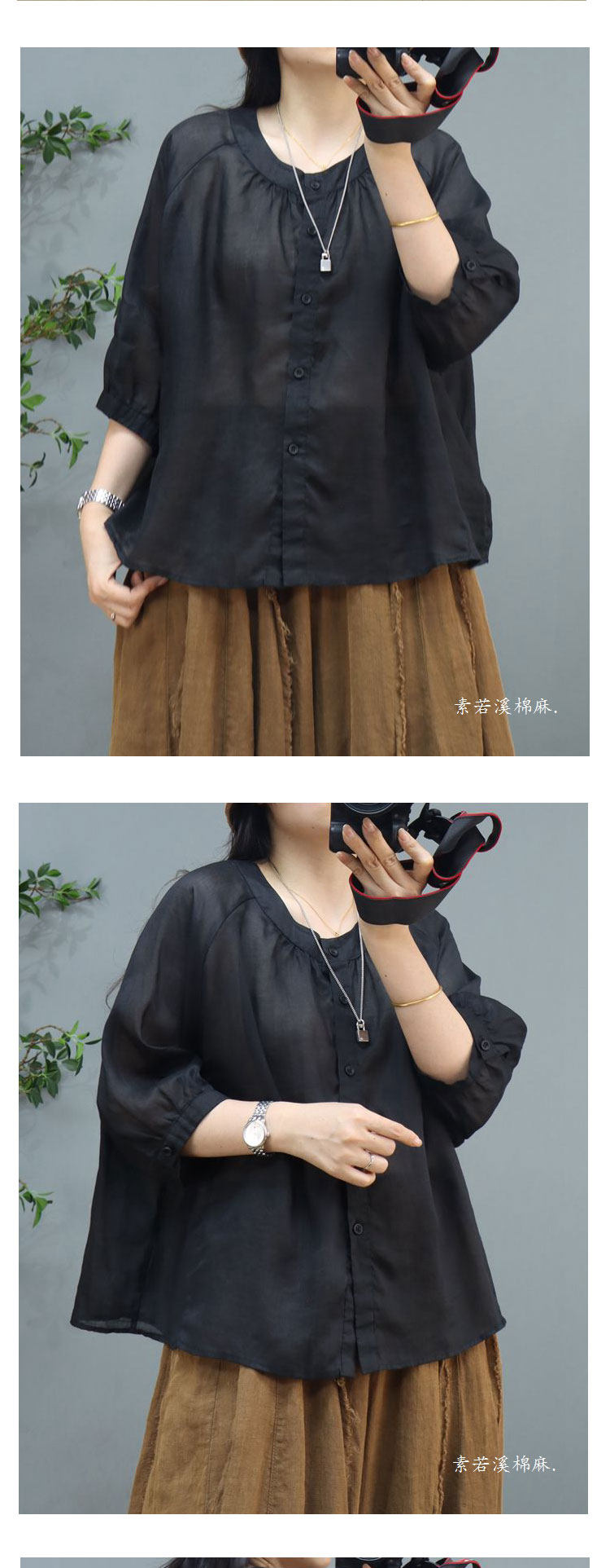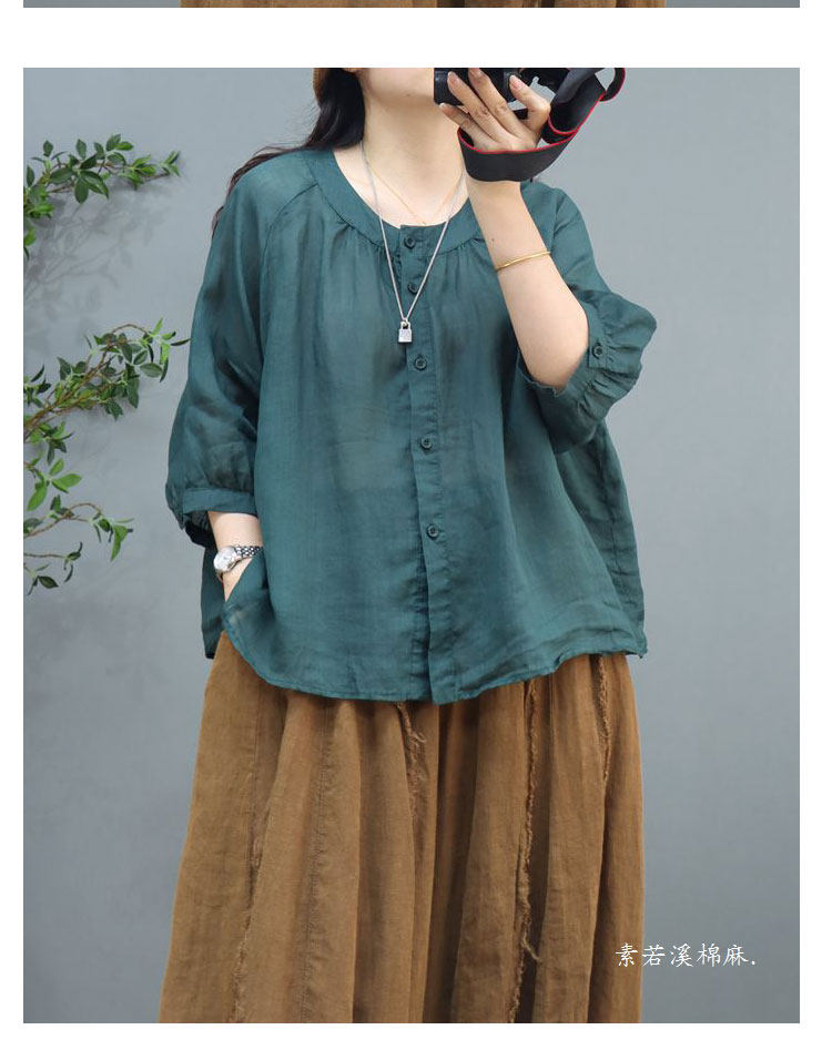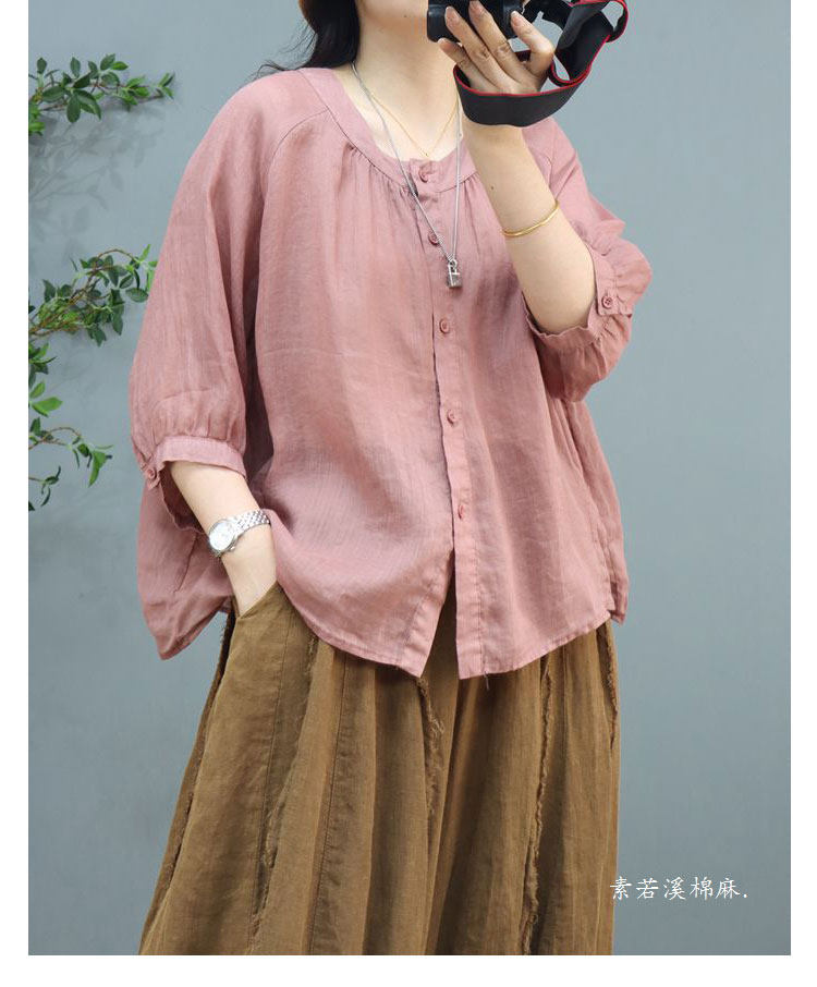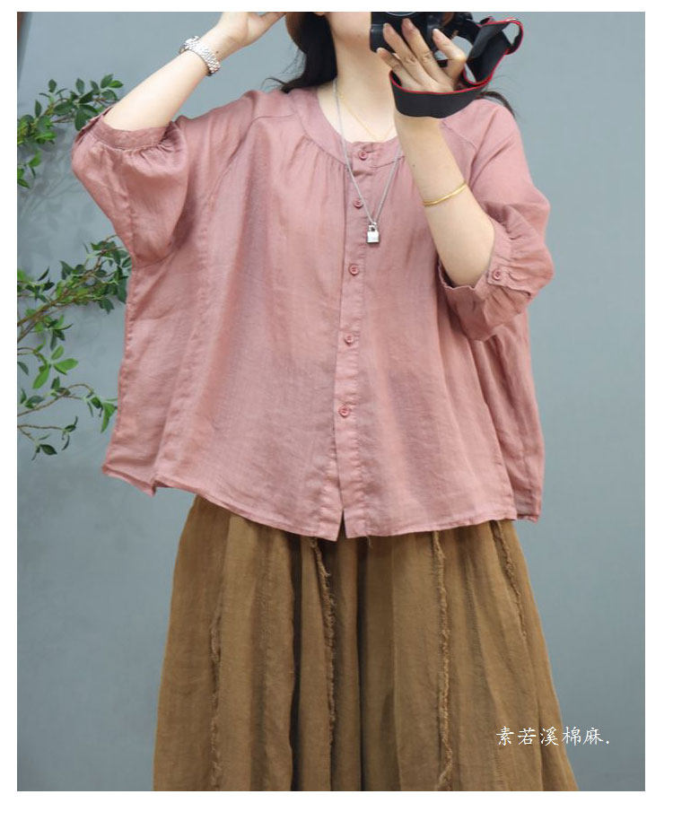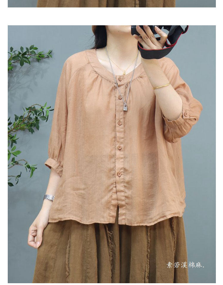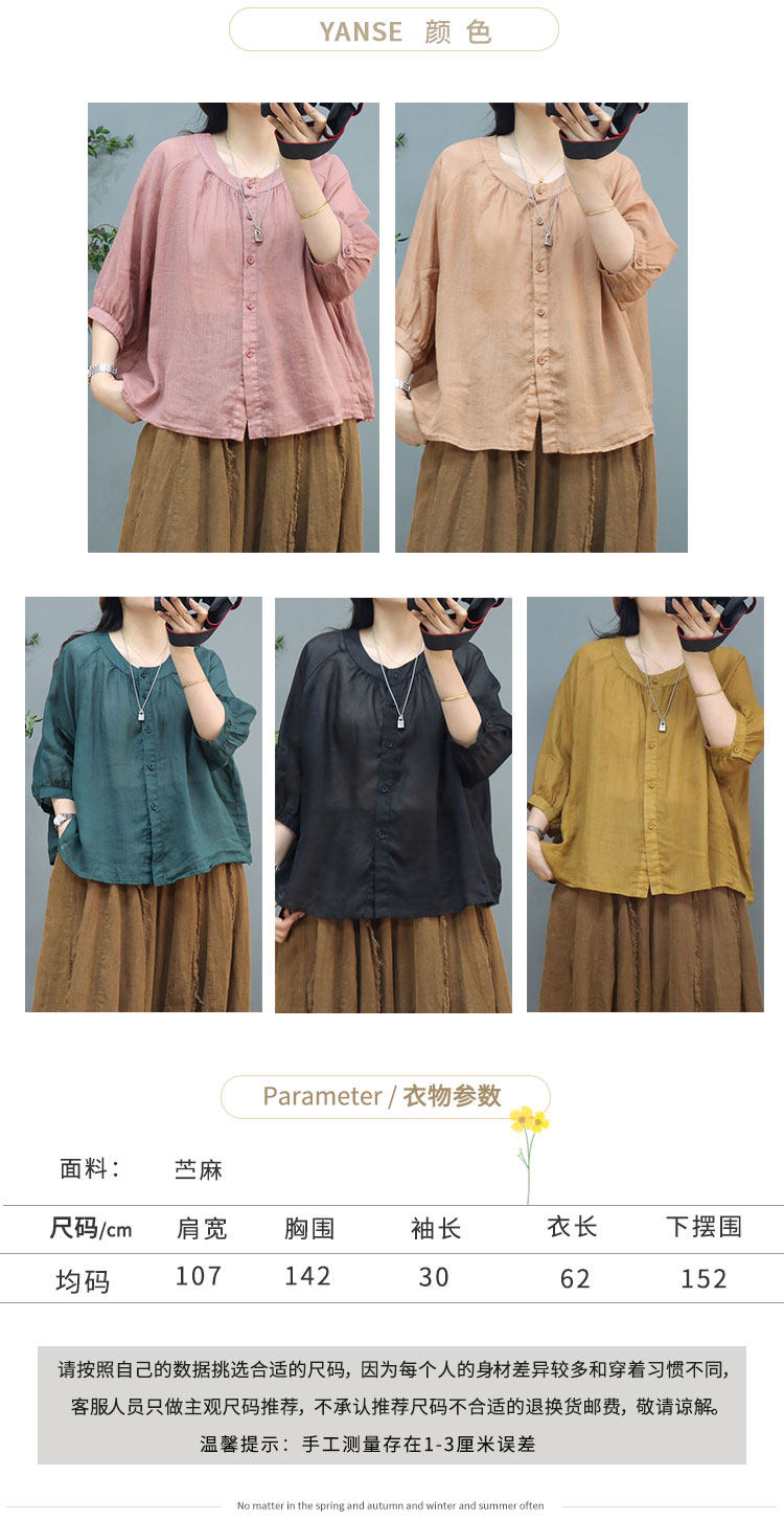 Commuting simple solid color ramie cardigan top for women summer three-quarter sleeve loose baby style slimming shirt