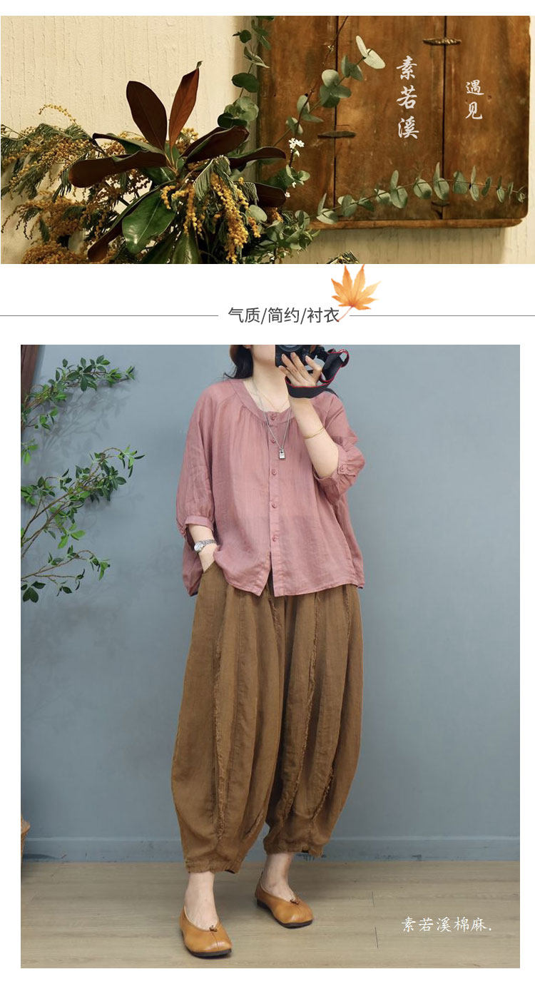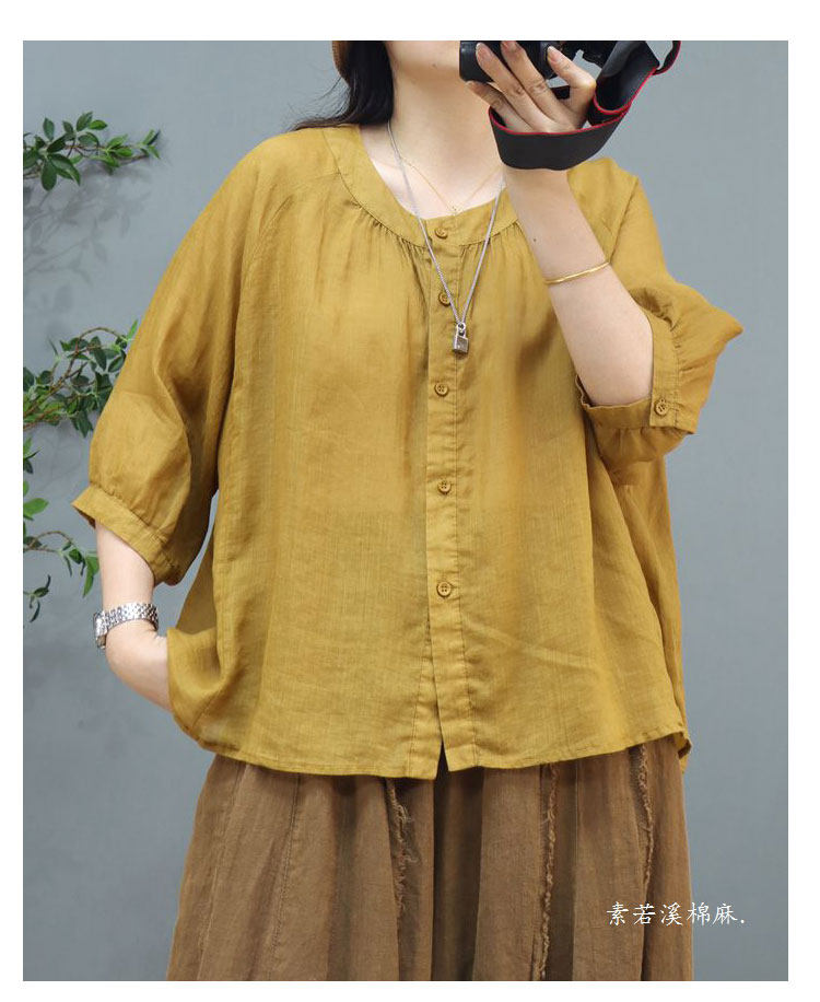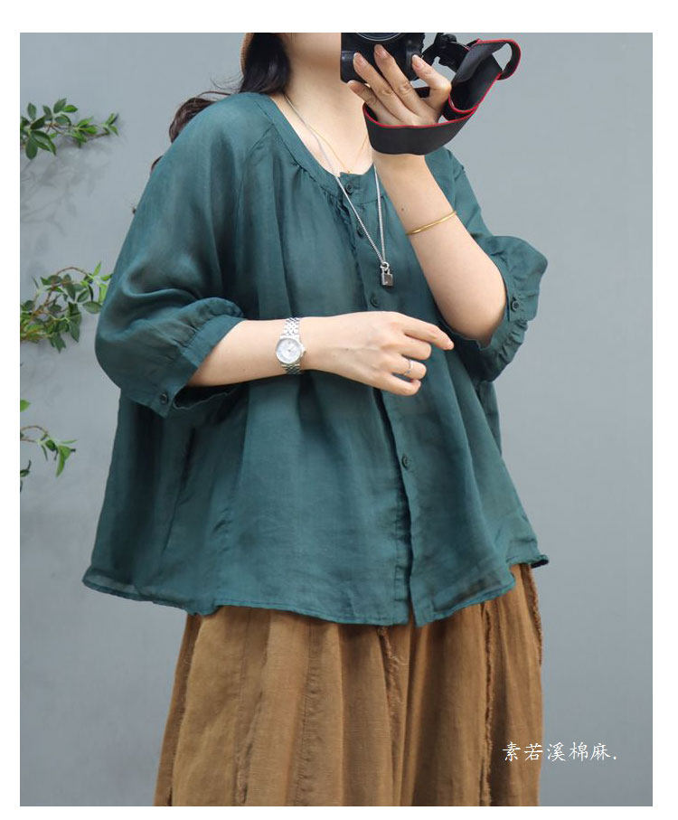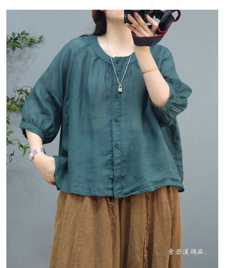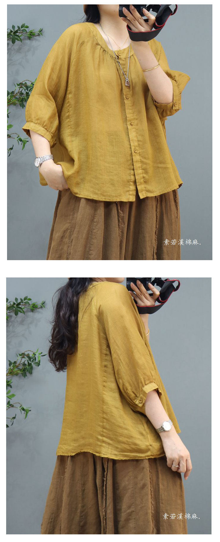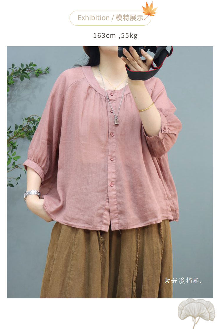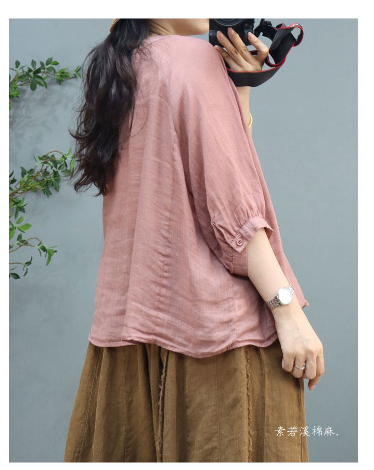 Commuting simple solid color ramie cardigan top for women summer three-quarter sleeve loose baby style slimming shirt