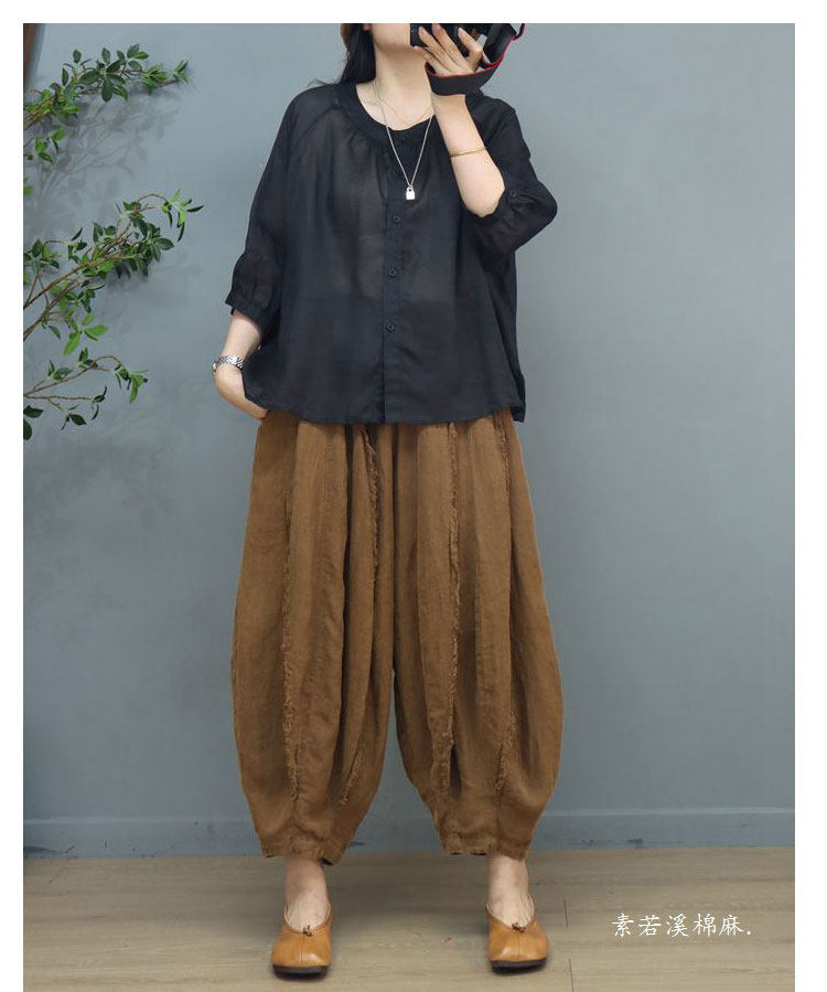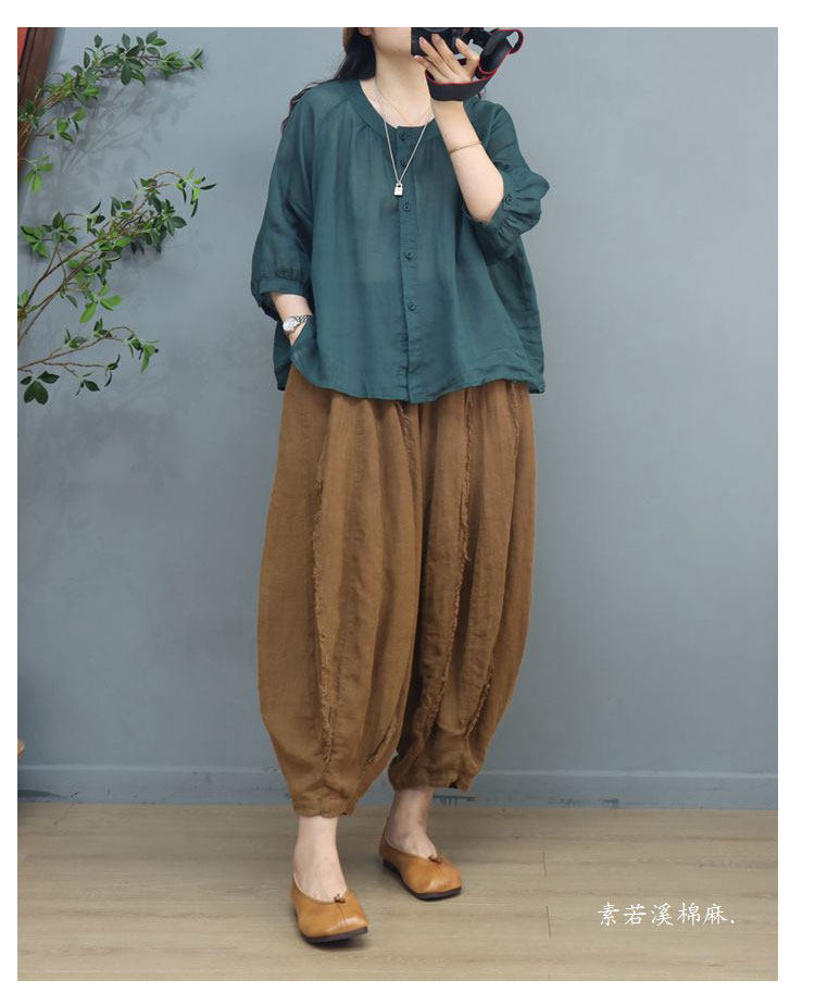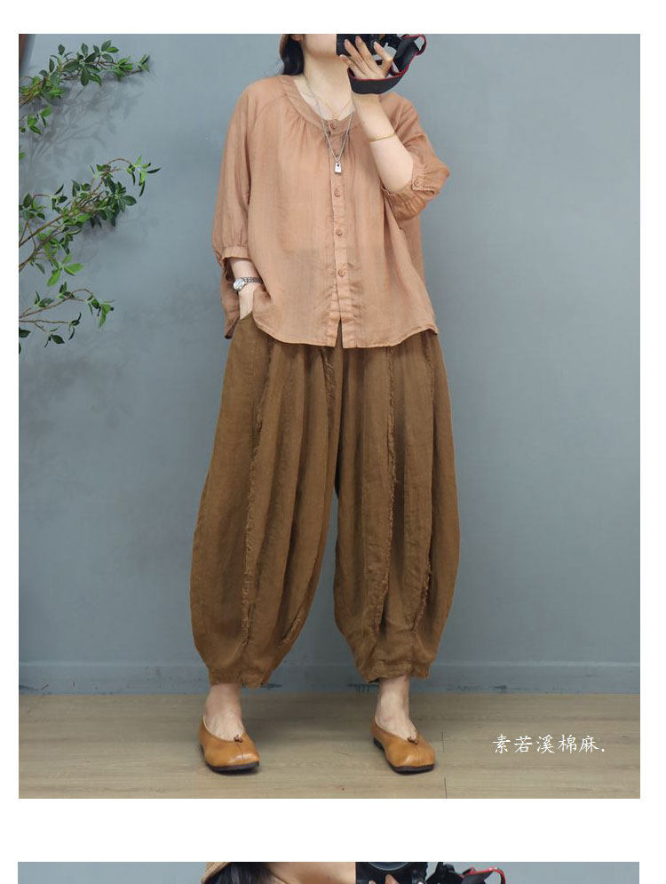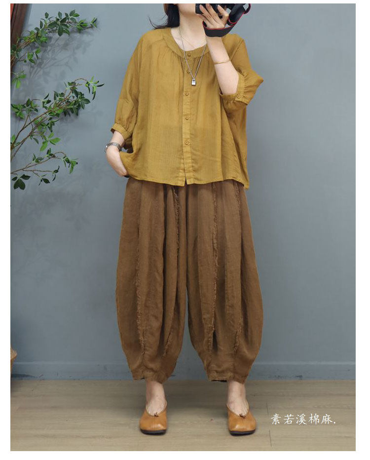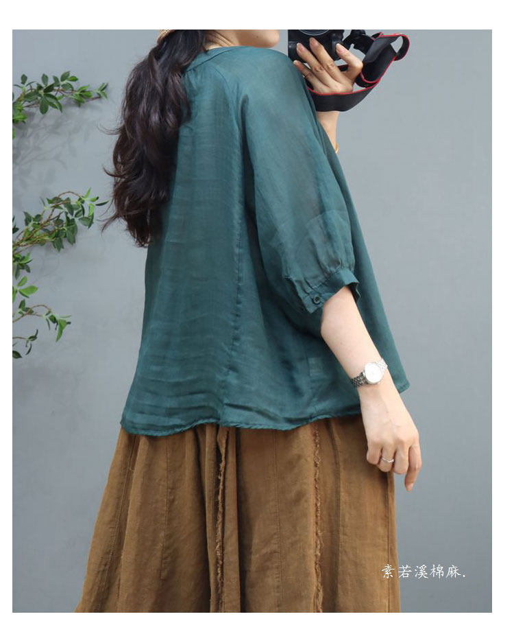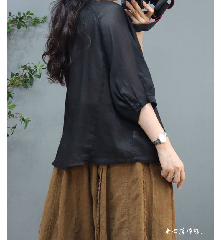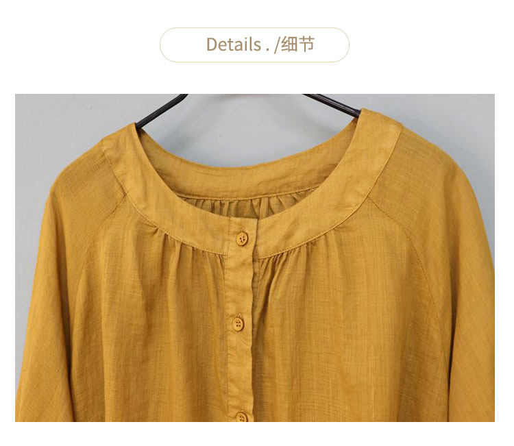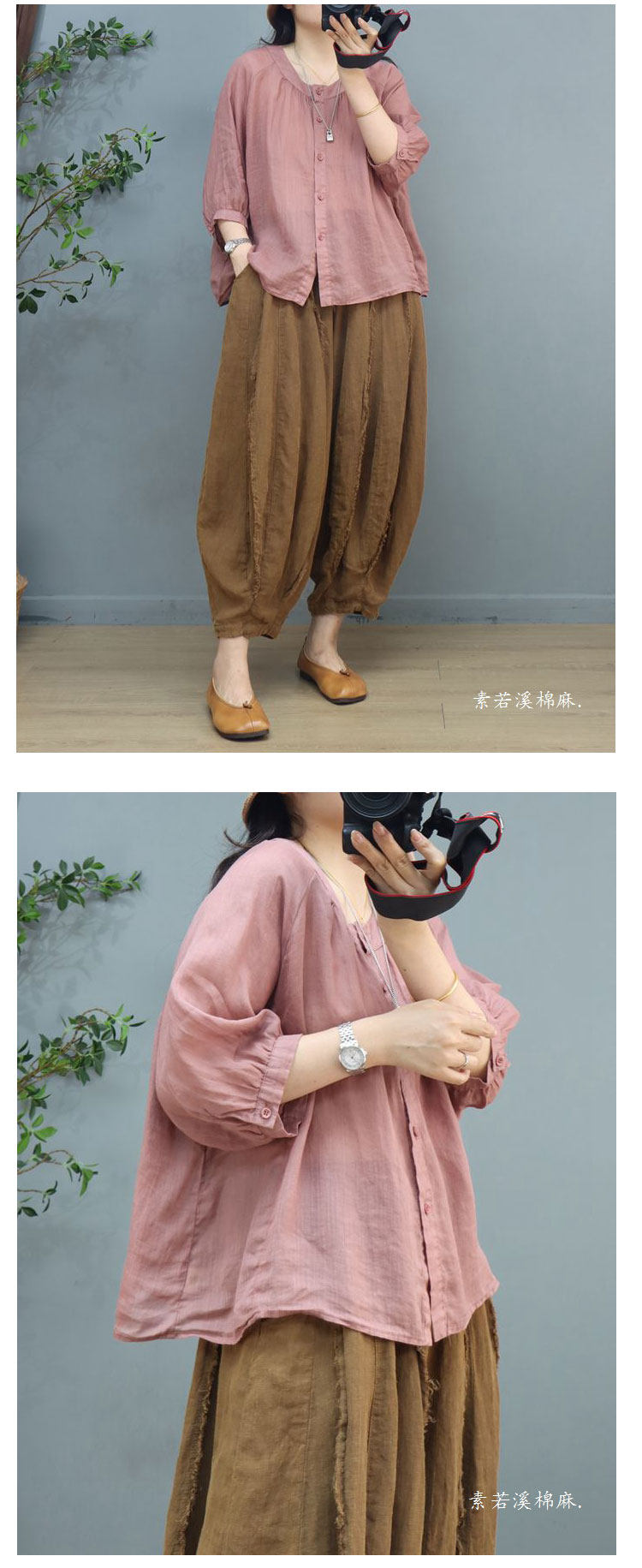 Commuting simple solid color ramie cardigan top for women summer three-quarter sleeve loose baby style slimming shirt