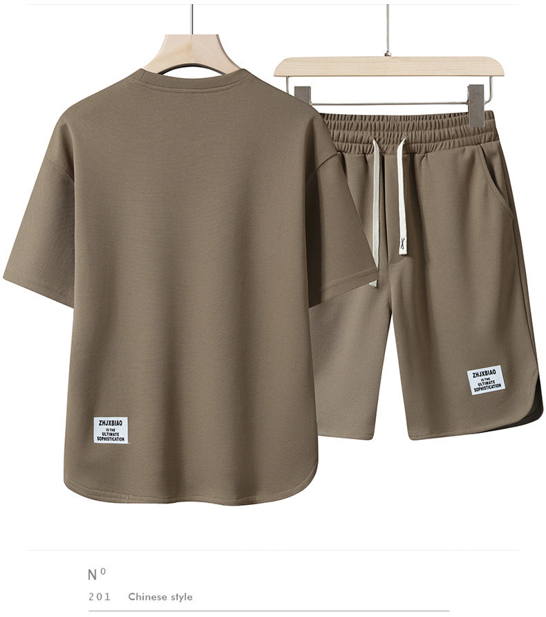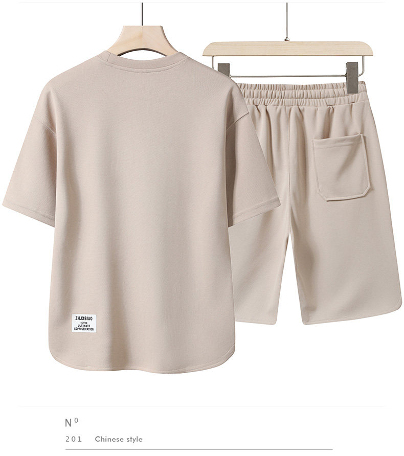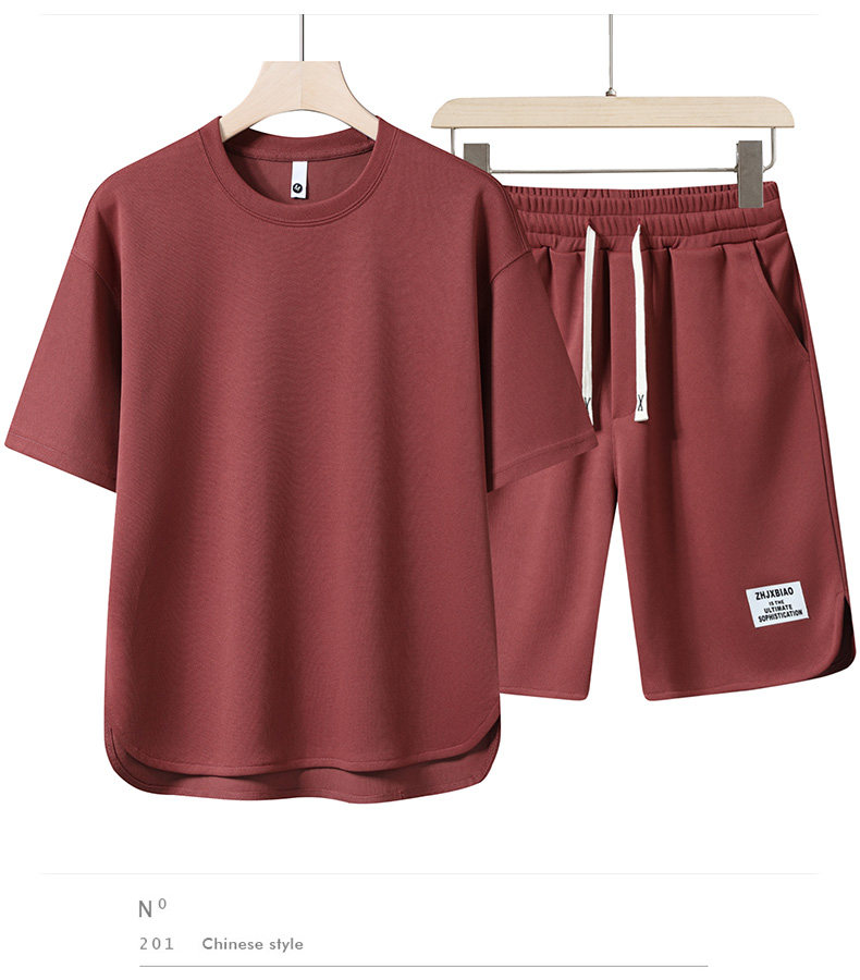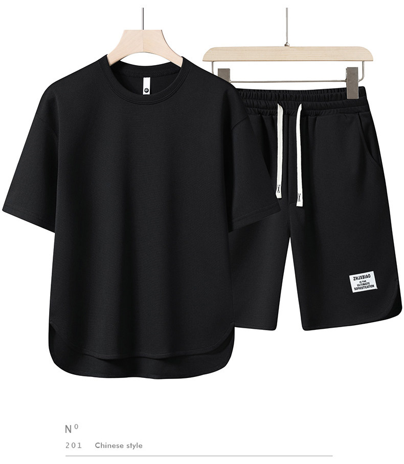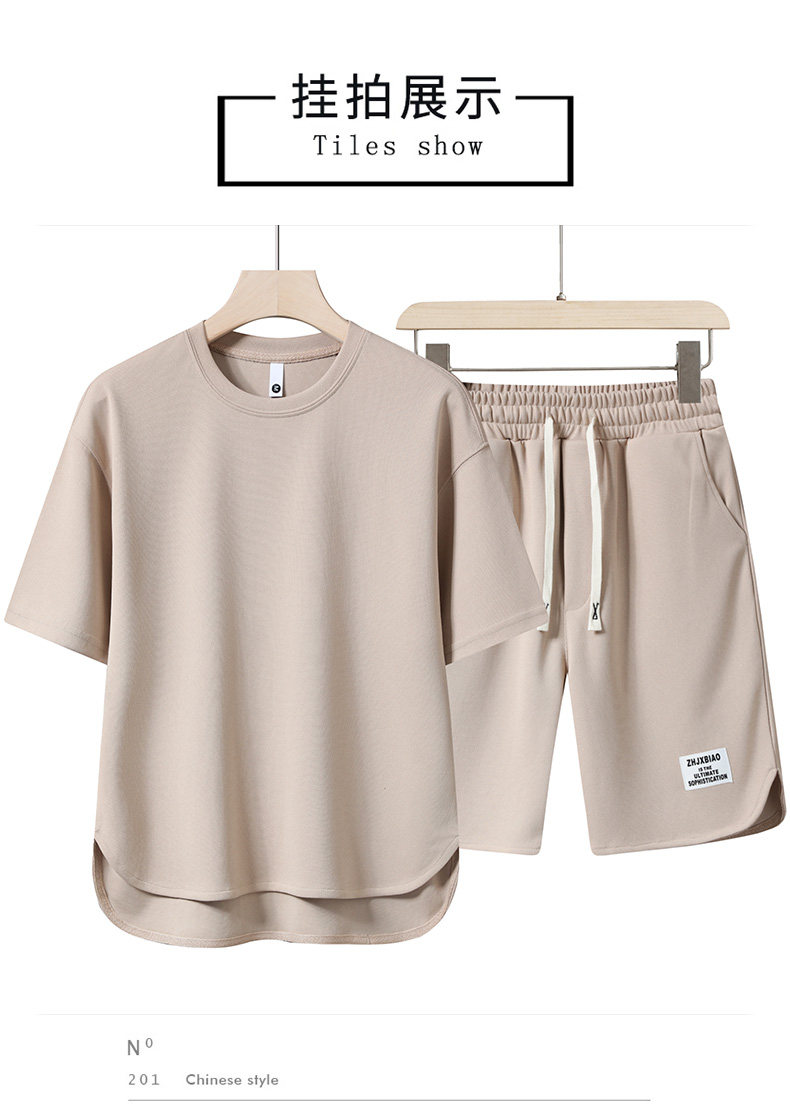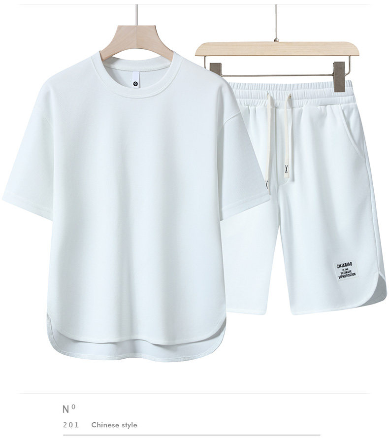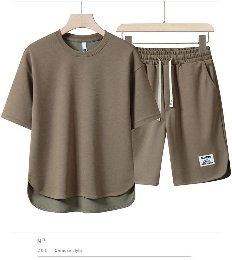 Summer Short-Sleeve Suit for Men, Round-Neck T-Shirt, High-End Solid Color Half-Sleeve, Slit Hem, Thin and Breathable, Five-Point Shorts Two-Piece Set