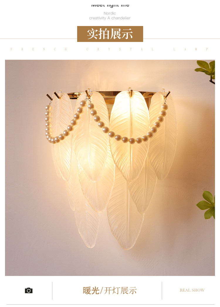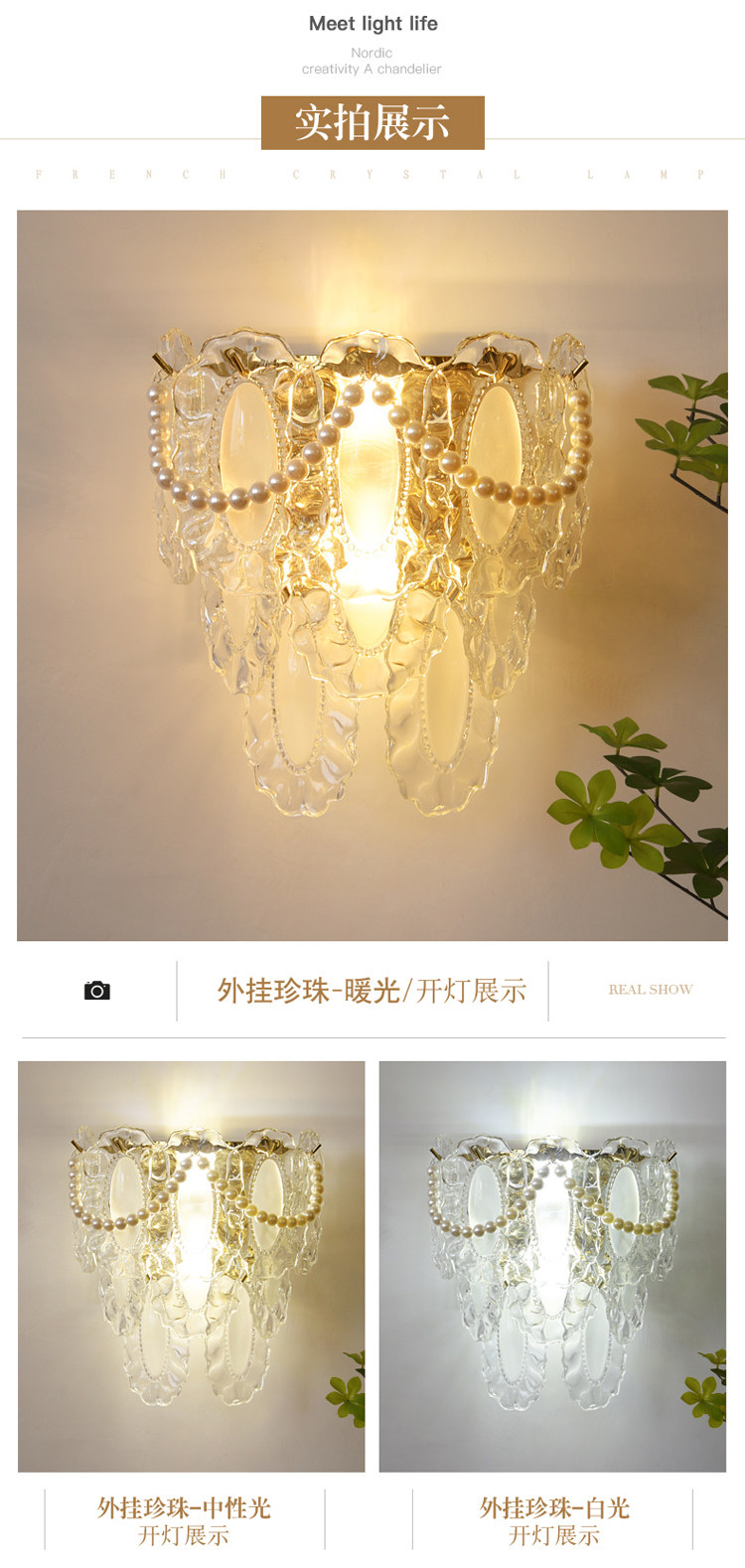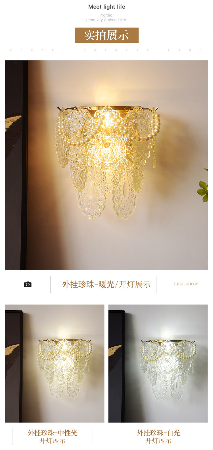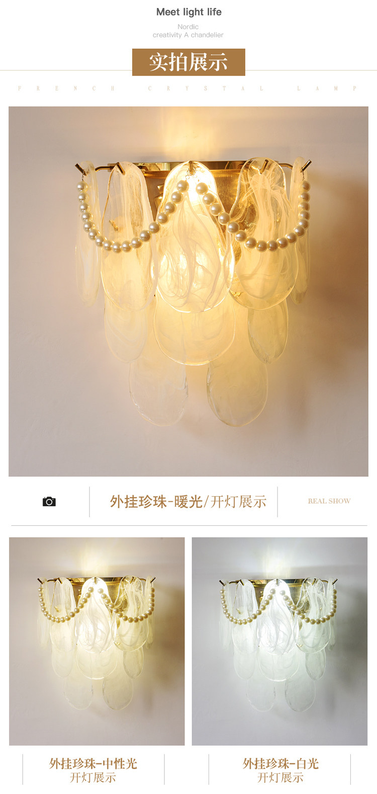 French-Style Light Luxury Wall Lamp, Crystal Glass Bedroom Bedside Lamp, Living Room Hallway Corridor Feather Shell Pearl Cream Style