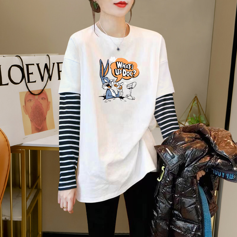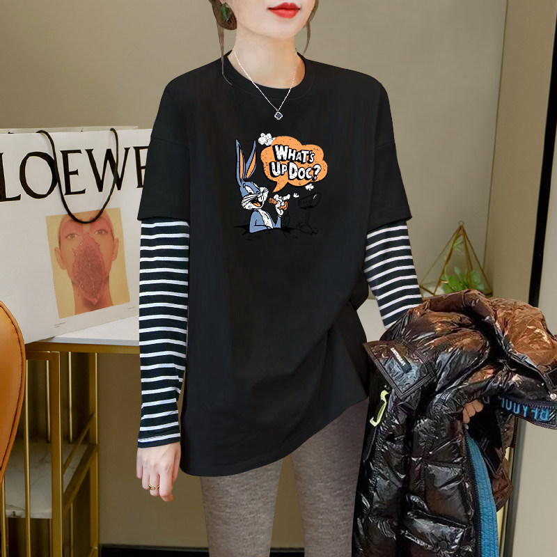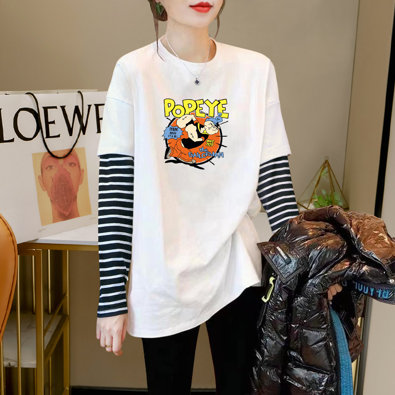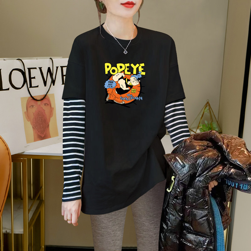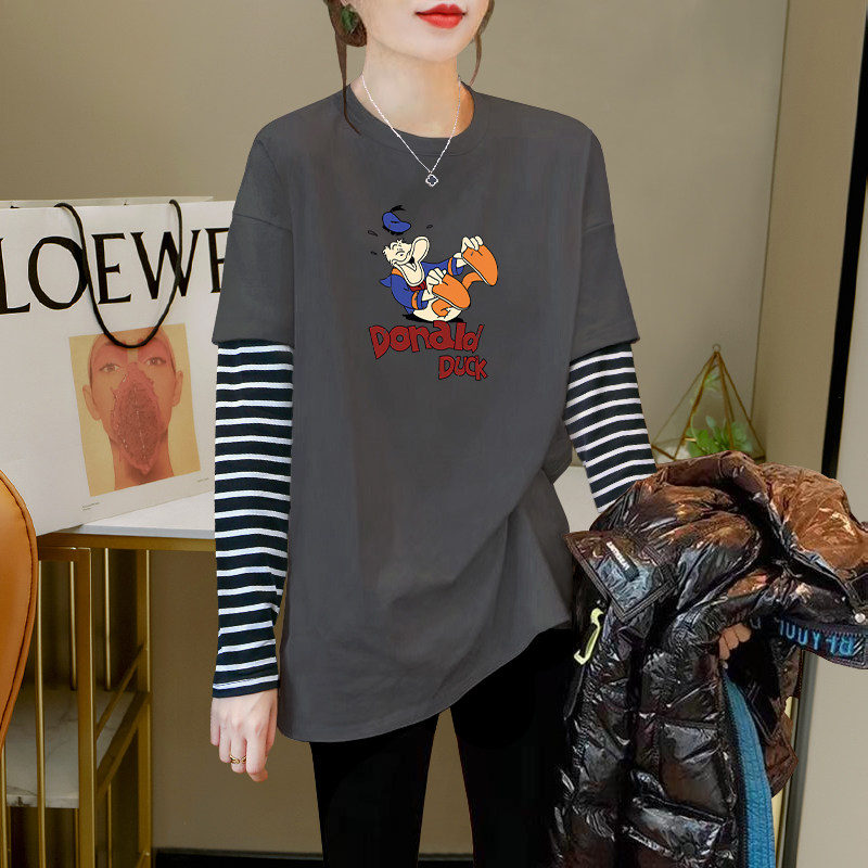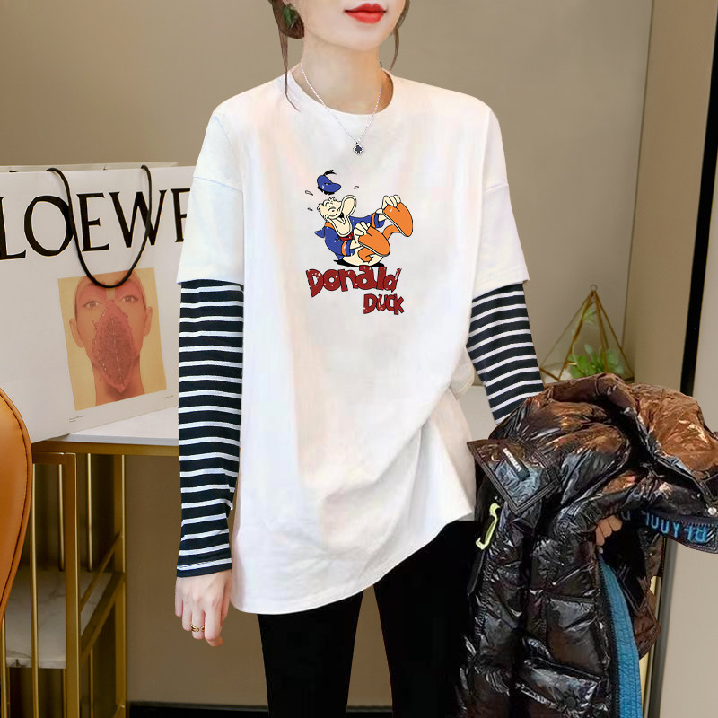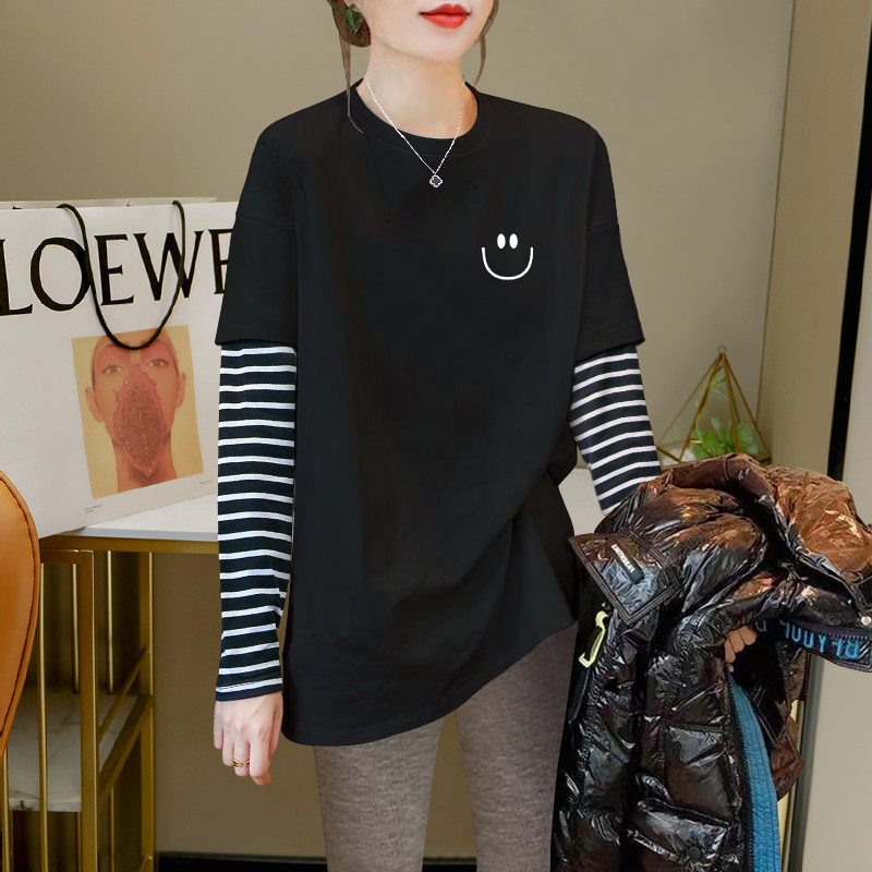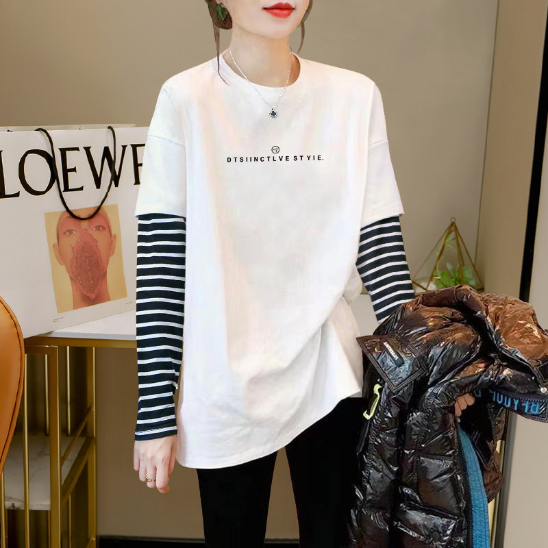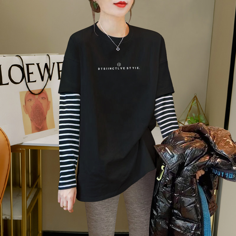2026 Autumn/Winter New Striped Color-Block Fake Two-Piece Long-Sleeve T-Shirt for Women, Loose Fit, Hip-Covering, Mid-Length, Thickened Top