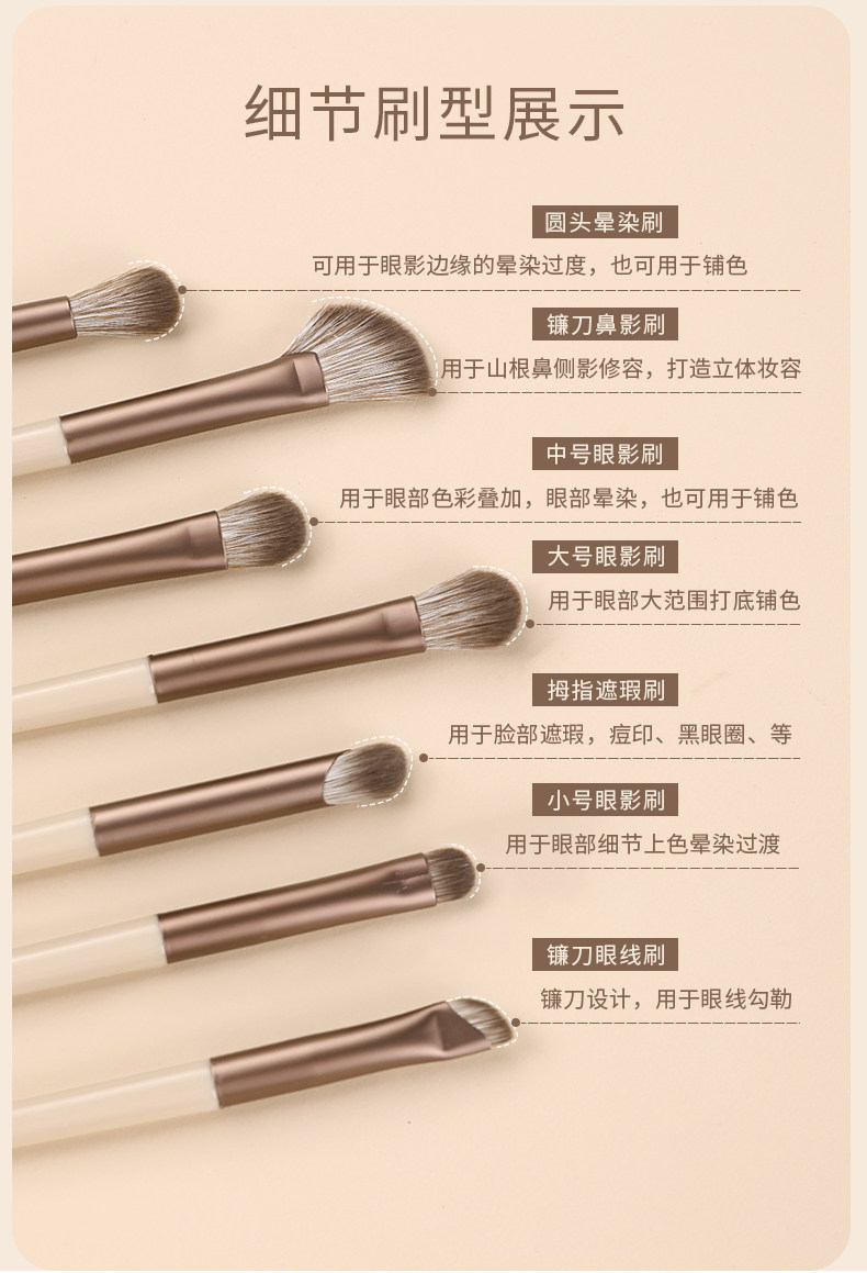 Efficacy Apply Foundation Evenly,Create a Natural Three-Dimensional Effect for the Nose.,Outline the Eye,Blush Smudge,Detailed Blending,Eyeshadow Blending,Outline Eyeliner,Facial Concealer,Evenly Set Makeup