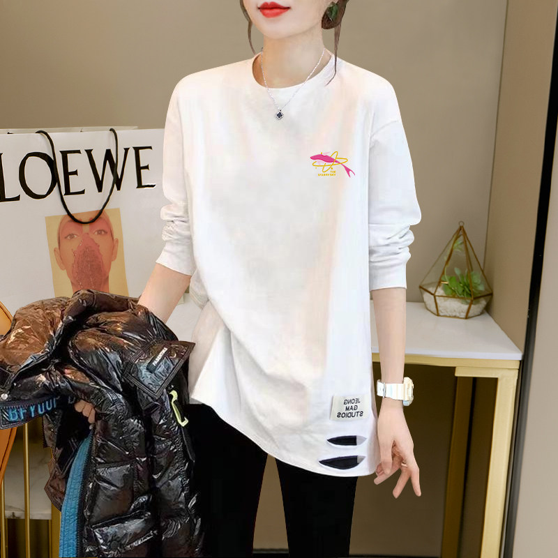 Round Neck Women's Long-Sleeve T-Shirt, Loose Fit, Autumn and Winter Brushed Thickened Mid-Length Top with Distressed Details