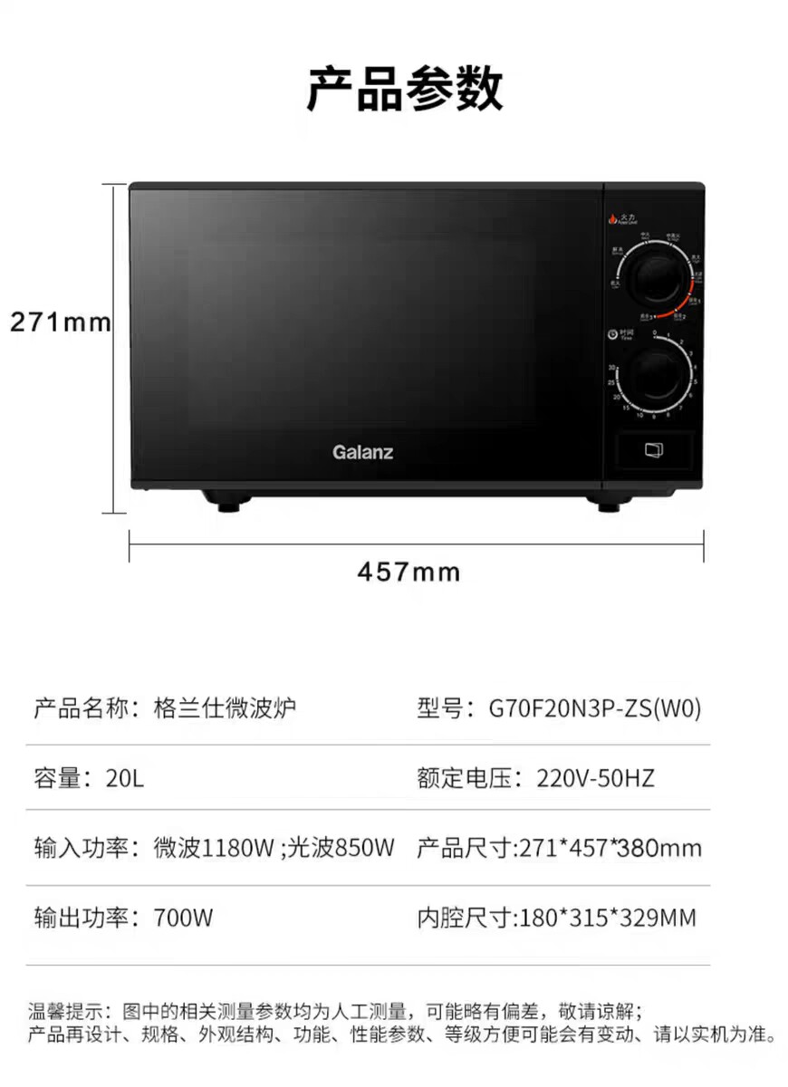Galanz G70F20N3P-Zs(W0) Microwave Oven Household Smart Light Wave Oven Knob Flat Panel Official
