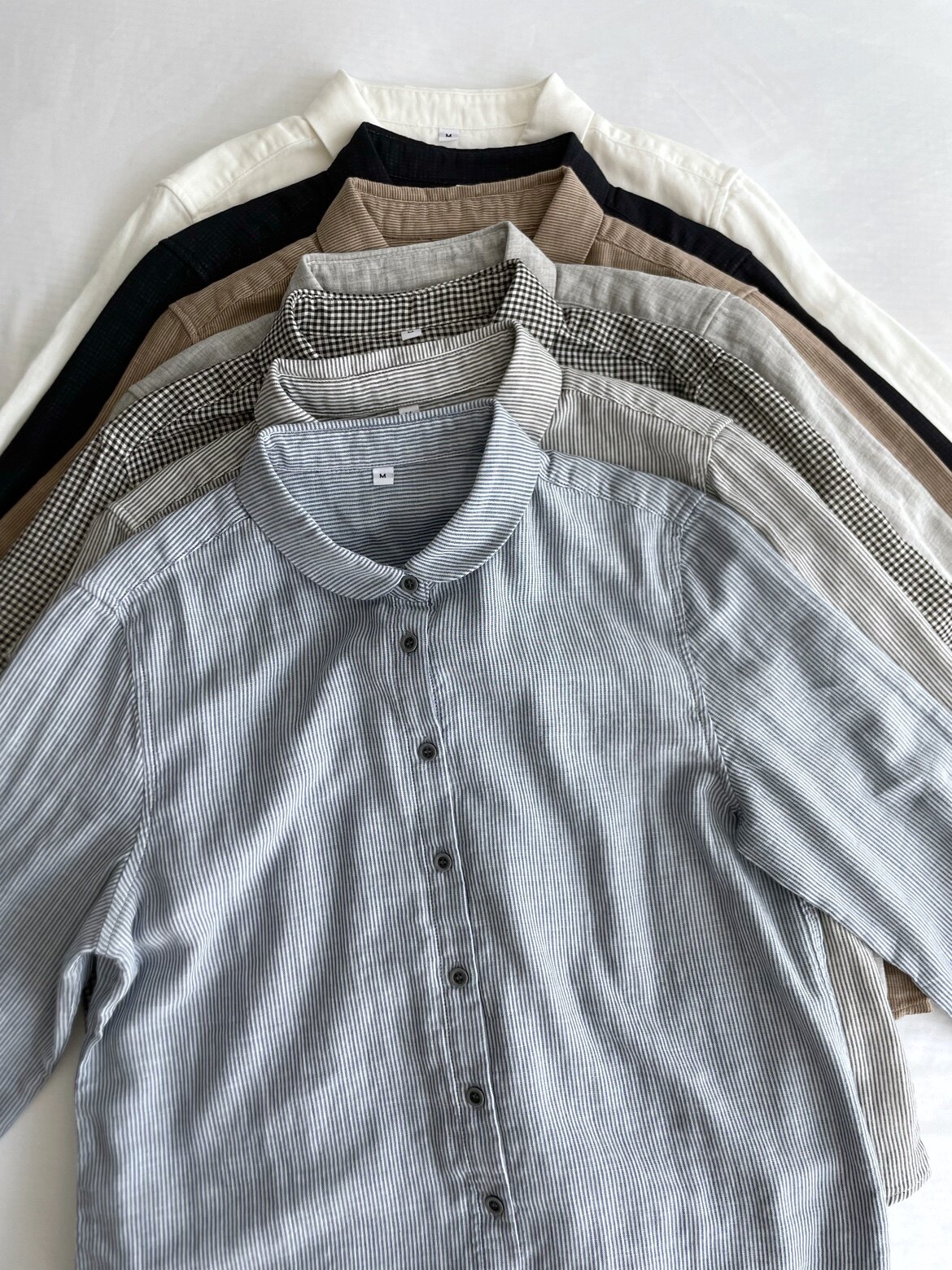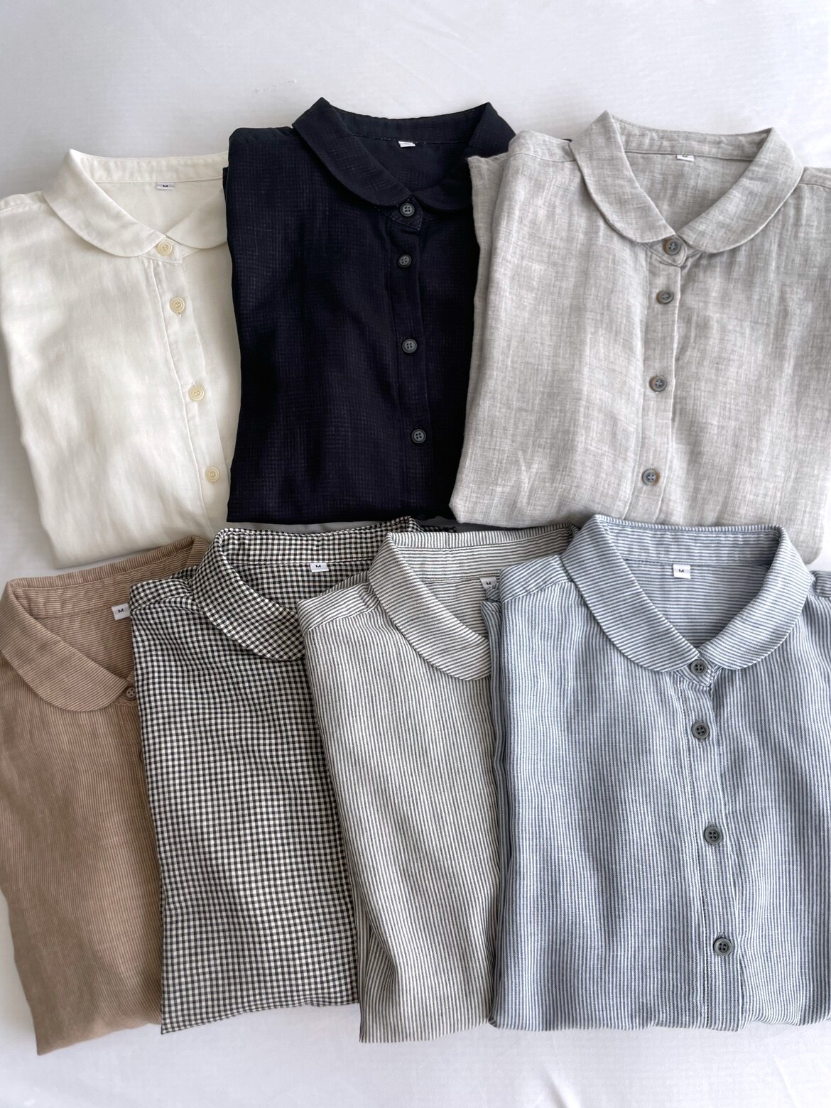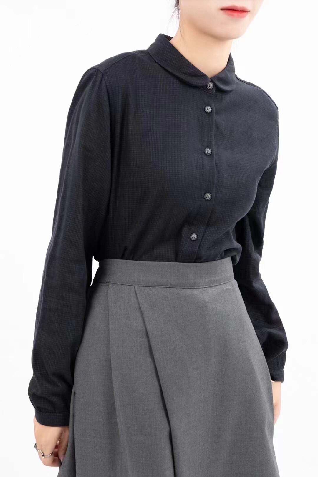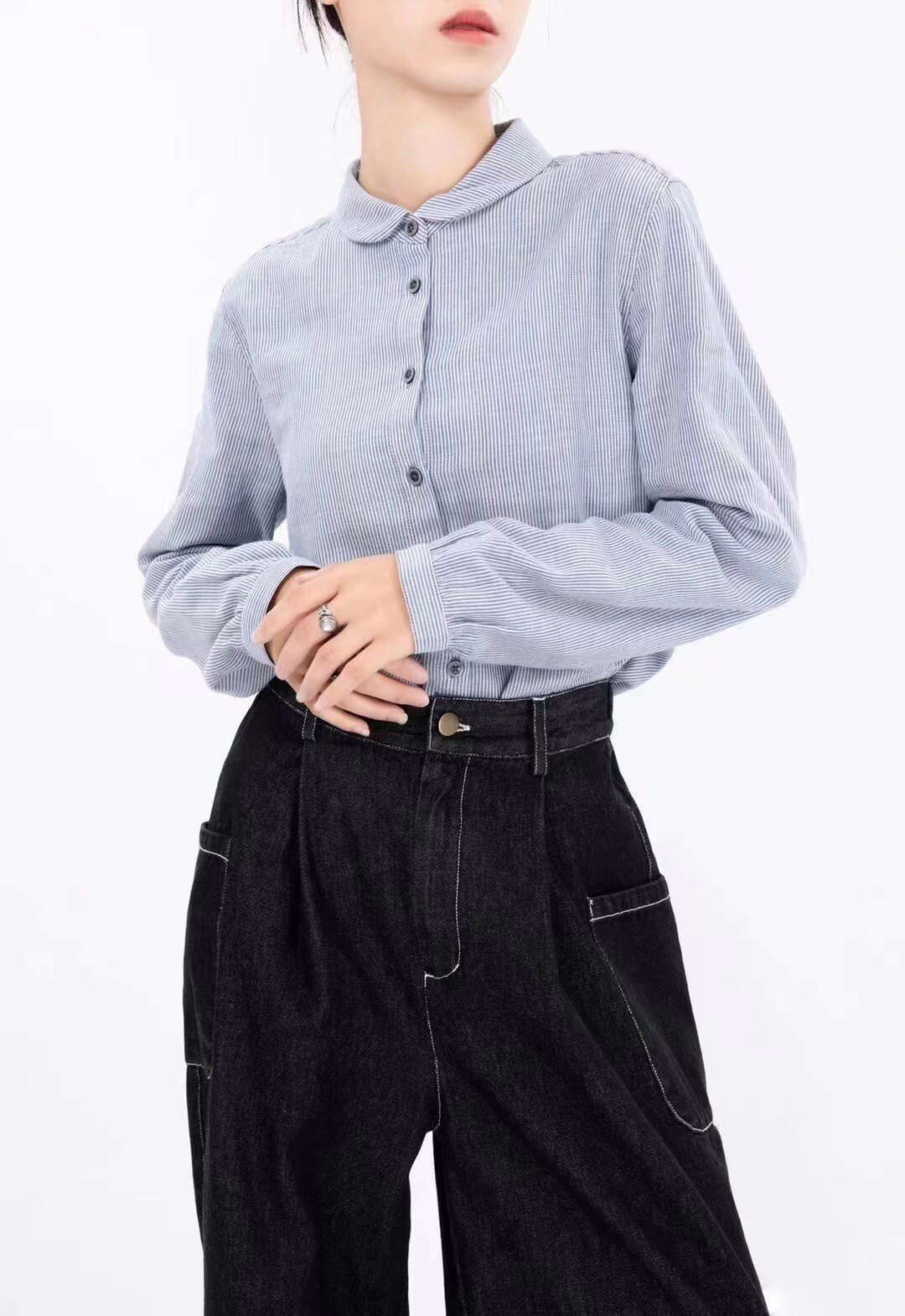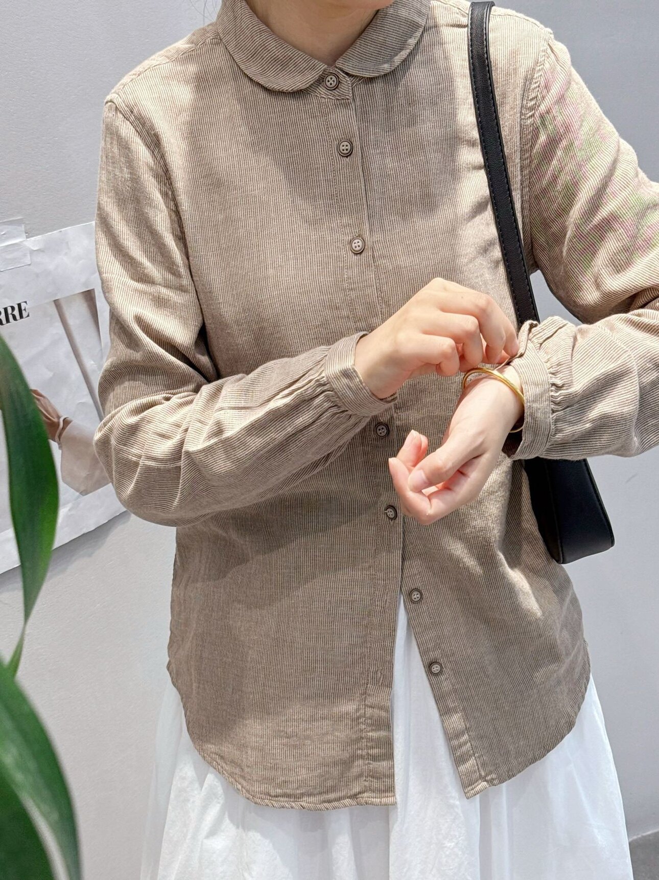 Japanese Order Autumn and Winter Simple Retro Mandarin Collar Doll Stripe Double-Layer Gauze Solid Color Women's Shirt Long-Sleeved Blouse