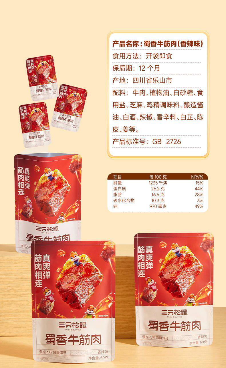 Three Squirrels Sichuan Spicy Beef Tendon Meat 60g, Thick-Cut Beef with Bone, Marinated Snack to Satisfy Cravings
