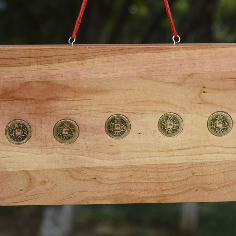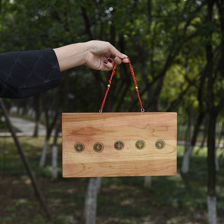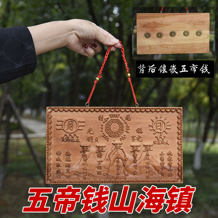 Peach Wood Carving Mountain and Sea Town Brand Bagua Mirror Pendant with Five Emperors Money House Decoration Ornaments Indoor and Outdoor Door to Door