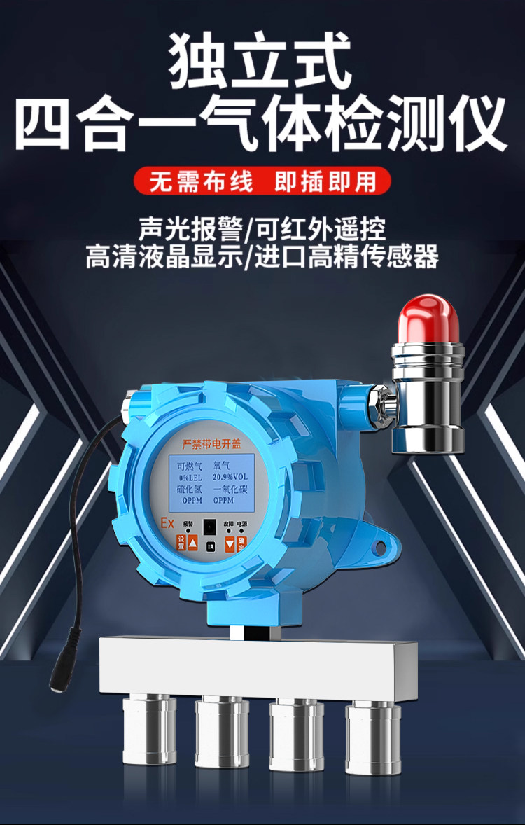 Fixed Four-In-One Gas Detector, Independent Combustible Oxygen, Hydrogen Sulfide, and Carbon Monoxide Concentration Alarm