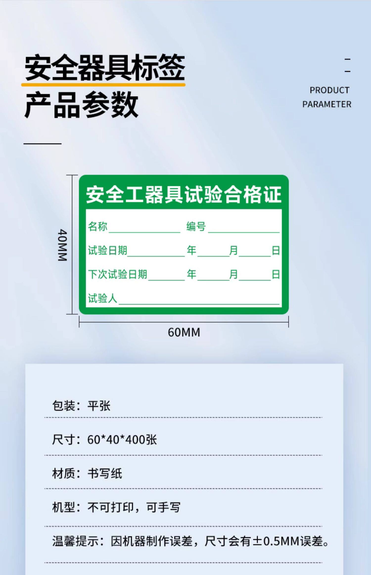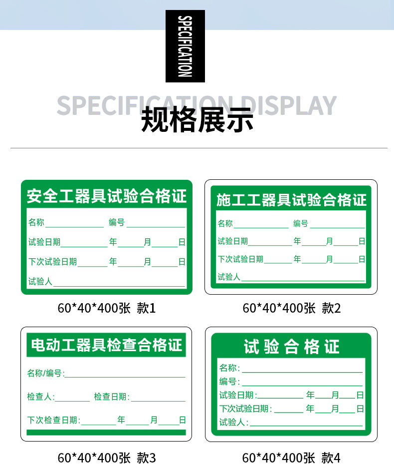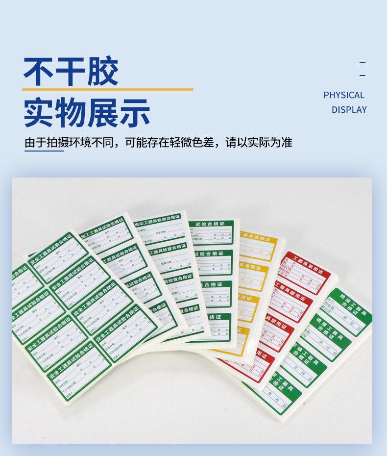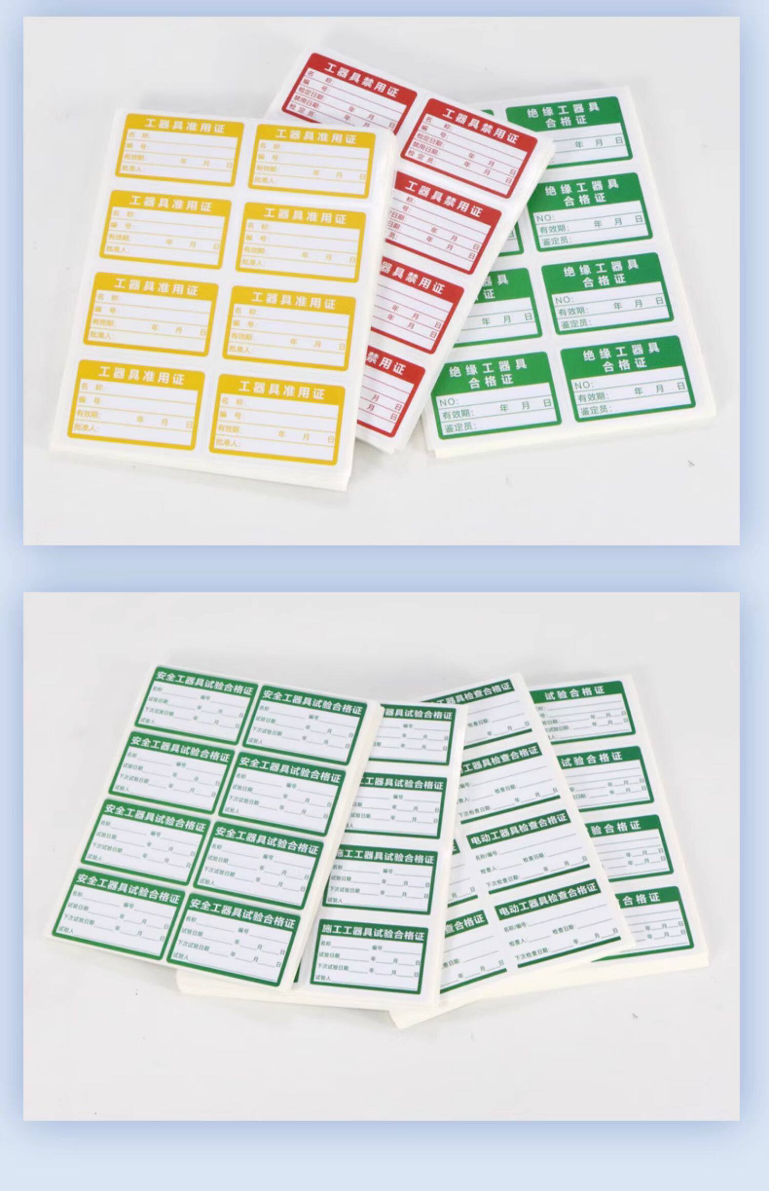 Sort by color 01 (400 stickers per piece) Safety Equipment Test Certificate 60*40 (writing paper),02 (1 piece 400 stickers) Construction tool equipment test certificate 60*40 (writing paper),03 (1 piece 400 stickers) Inspection Certificate of Electric Power Tools 60*40 (writing paper),04 (1 piece 400 stickers) test certificate 60*40 (writing paper),05 (1 piece 400 stickers) Tools Permit 60*40 (writing paper),06 (1 piece 400 stickers) Tool Prohibition Certificate 60*40 (writing paper),07 (1 piece 400 stickers) Insulation tools certificate 60*40 (writing paper),Support customization/photograph and send three random labels