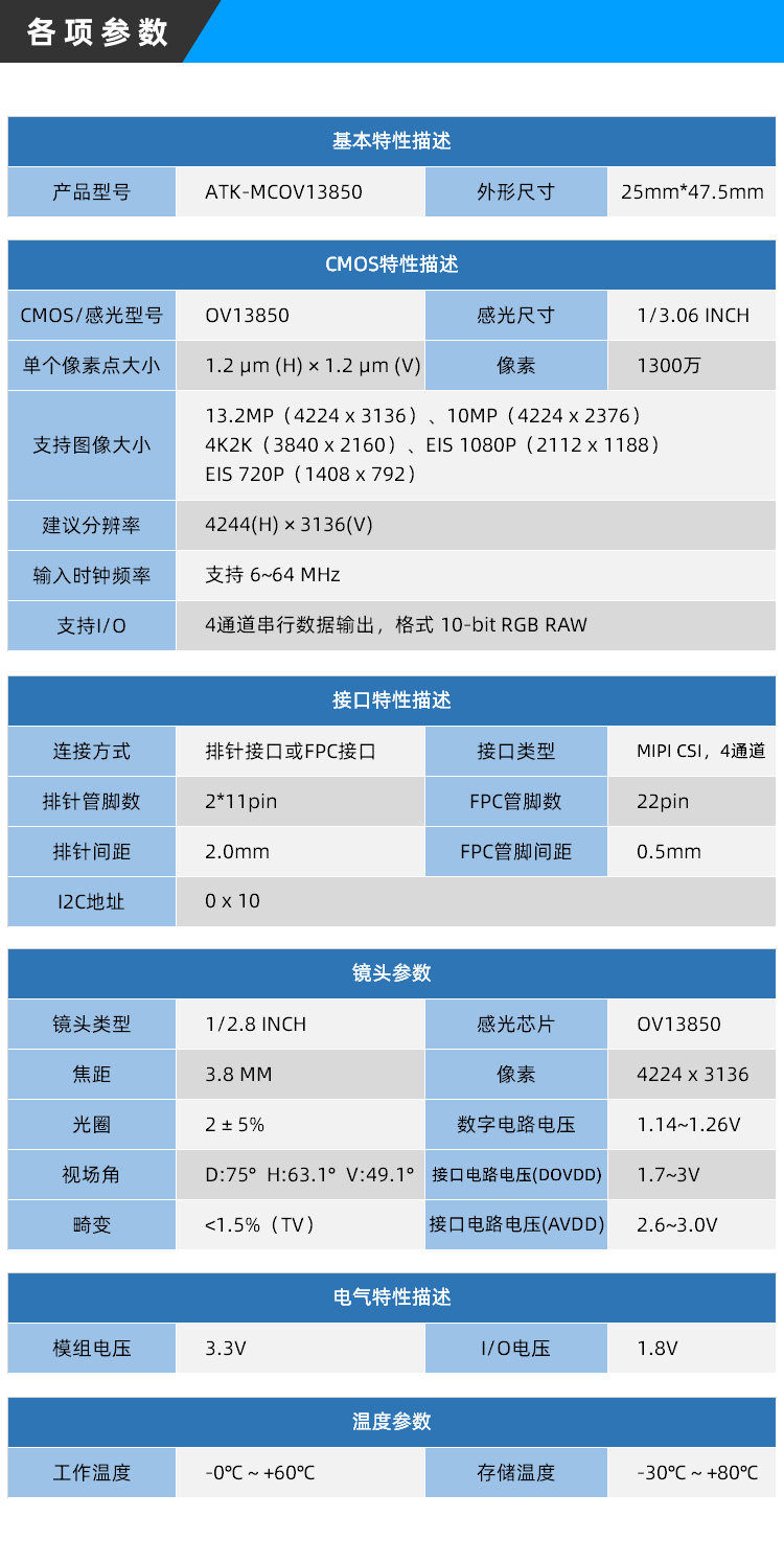Zhengdian Atomic Mipi Camera Atk-Mcov13850 1300W Pixels 13.2Mp (4224×3136)