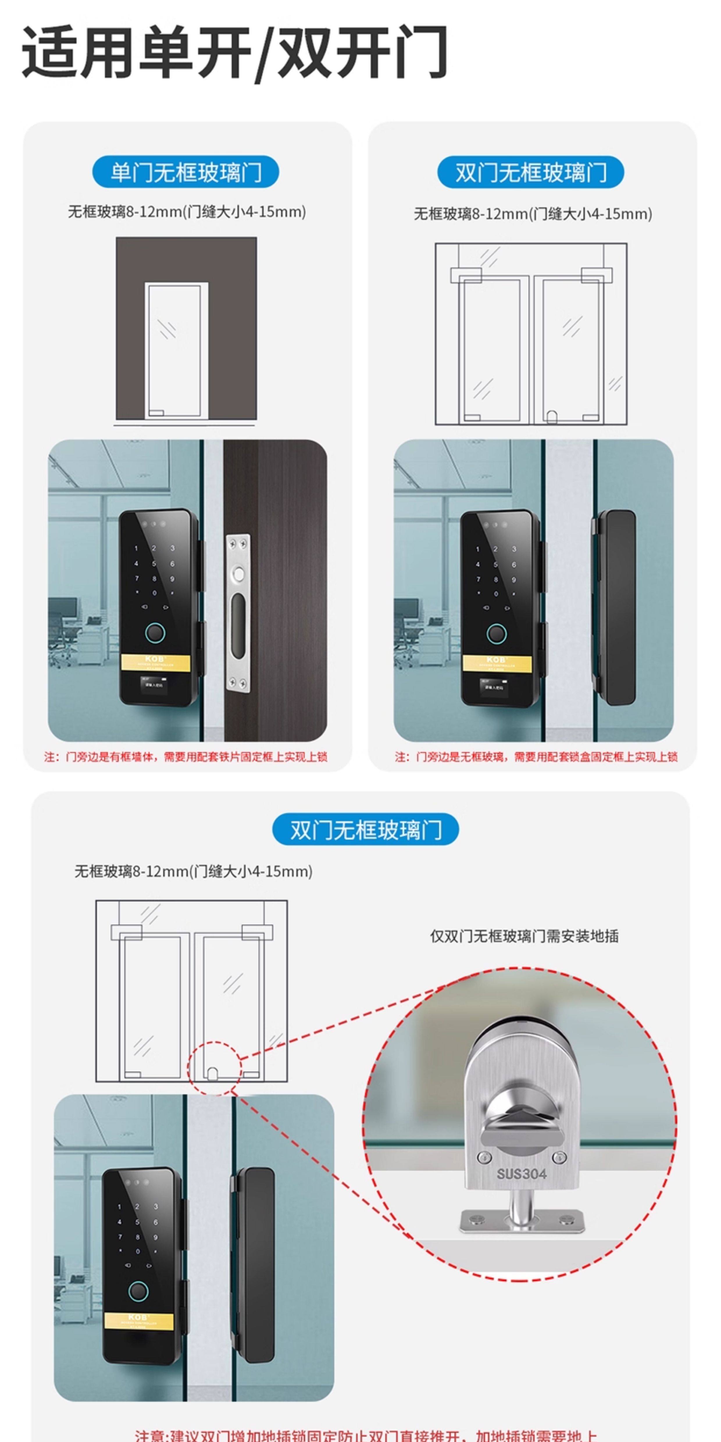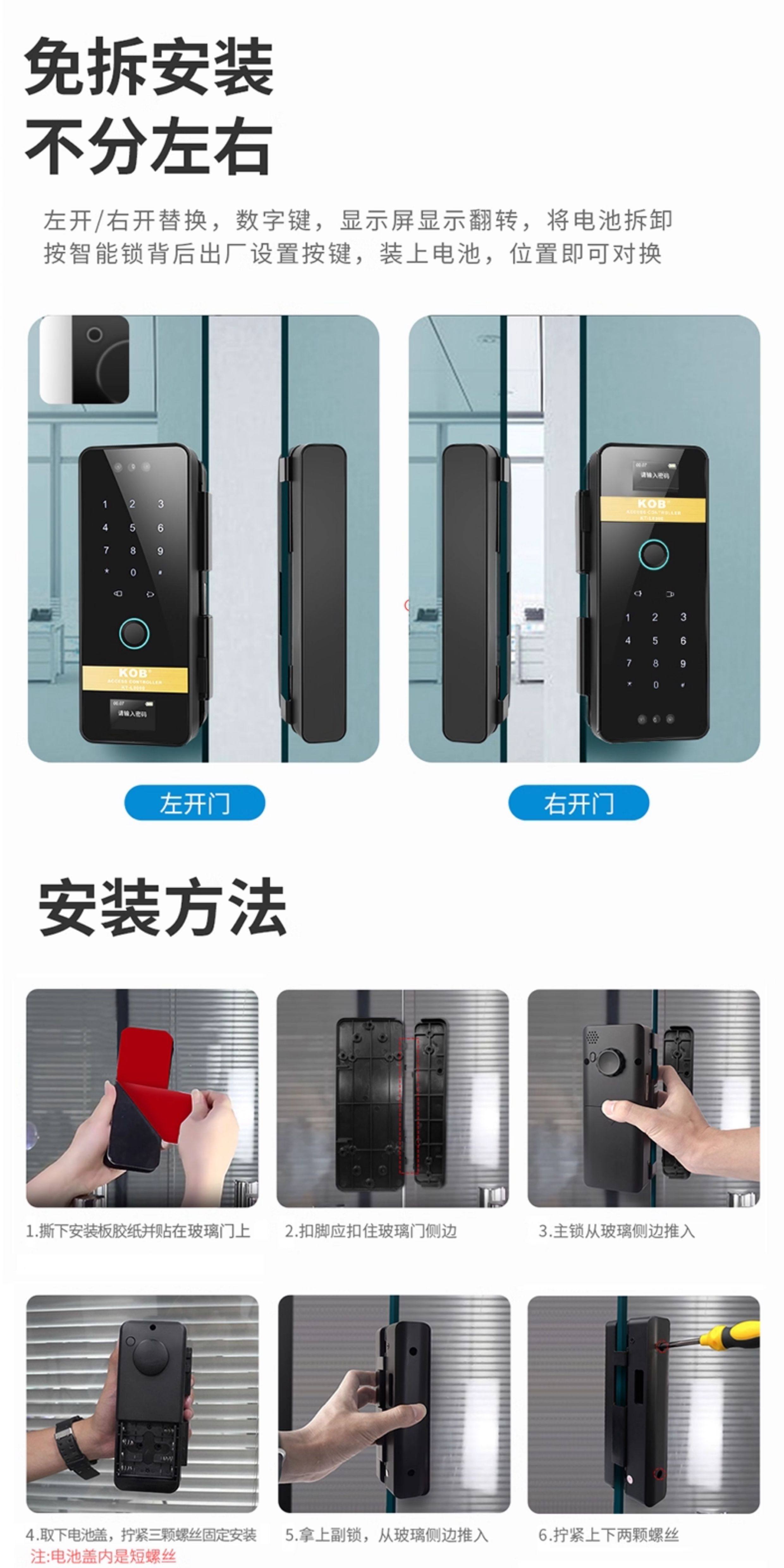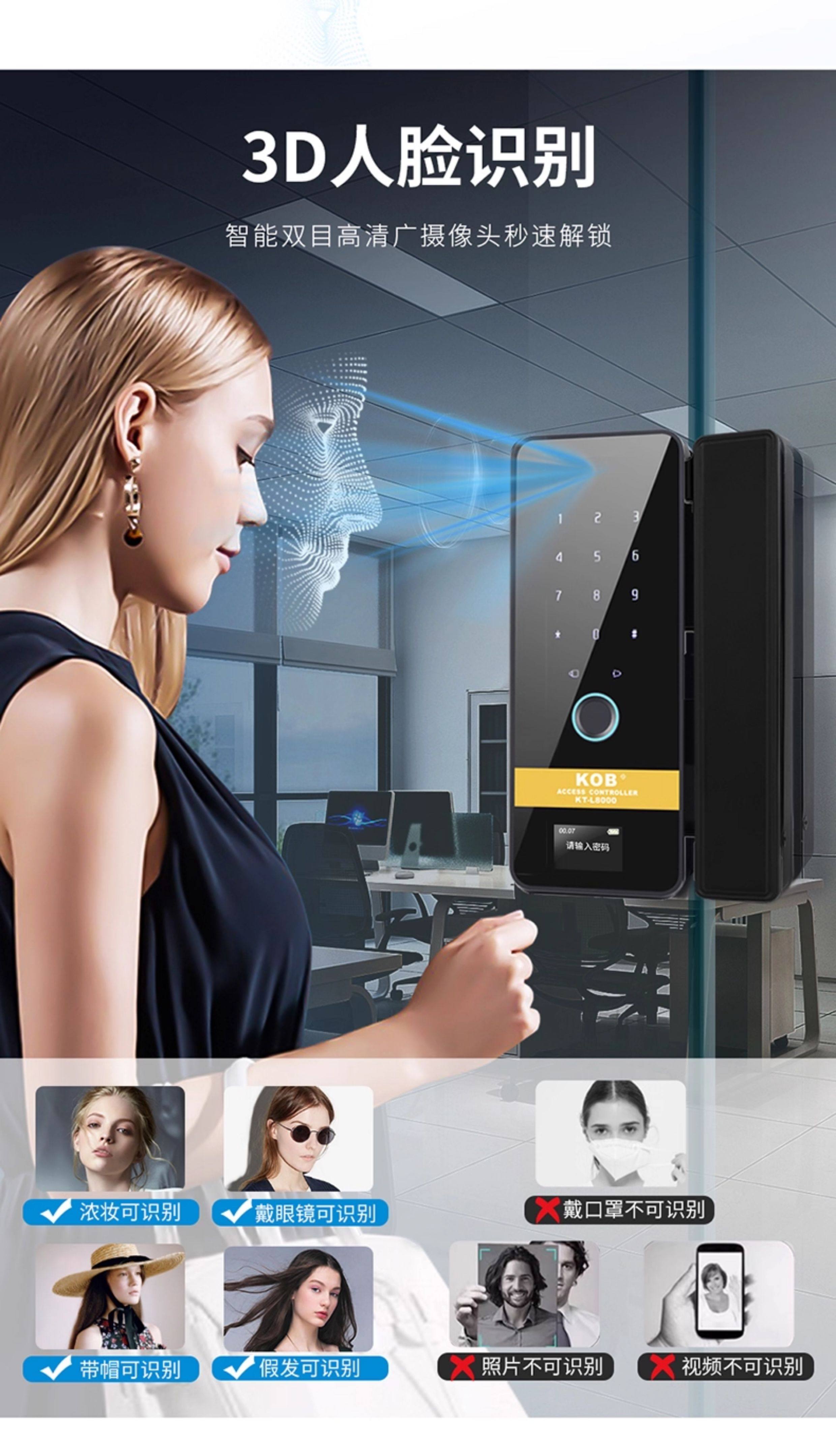 Glass Door Fingerprint Lock, Face Recognition Smart Lock, No-Drill Installation, Framed or Frameless, Single or Double Door, Office Password Lock
