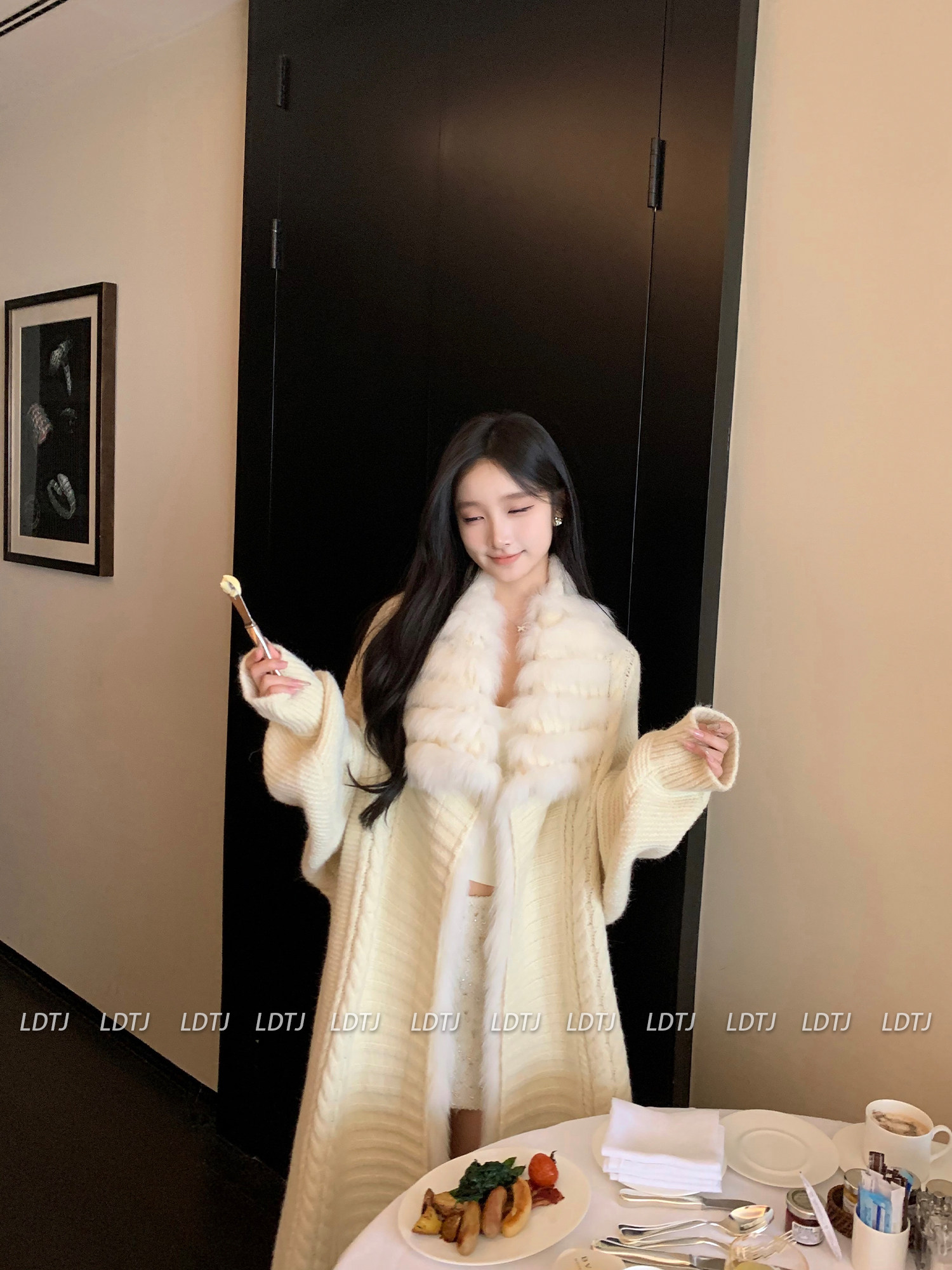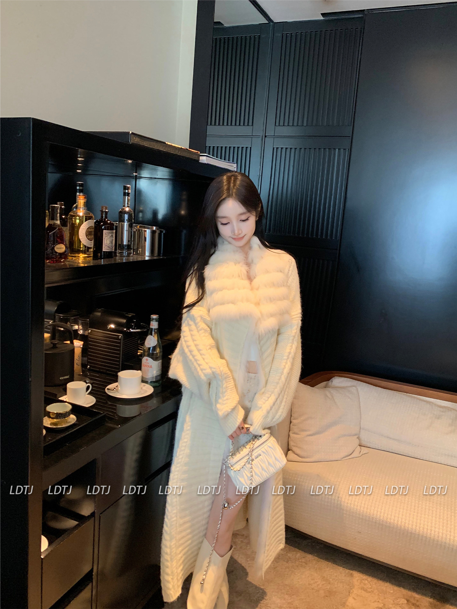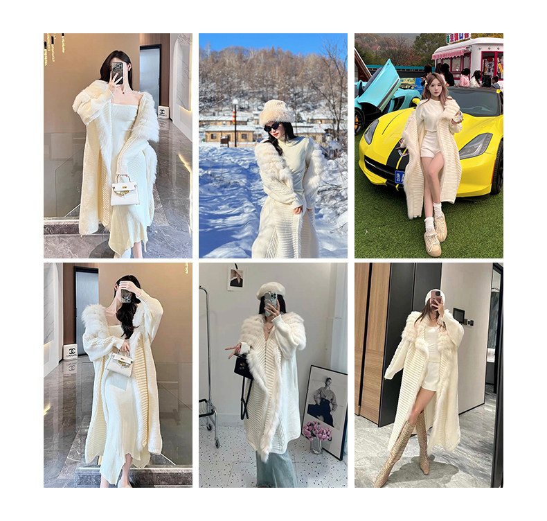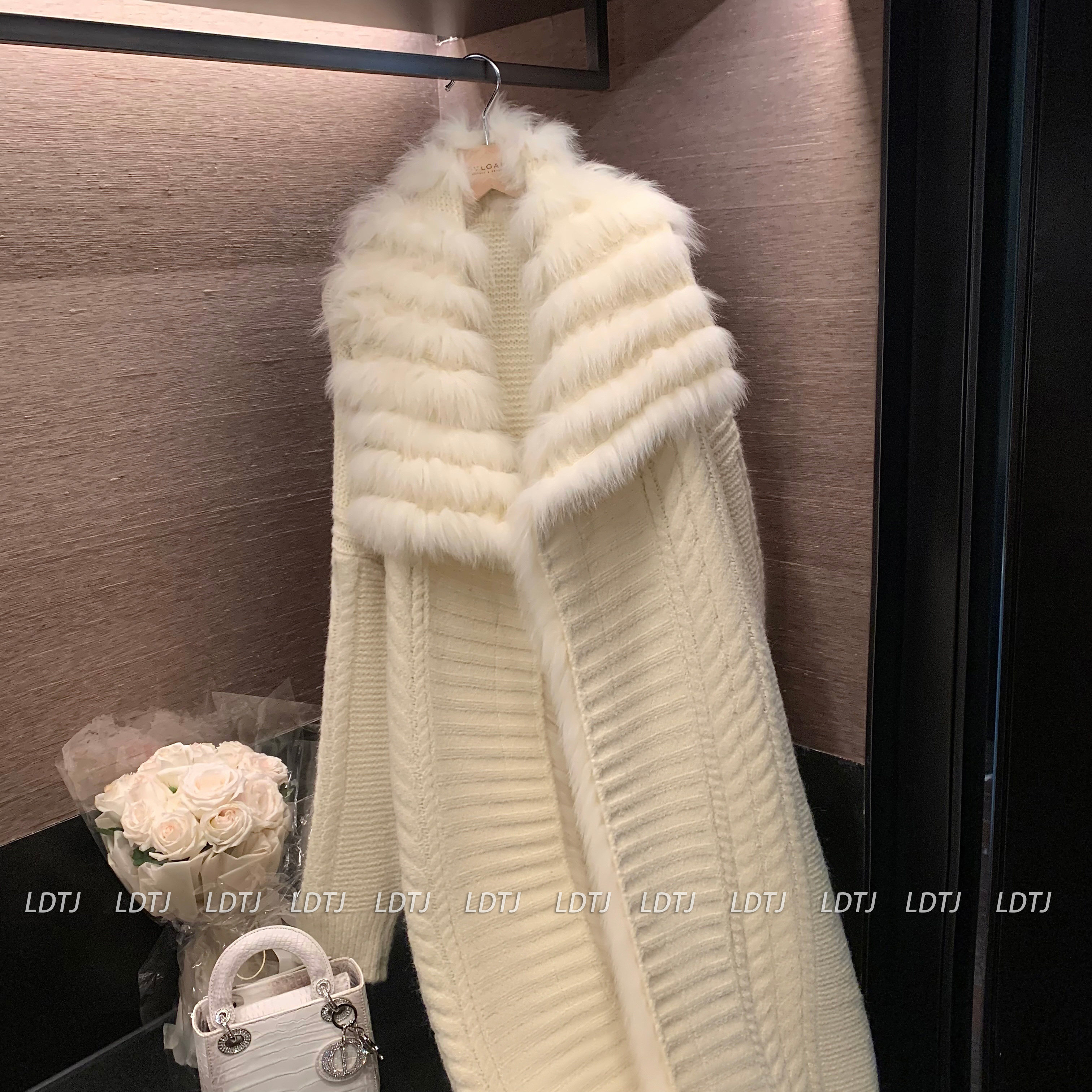 Ldtj High-End Knit Sweater Autumn Ladylike Lazy Style Fox Fur Collar Patchwork Mid-Length Wool Coat for Women