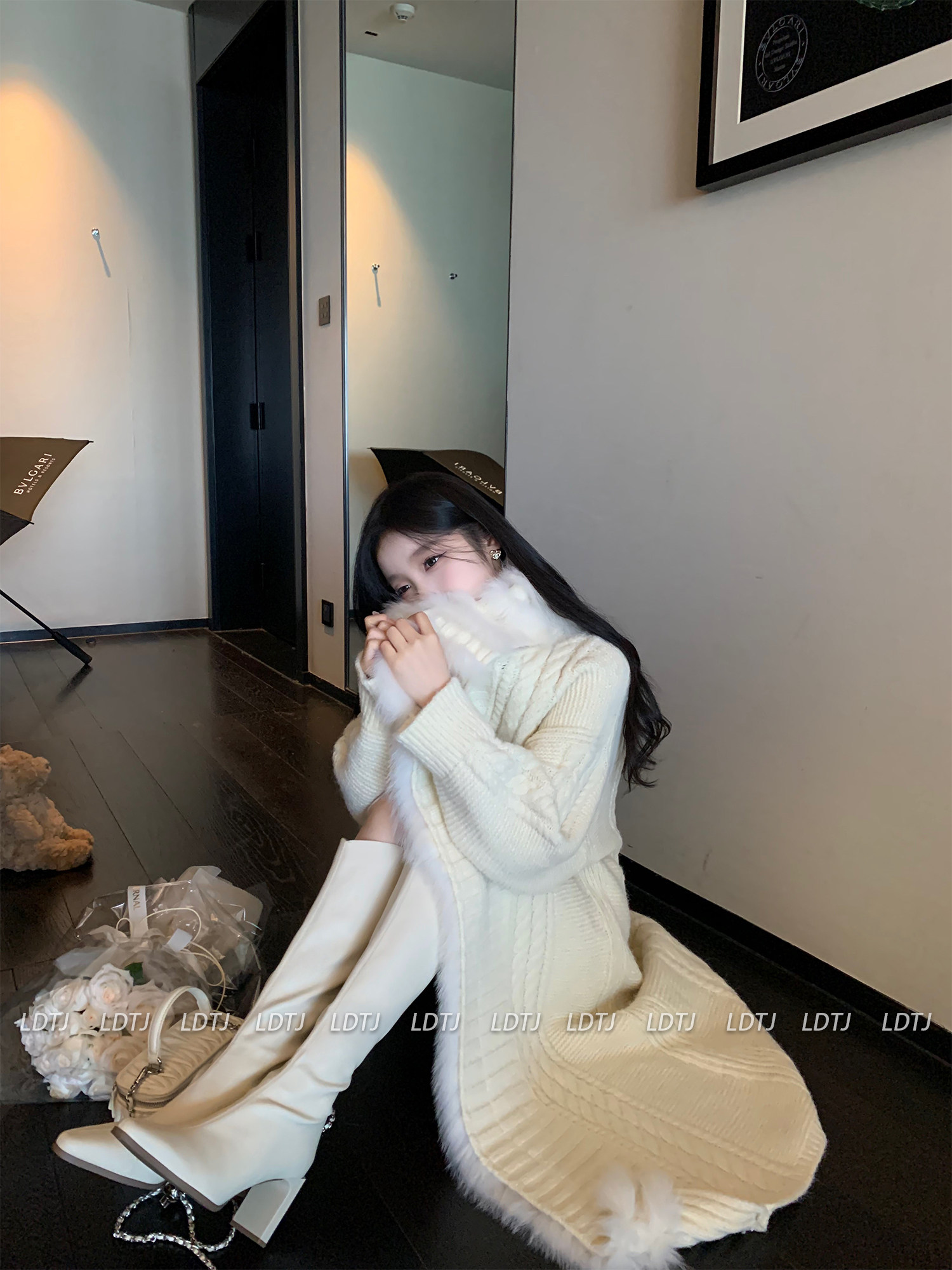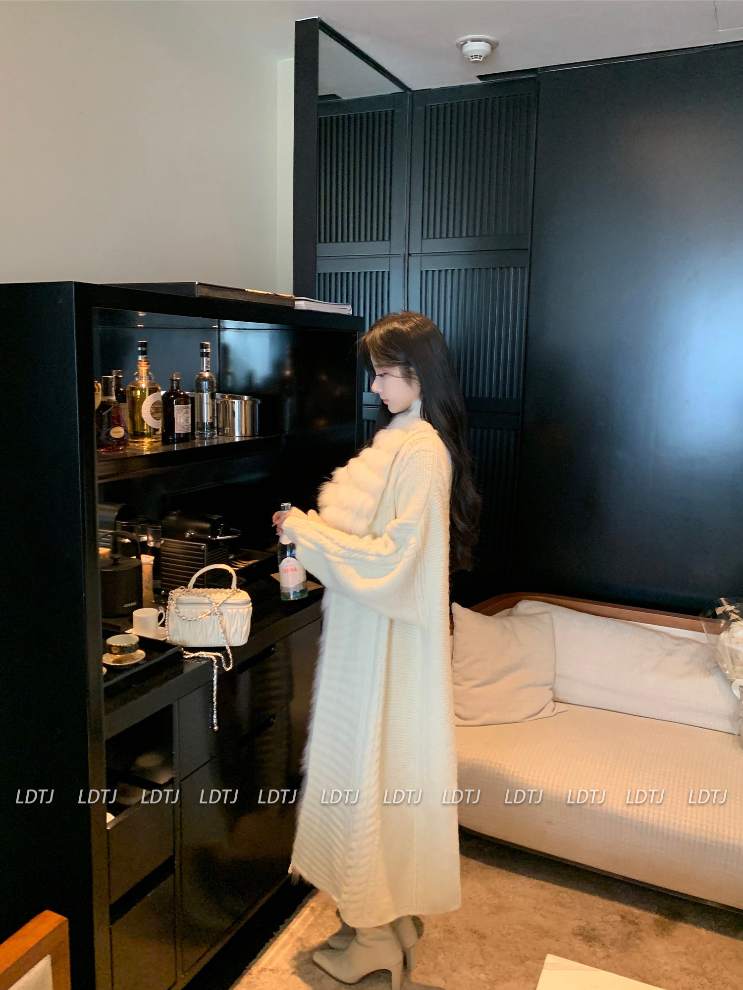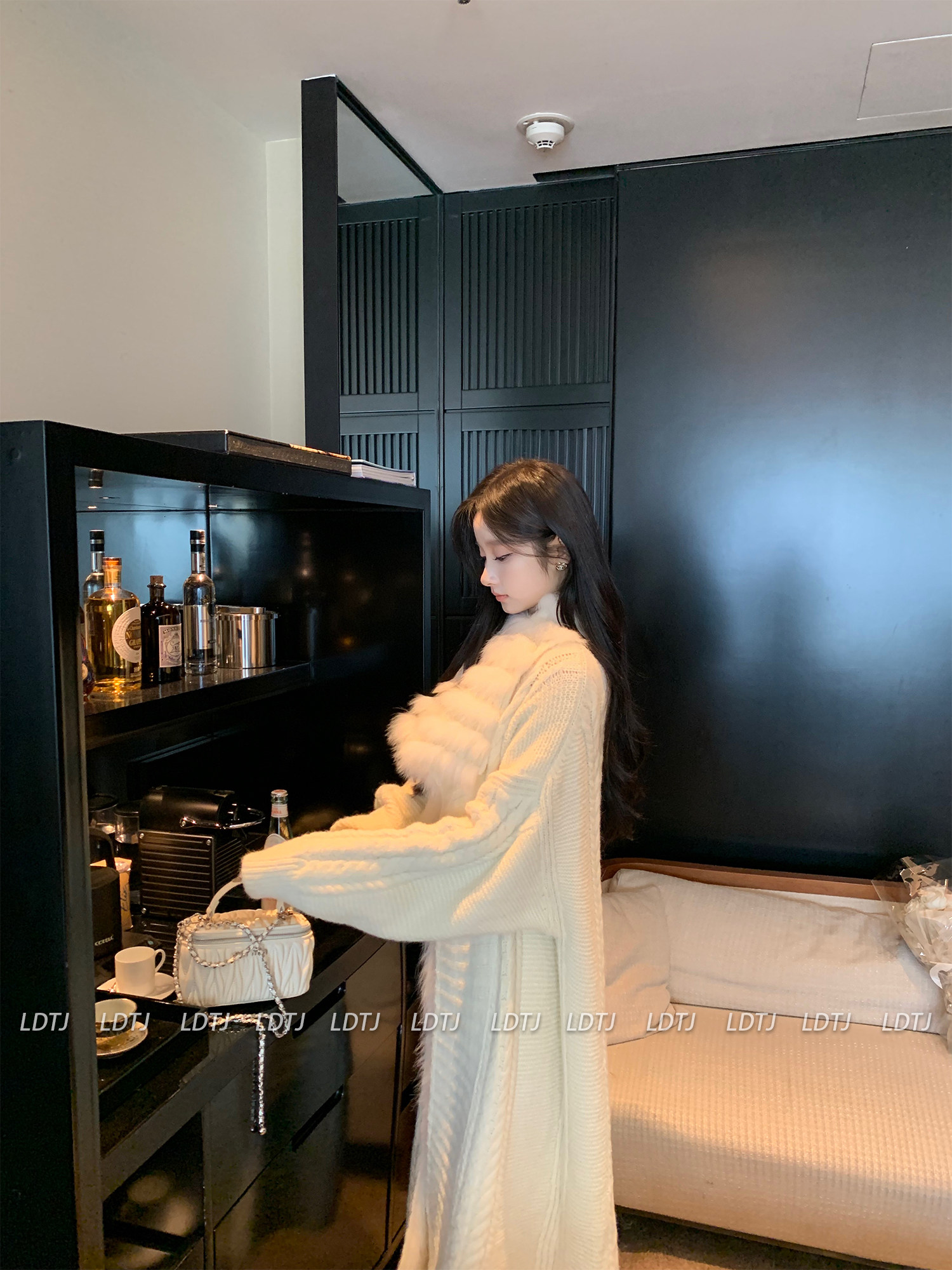 Ldtj High-End Knit Sweater Autumn Ladylike Lazy Style Fox Fur Collar Patchwork Mid-Length Wool Coat for Women
