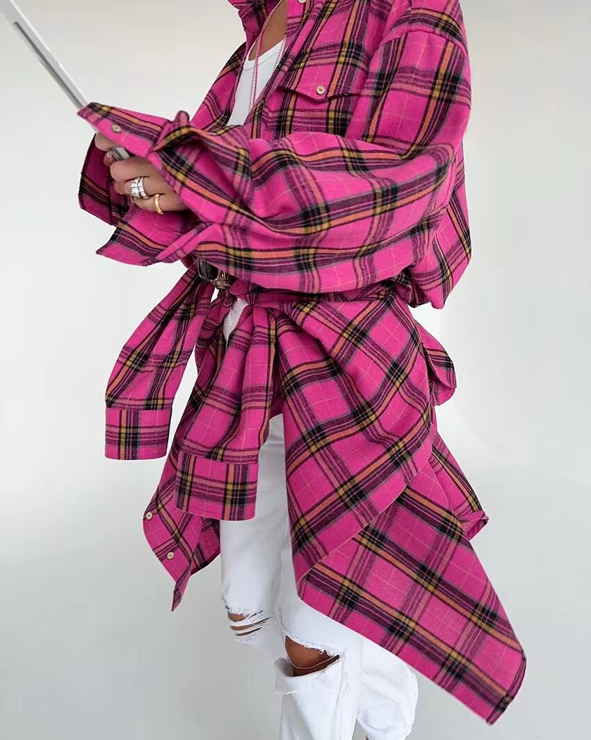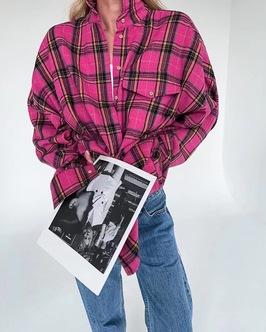 European and American Style Fashion Loose-Fitting Rose Red Plaid Long-Sleeved Shirt