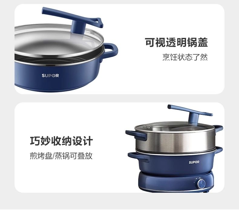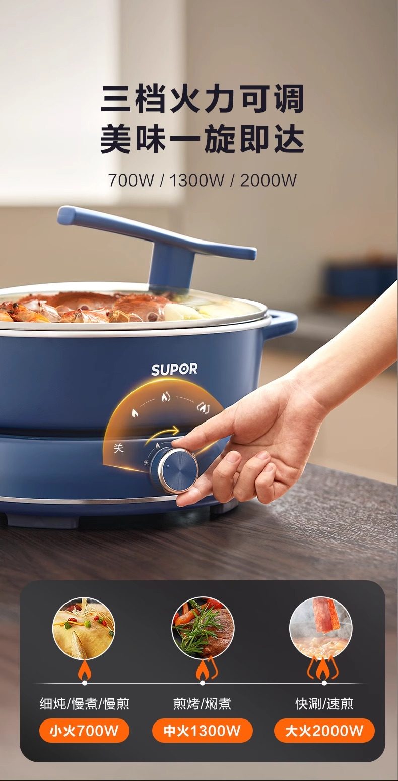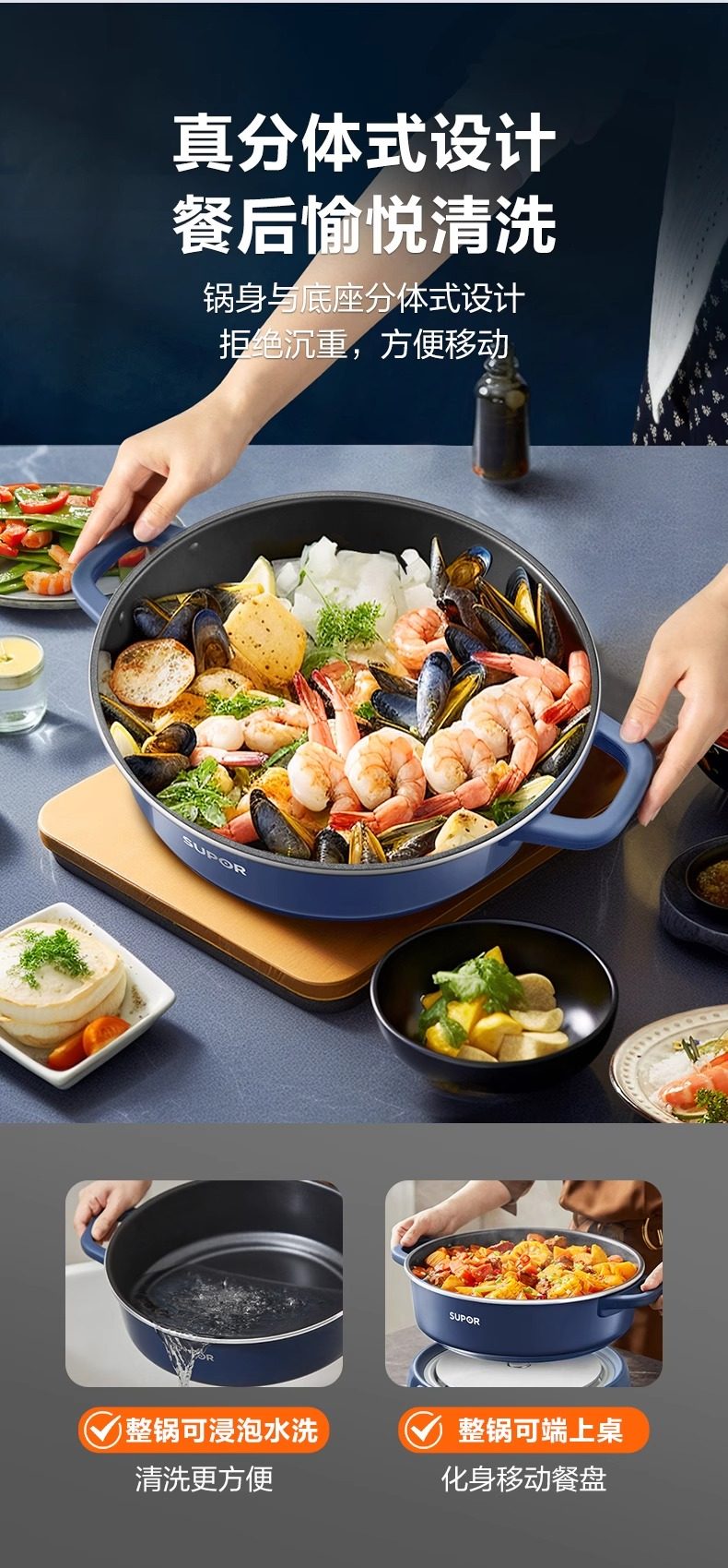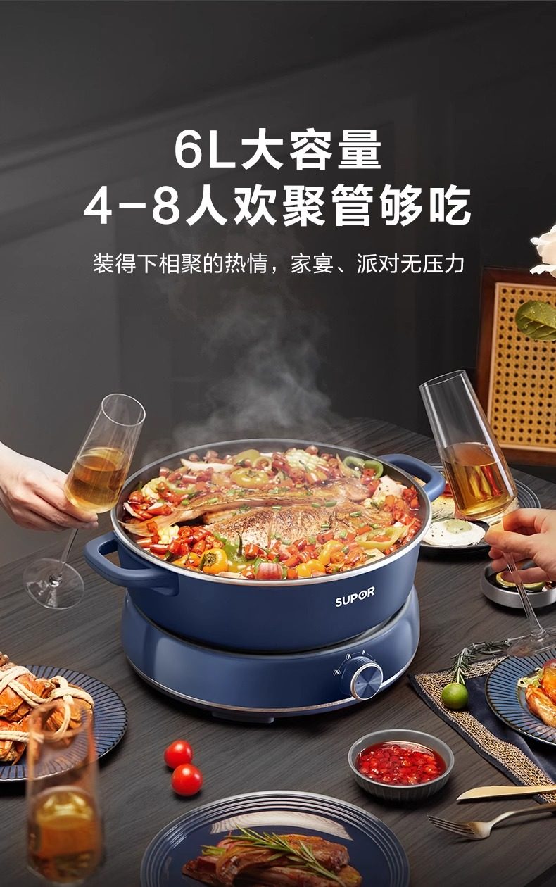 Supor Electric Hot Pot for Home Use, Detachable Multifunctional Electric Hot Pot, Electric Frying Pan, Electric Steamer, 6L