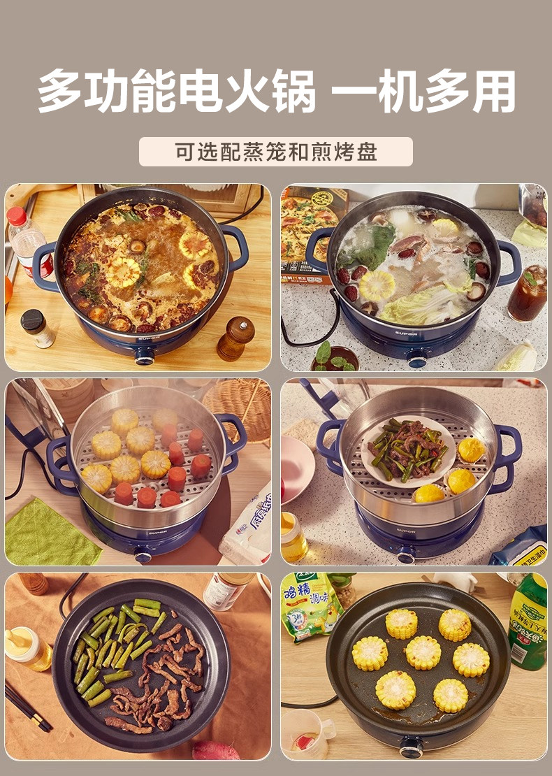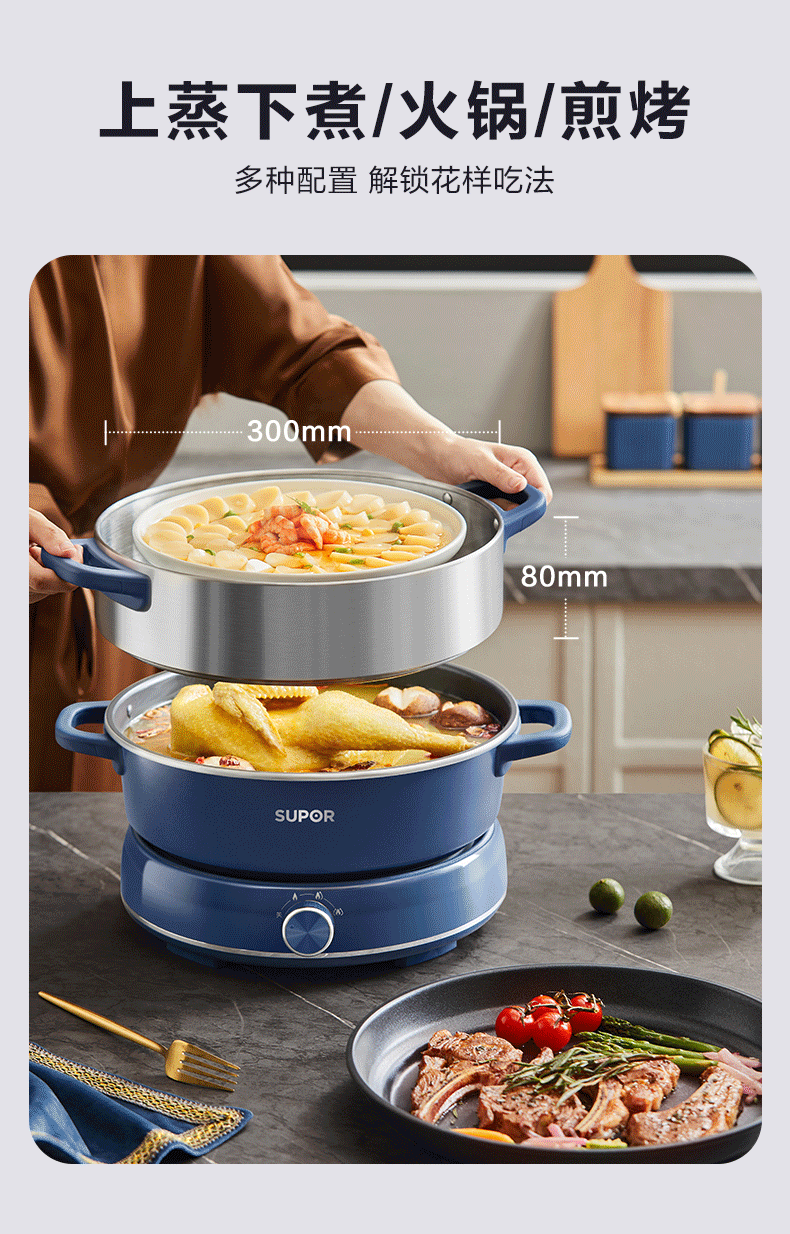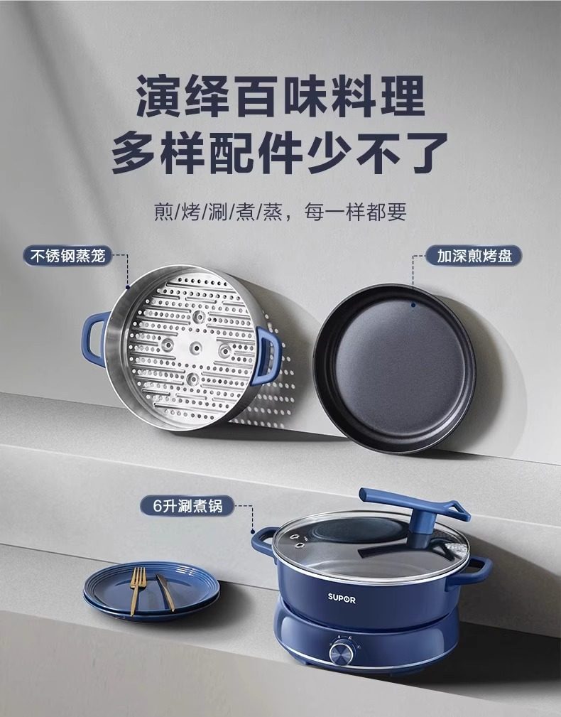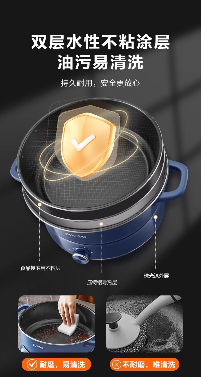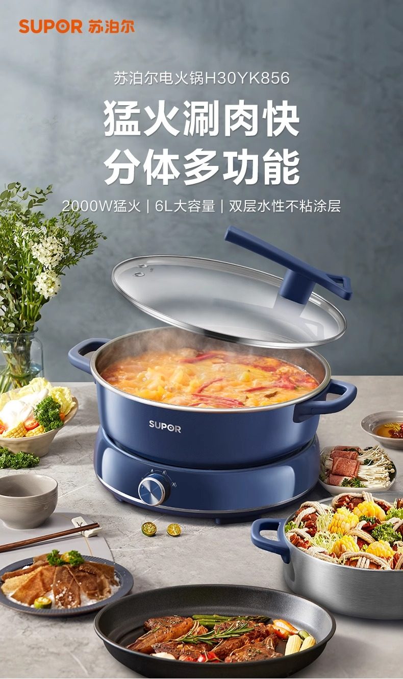 Supor Electric Hot Pot for Home Use, Detachable Multifunctional Electric Hot Pot, Electric Frying Pan, Electric Steamer, 6L