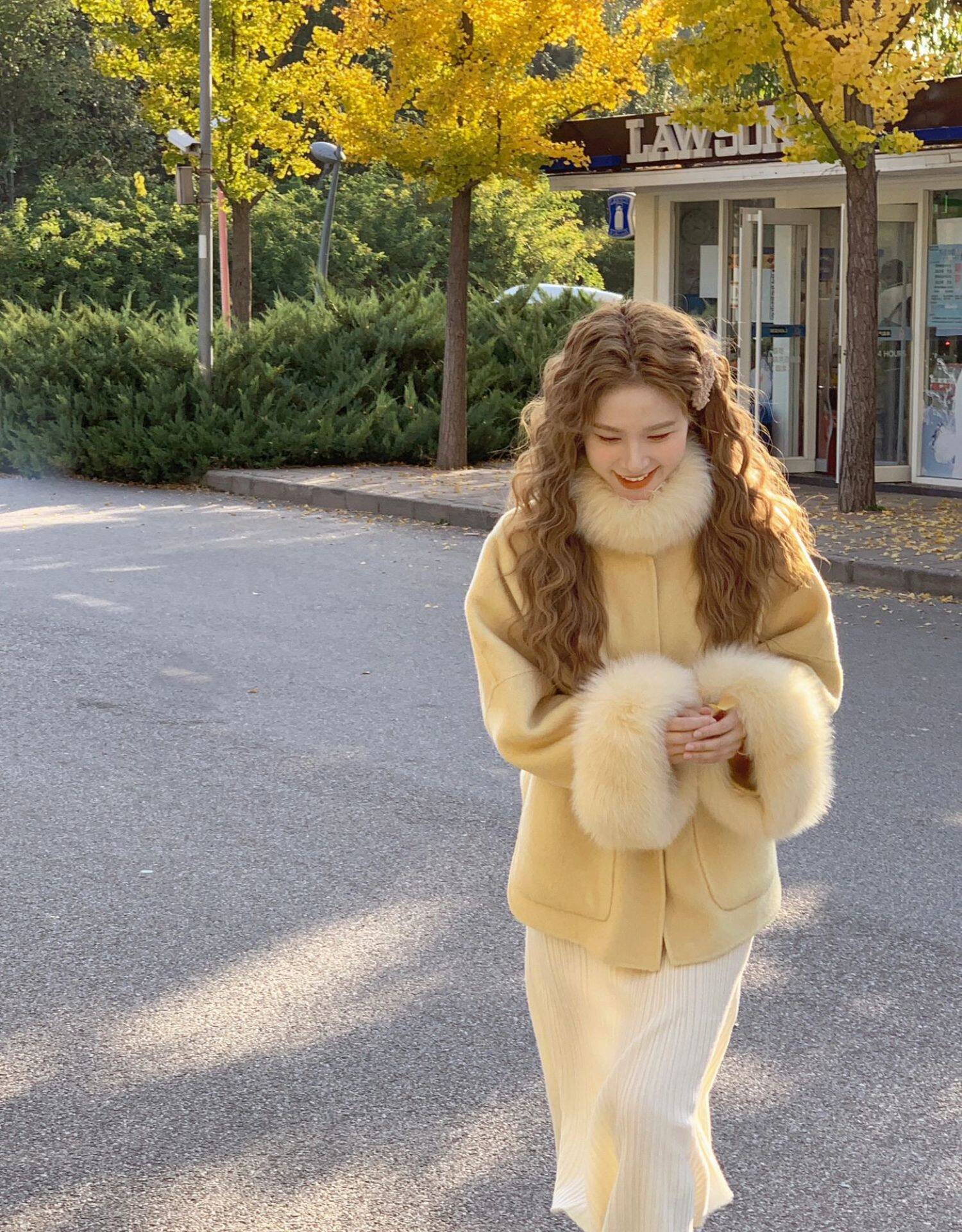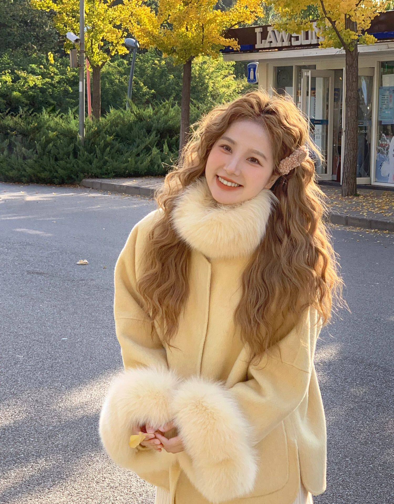 Creamy yellow short woolen cuffs and fur collar woolen coat for women, autumn and winter style, gentle and loose woolen cape coat