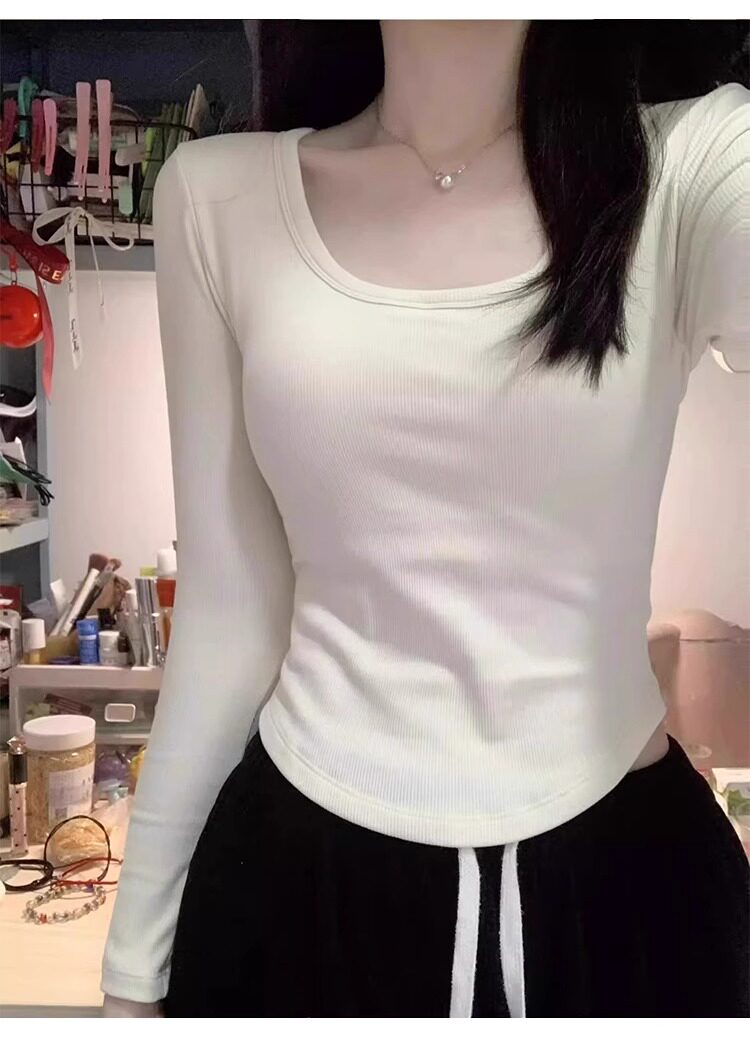 Chic Waist-Cinching Short Square-Neck T-Shirt for Women, Regular Shoulder Long-Sleeve Base Shirt, Brushed for Warmth, Curved Hem Slim-Fit Top