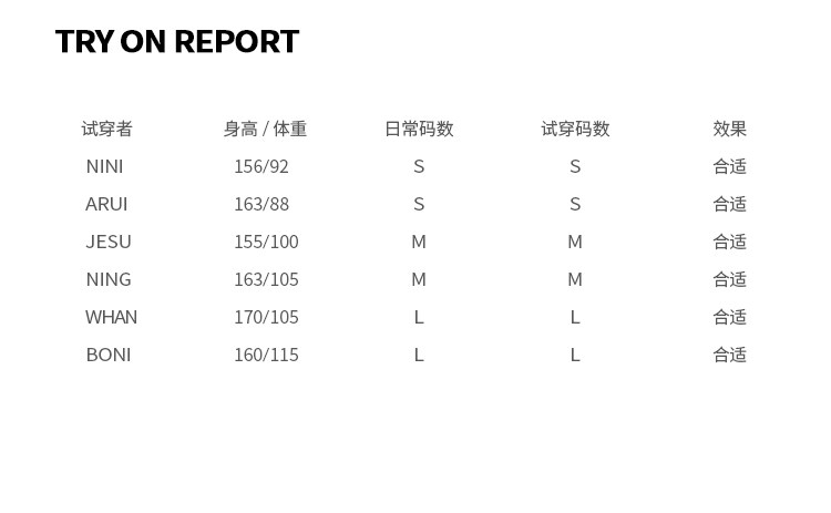 China (cm) 160-165/84-86 165-170 / 88-90 167-172 / 92-96 168-173 / 98-102 170-176 / 106-110