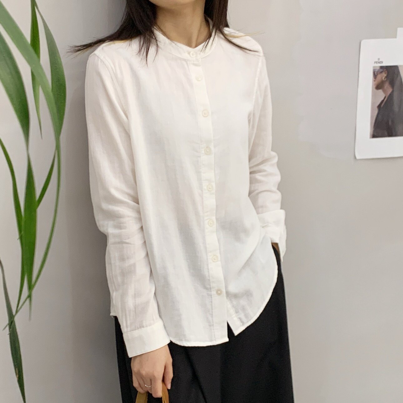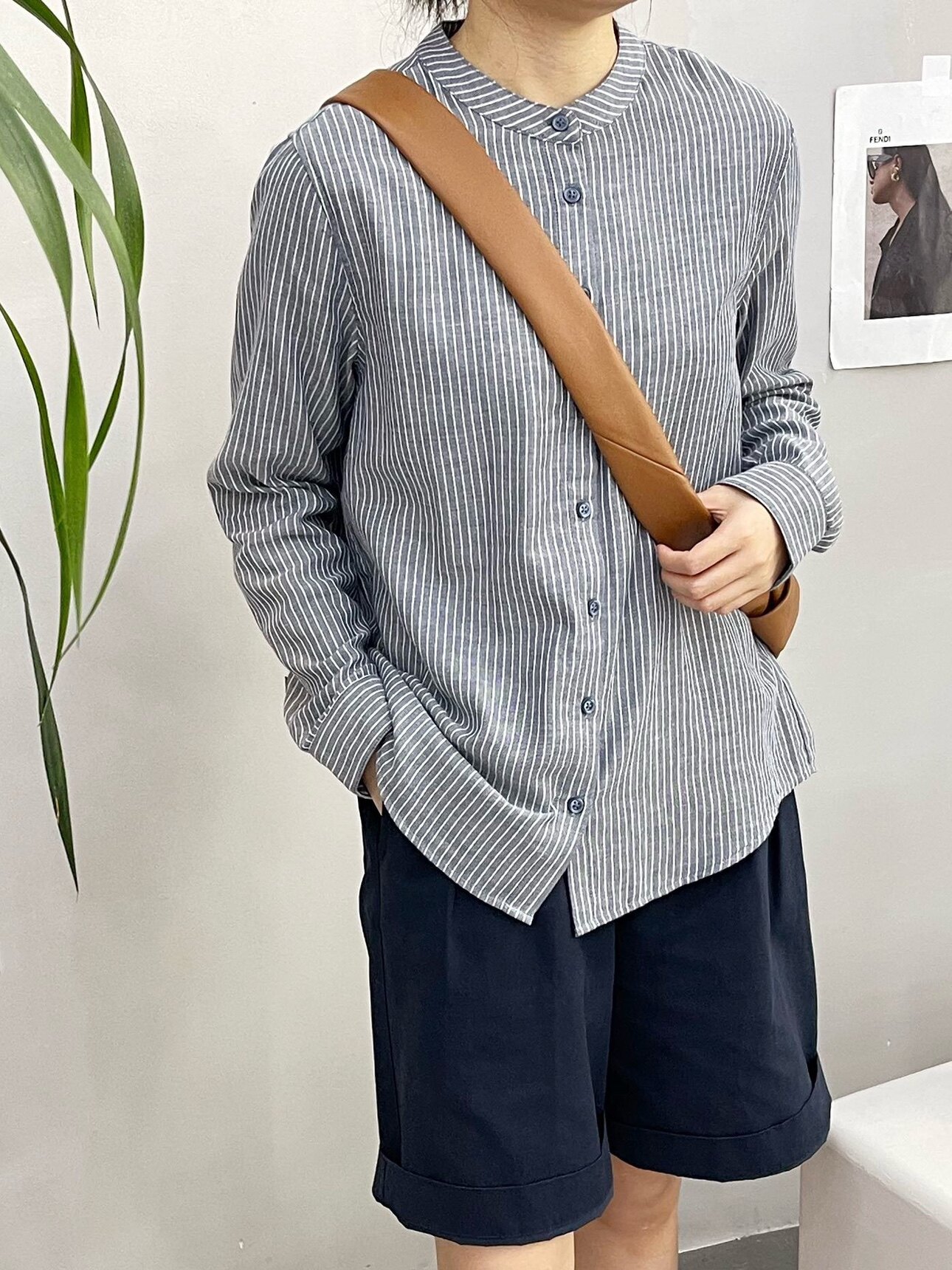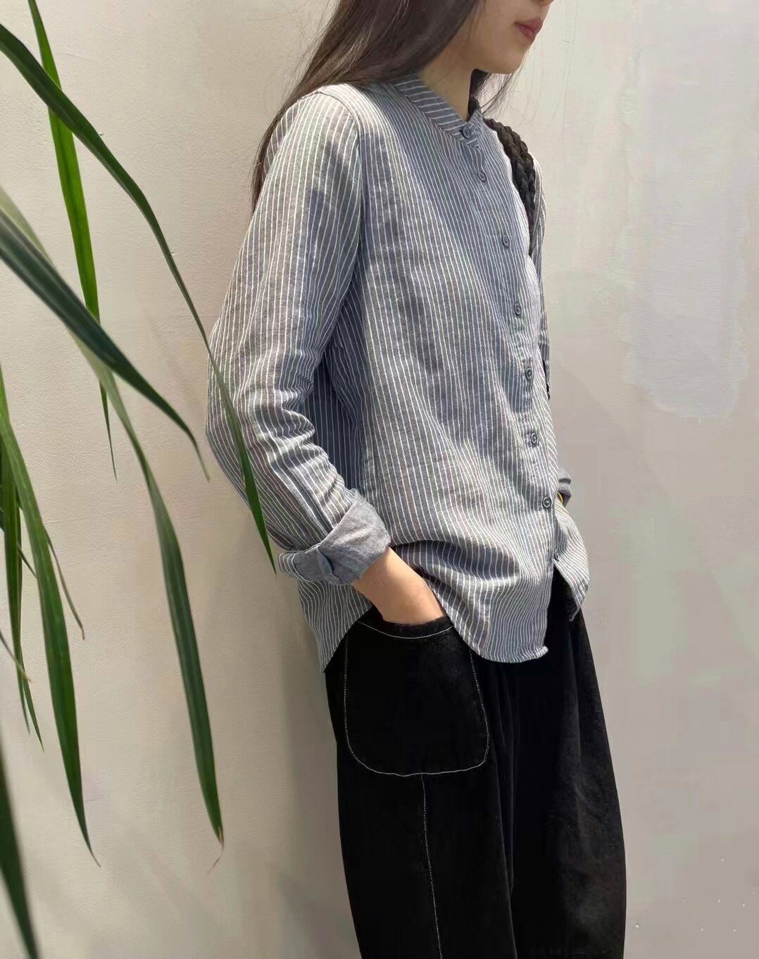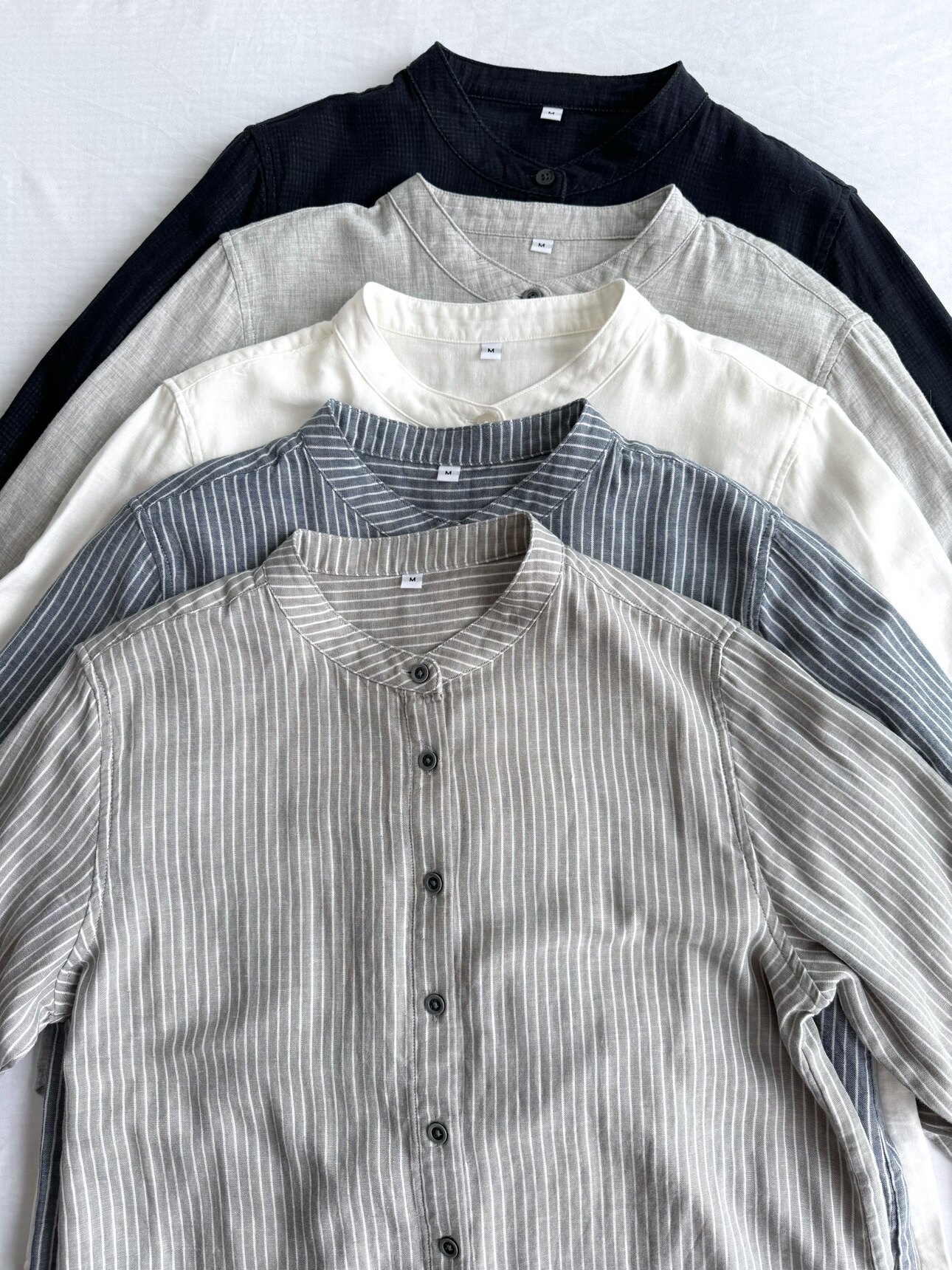 Japanese Order Spring and Autumn New Product Simple Retro Collarless Striped Double-Layer Gauze Solid Color Women's Shirt Long-Sleeved Blouse
