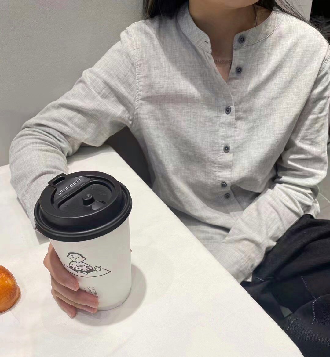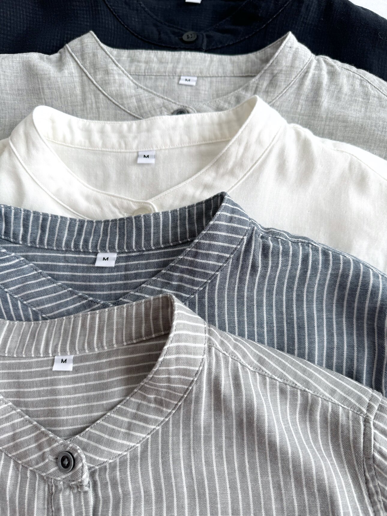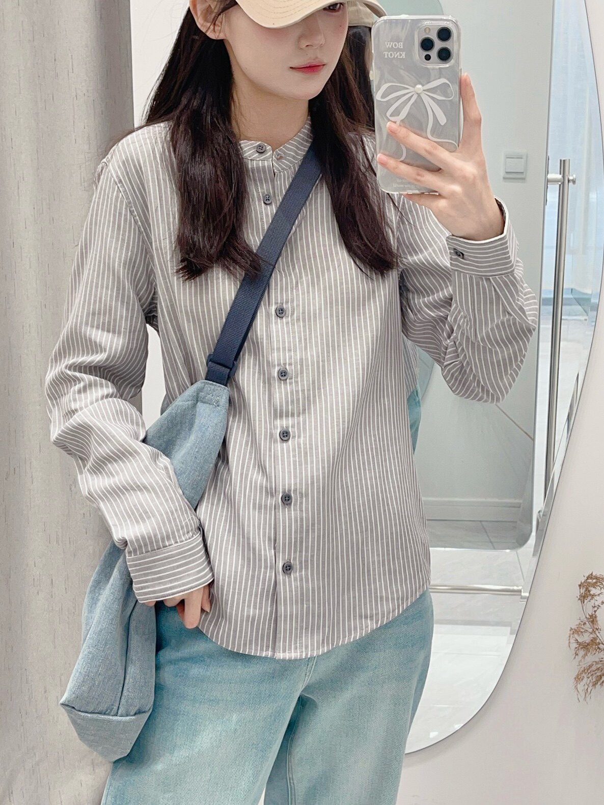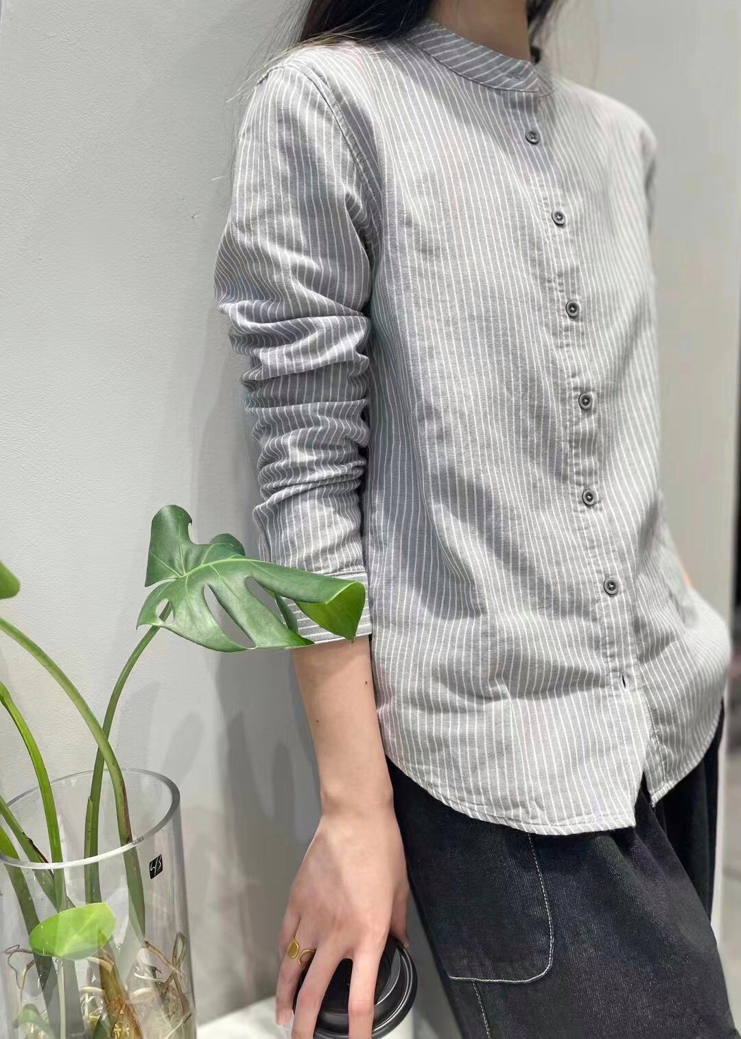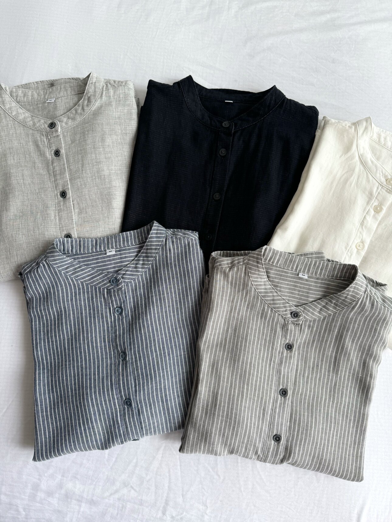 Japanese Order Spring and Autumn New Product Simple Retro Collarless Striped Double-Layer Gauze Solid Color Women's Shirt Long-Sleeved Blouse