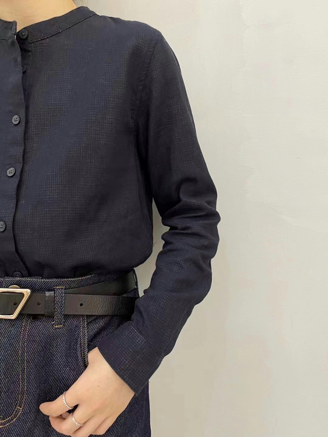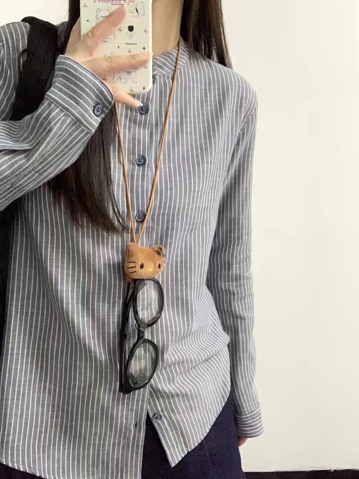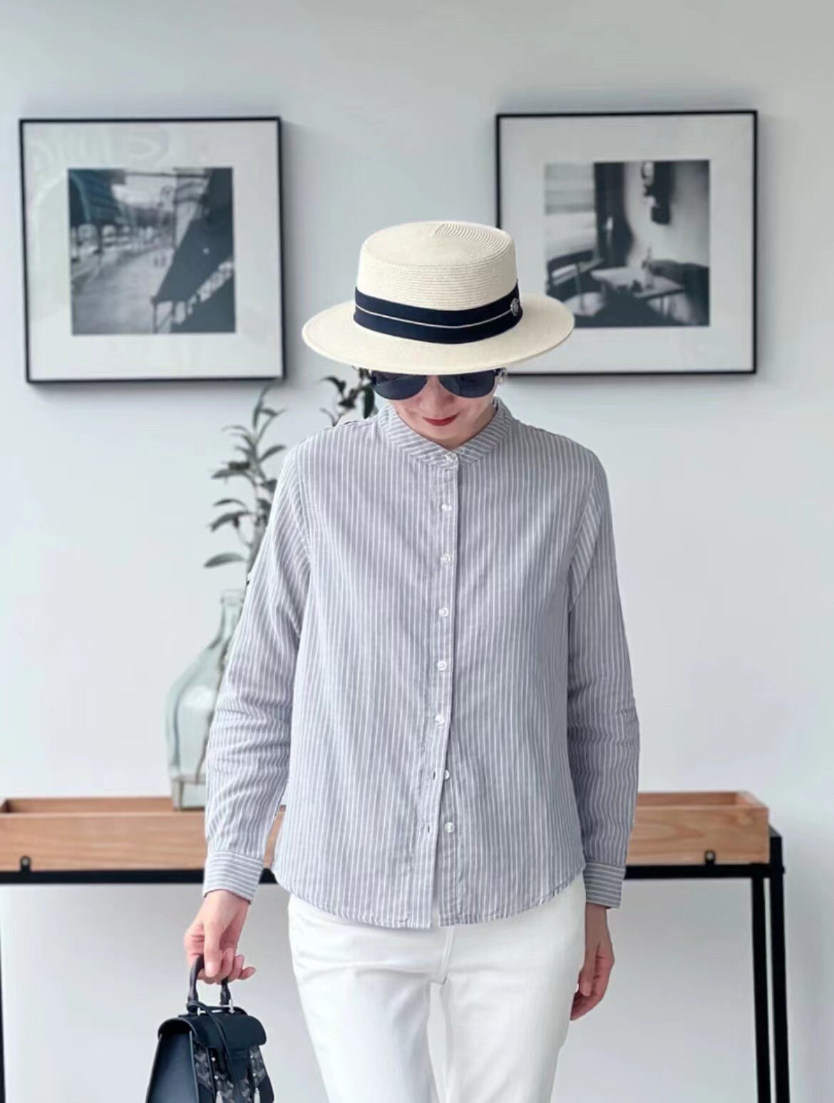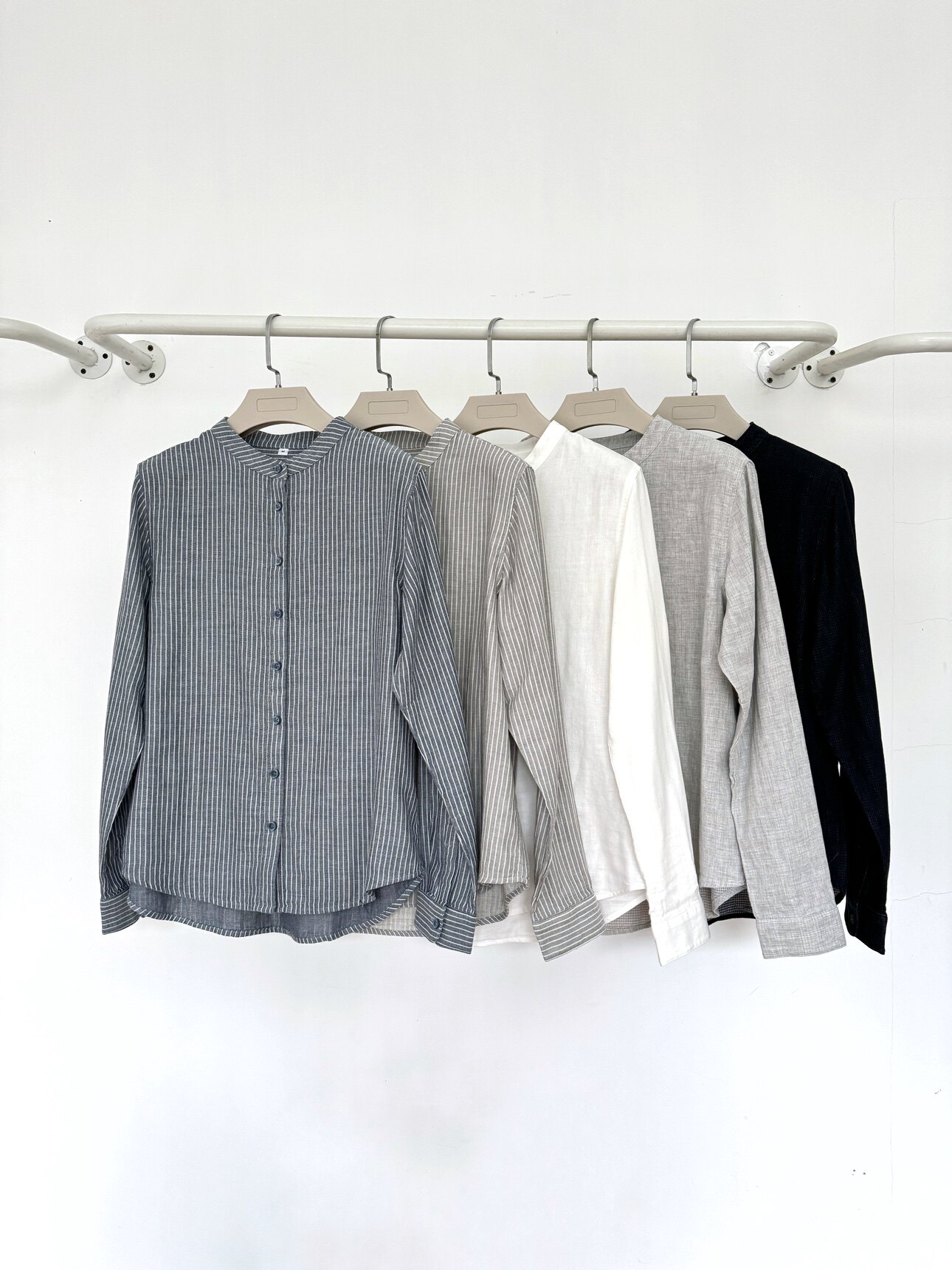 Japanese Order Spring and Autumn New Product Simple Retro Collarless Striped Double-Layer Gauze Solid Color Women's Shirt Long-Sleeved Blouse