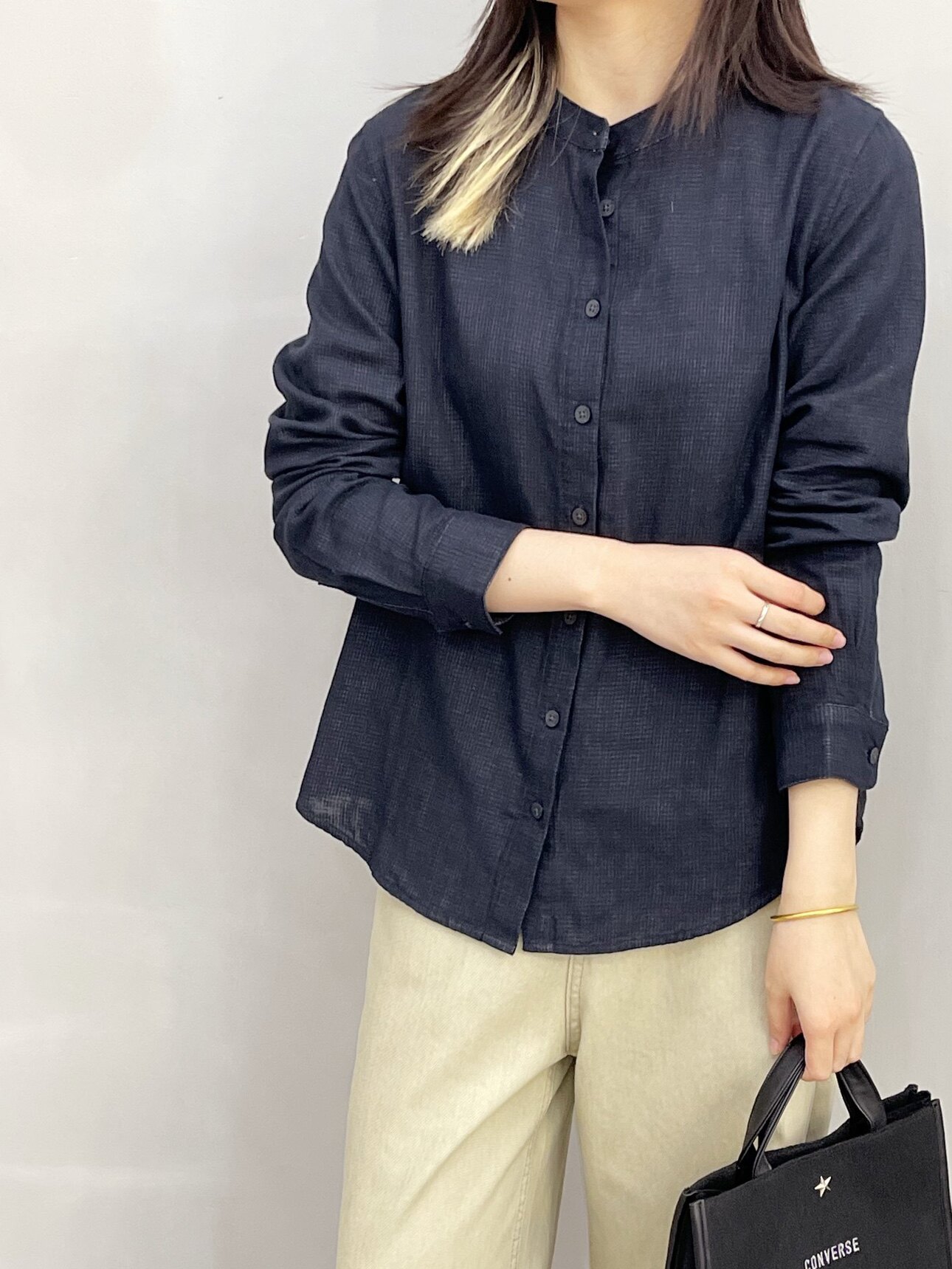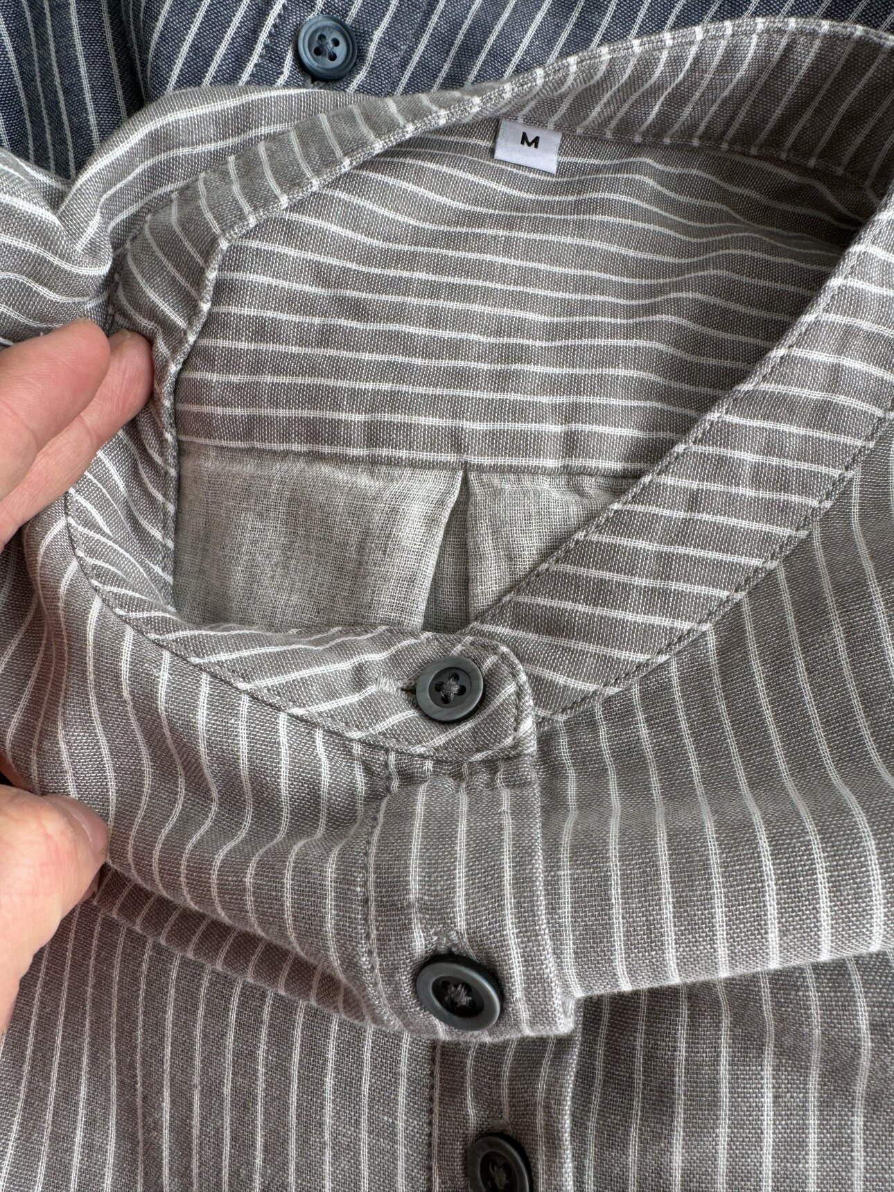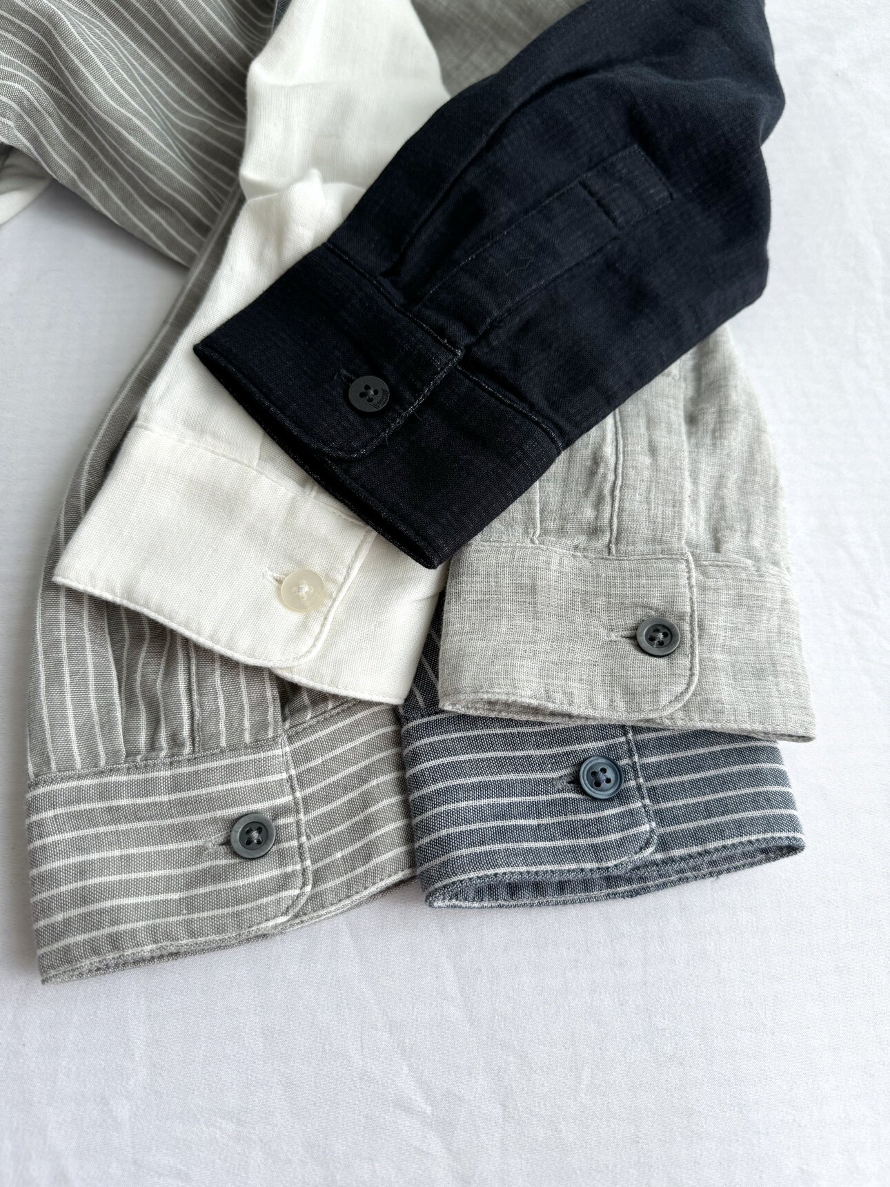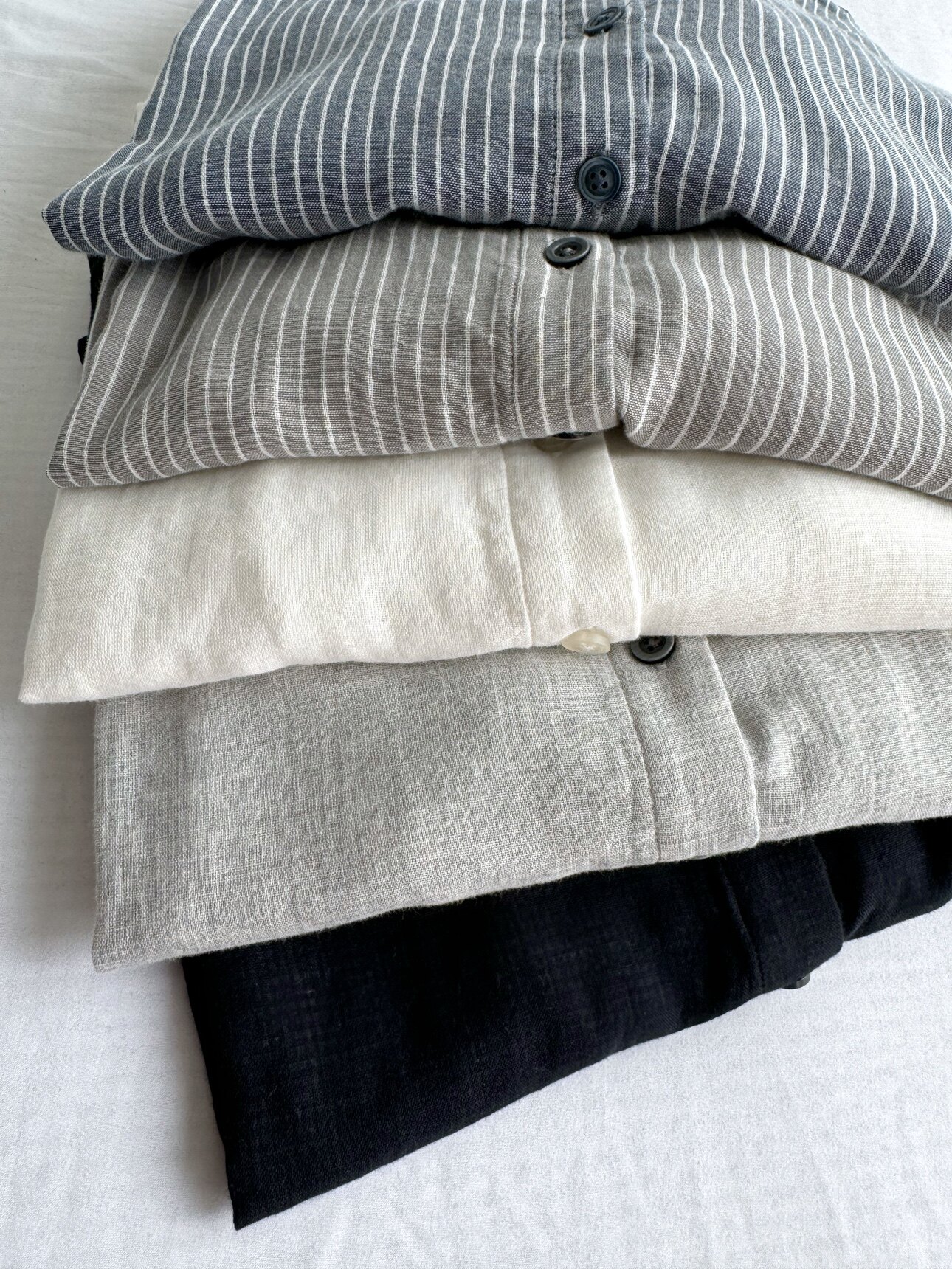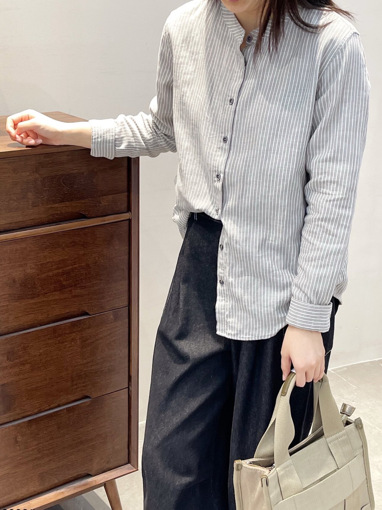 Japanese Order Spring and Autumn New Product Simple Retro Collarless Striped Double-Layer Gauze Solid Color Women's Shirt Long-Sleeved Blouse