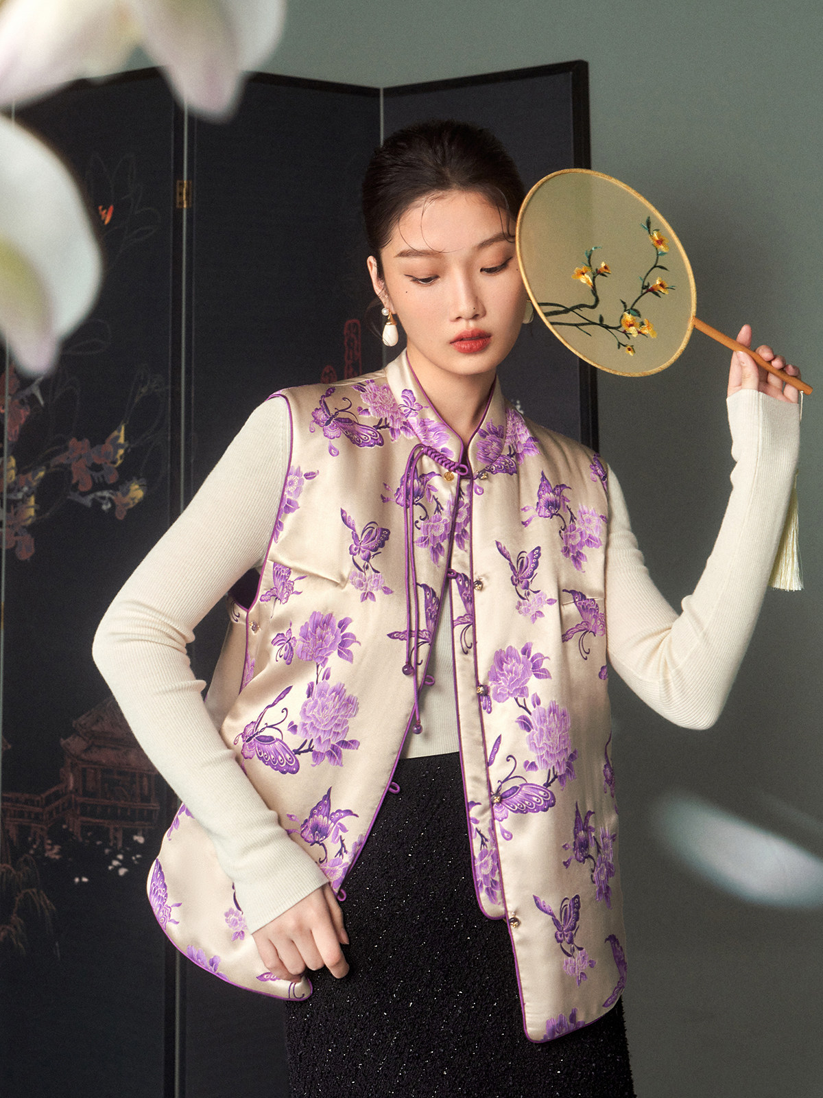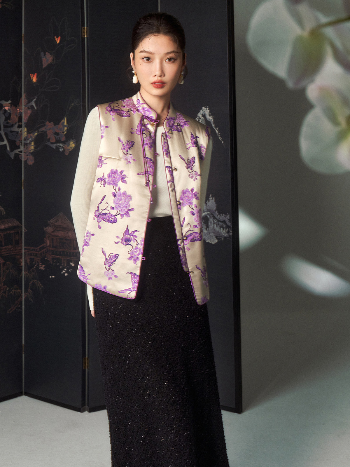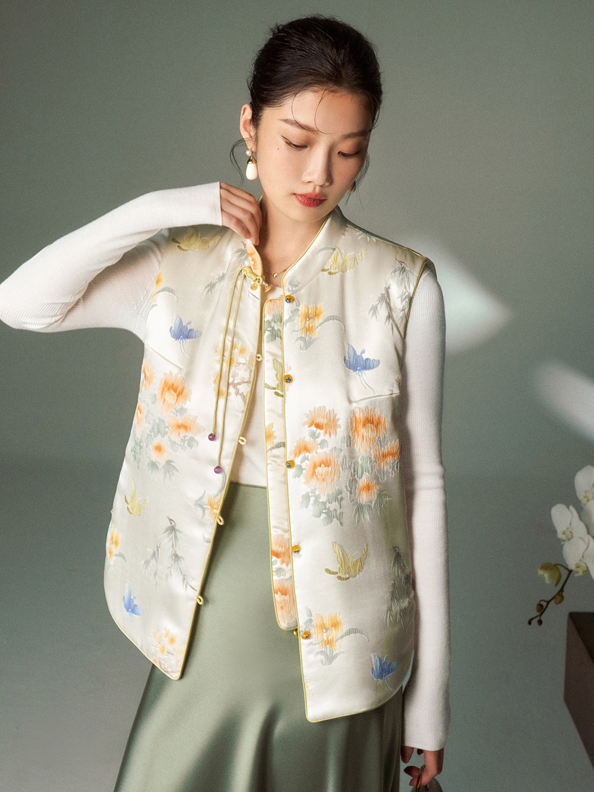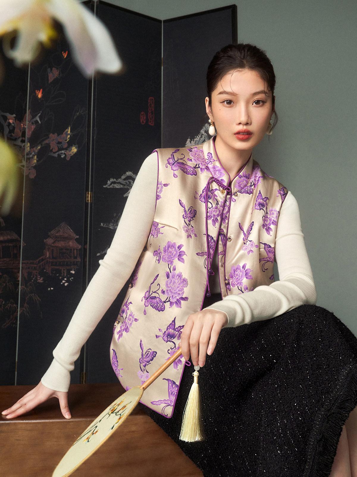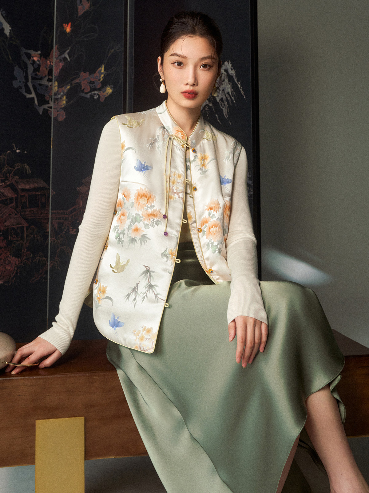 Cokeya/Oriental Beauty~6A Grade Silk Guanle Crepe Tracing Print Two-Way New Chinese Style National Style Jacket Vest