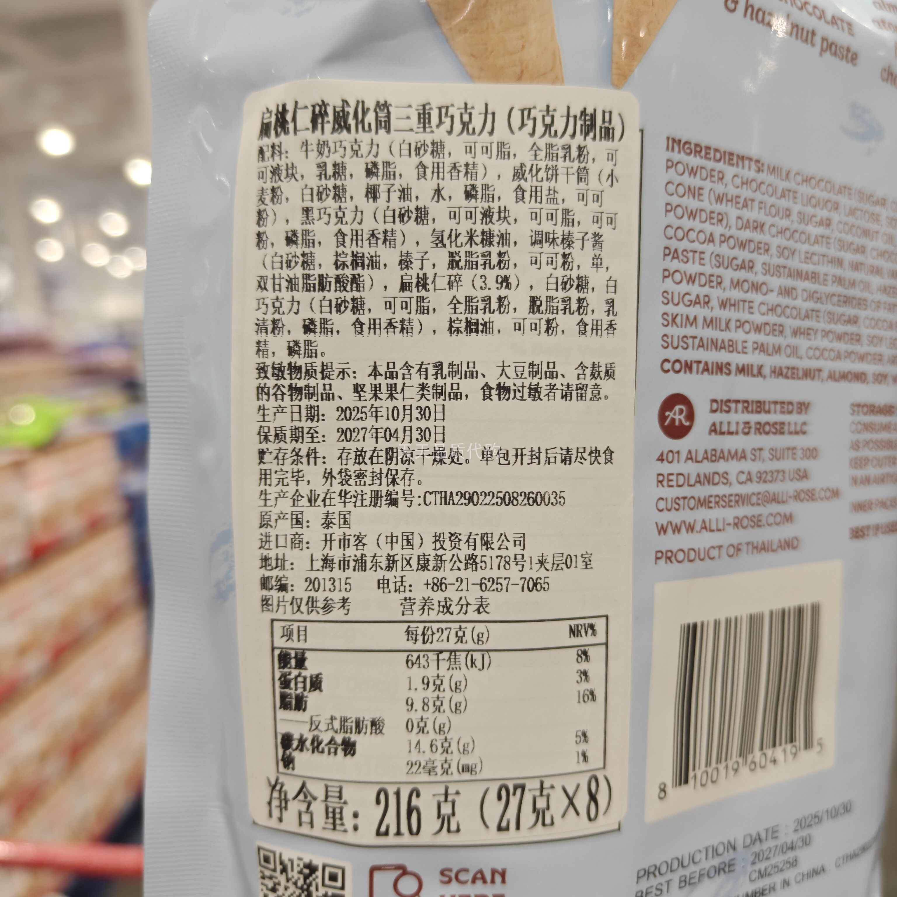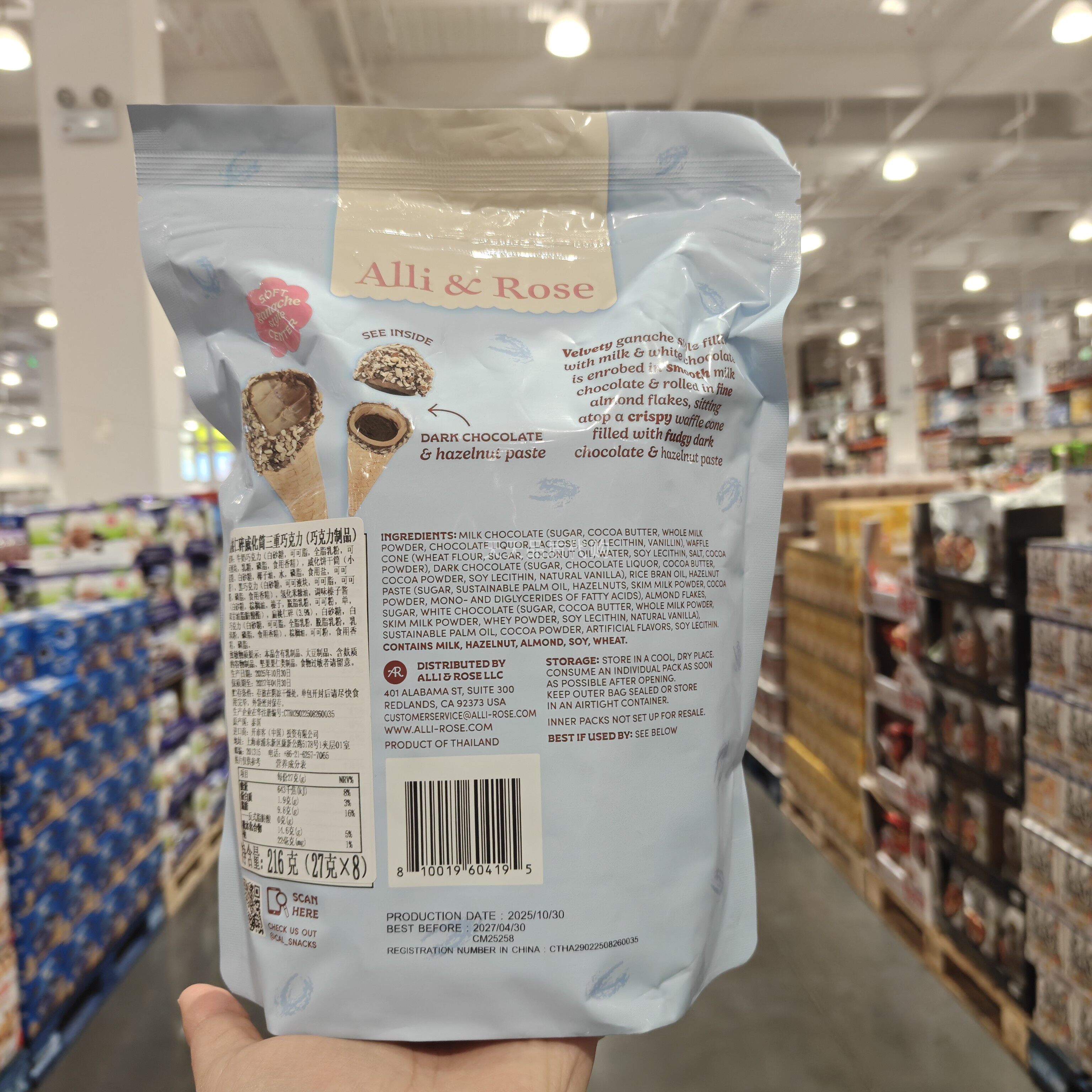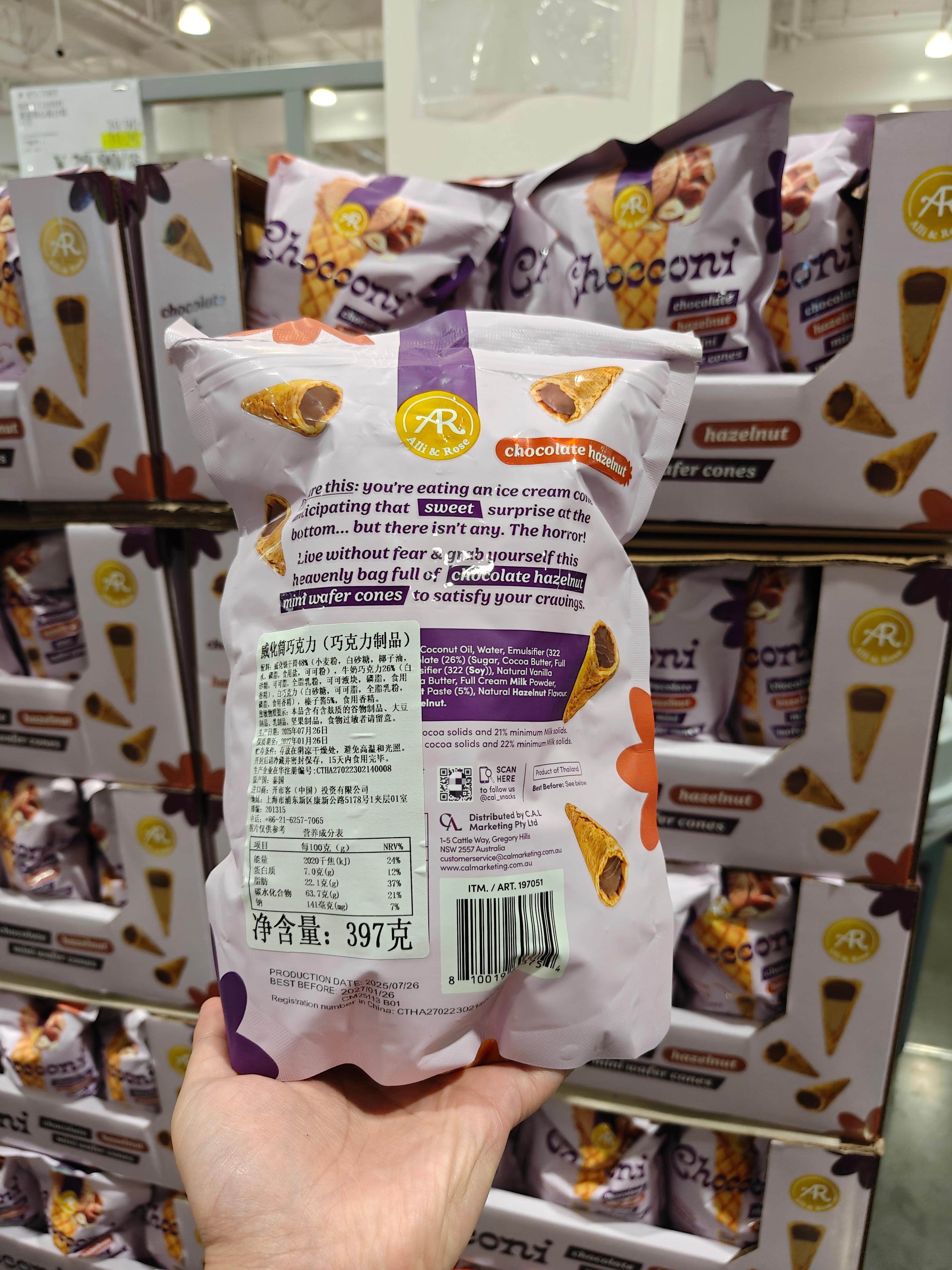Thai Imported Hazelnut Chocolate Wafer Tubes, Bagged, with Crushed Almonds, Multi-Layered Texture, Snack Chocolate Crispy Tubes