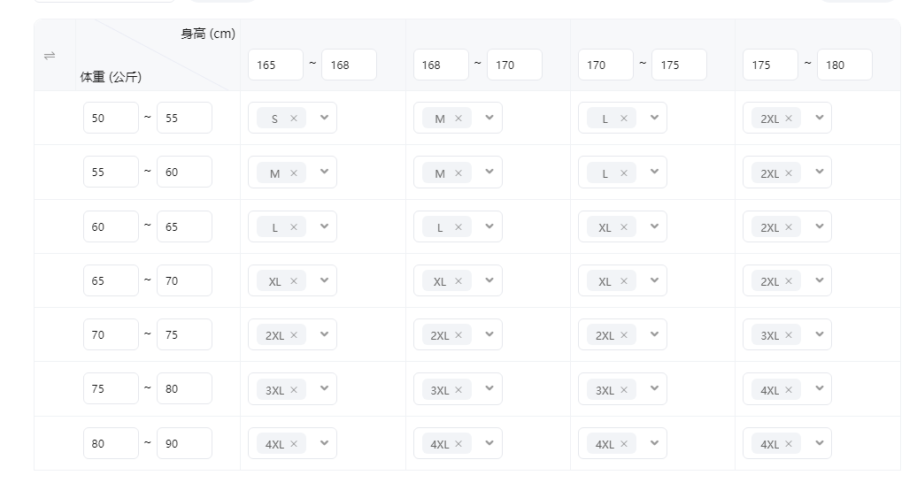 China (cm) 160-165/84-86 165-170 / 88-90 167-172 / 92-96 168-173 / 98-102 170-176 / 106-110