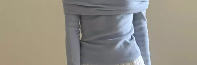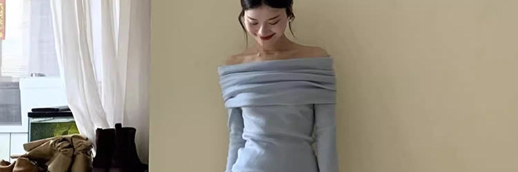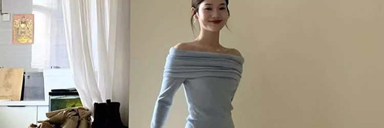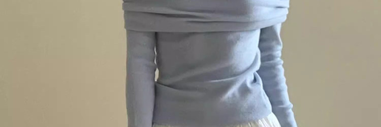 Spring and Autumn One-Shoulder Blue Knit Top for Women, Unique and Delicate, Slim-Fitting Inner Layer, Sweater with Ruched Off-Shoulder Design