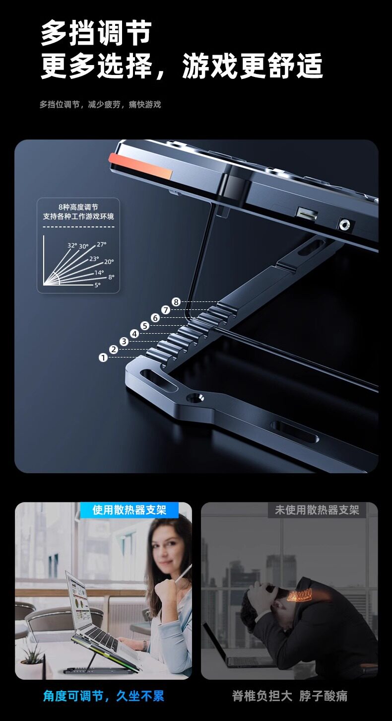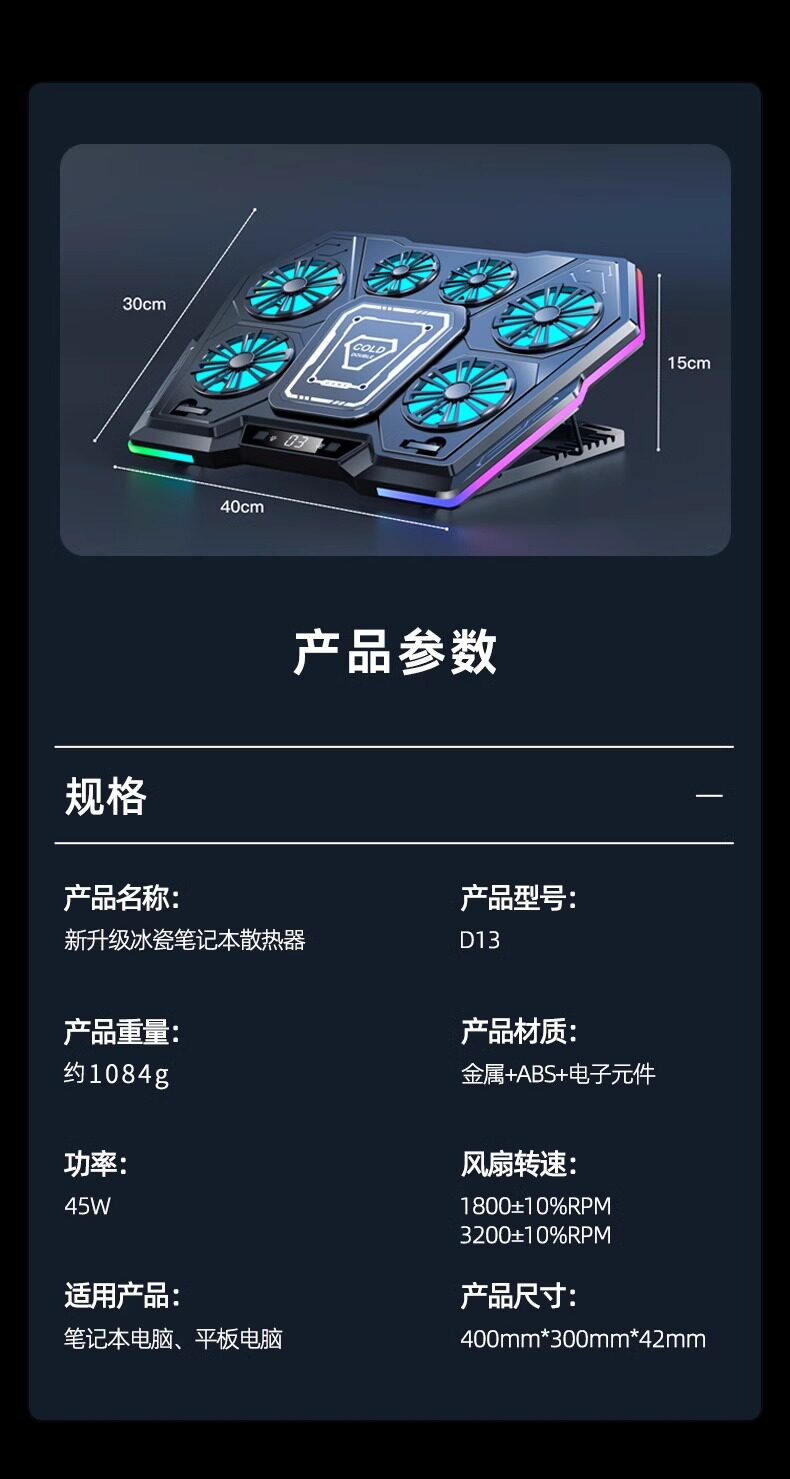 Sort by color Collect + add to purchase and enjoy next-day delivery. Buy today and get it tomorrow.,Suitable for all laptop sizes, please feel free to buy,2024 top-of-the-line flagship model, six-core cooling, five-speed wind adjustment, 7 types of RGB cool lights, eight-speed height adjustment, large LCD digital display,Ice God top configuration dual-core radiator + bracket model dual-core refrigeration four-speed height adjustment aviation-grade aluminum plate