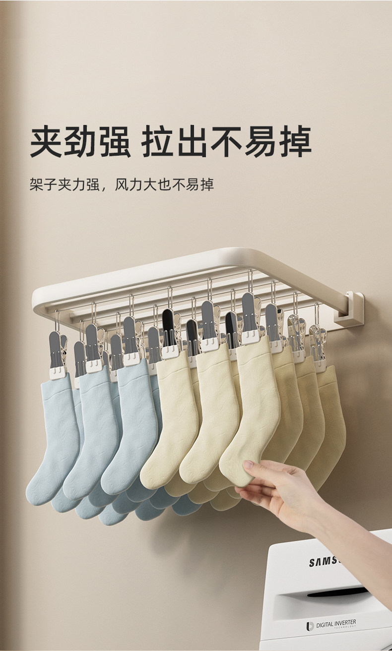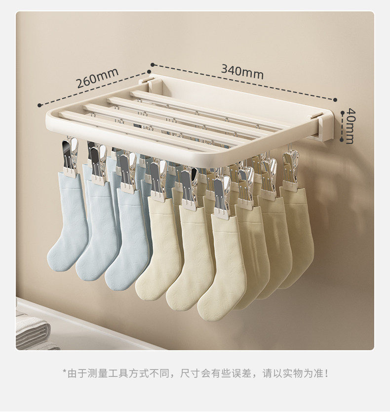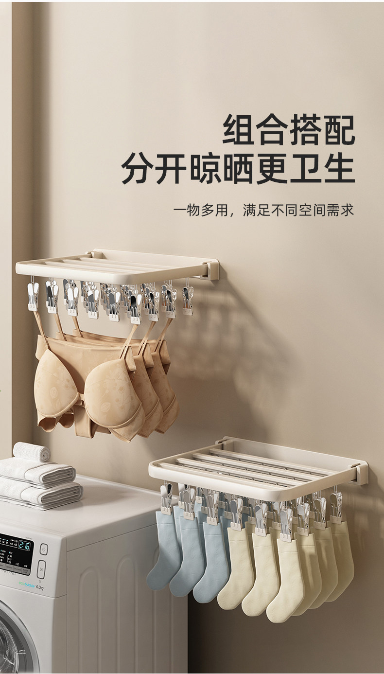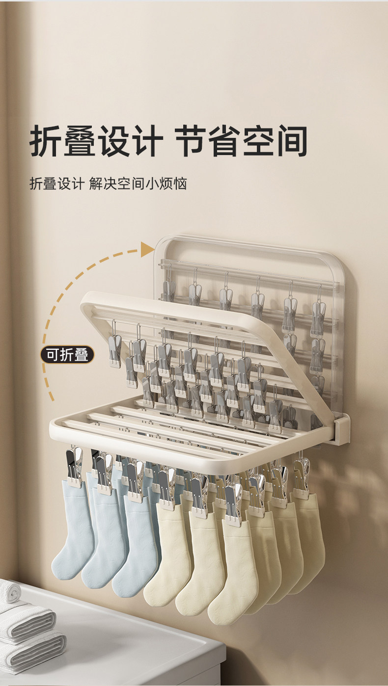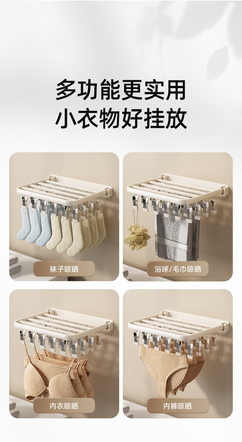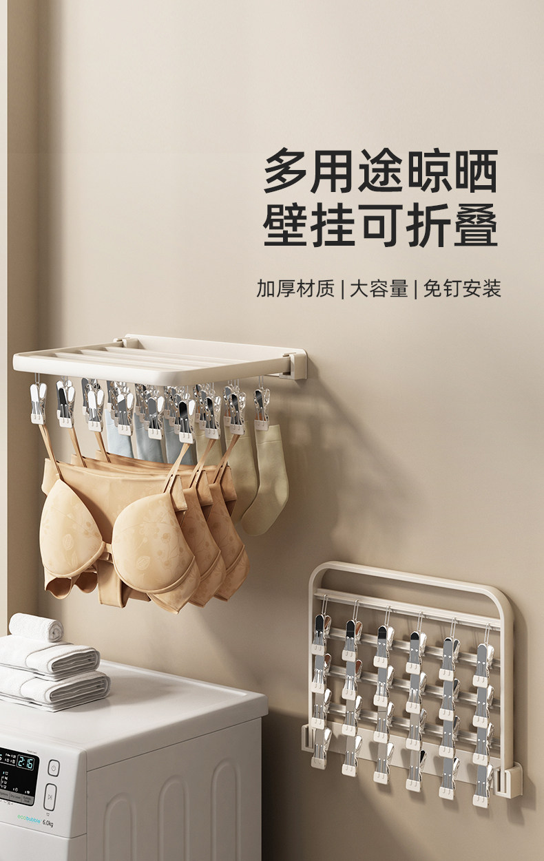 Folding Clothes Drying Rack with Multiple Clips, Wall-Mounted, Multifunctional Sock Drying Tool, Home Balcony Windproof Underwear and Sock Clips