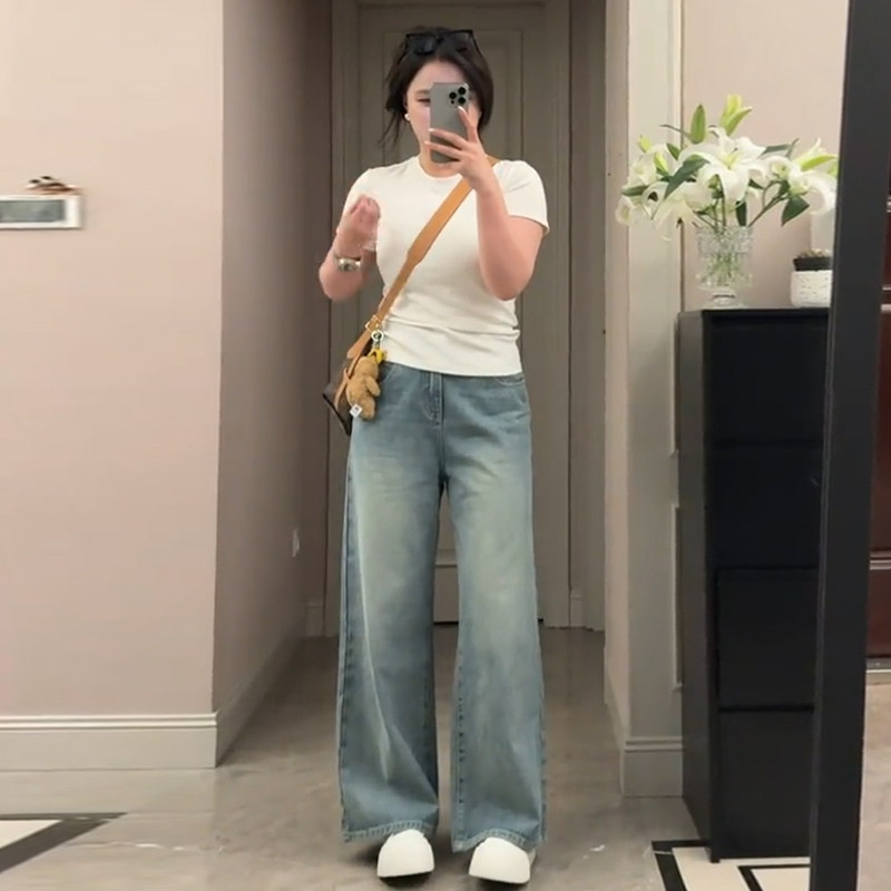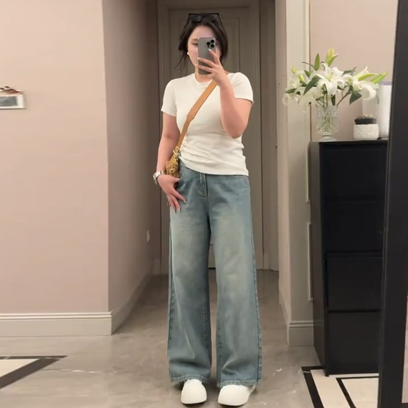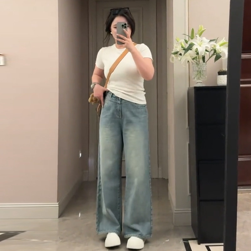 Plus-Size Tencel Jeans for Women, Spring and Summer Thin Style, Slimming Loose Straight-Leg Light-Colored Wide-Leg Pants, High-Waisted Trousers