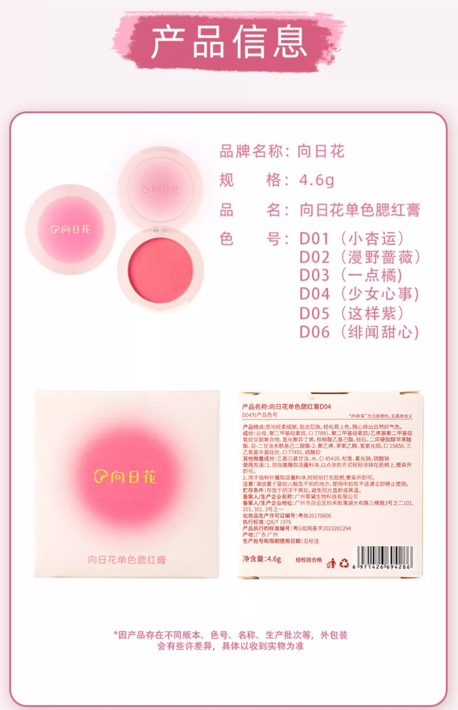 Product Name Sunflower Single Color Blush Cream D03