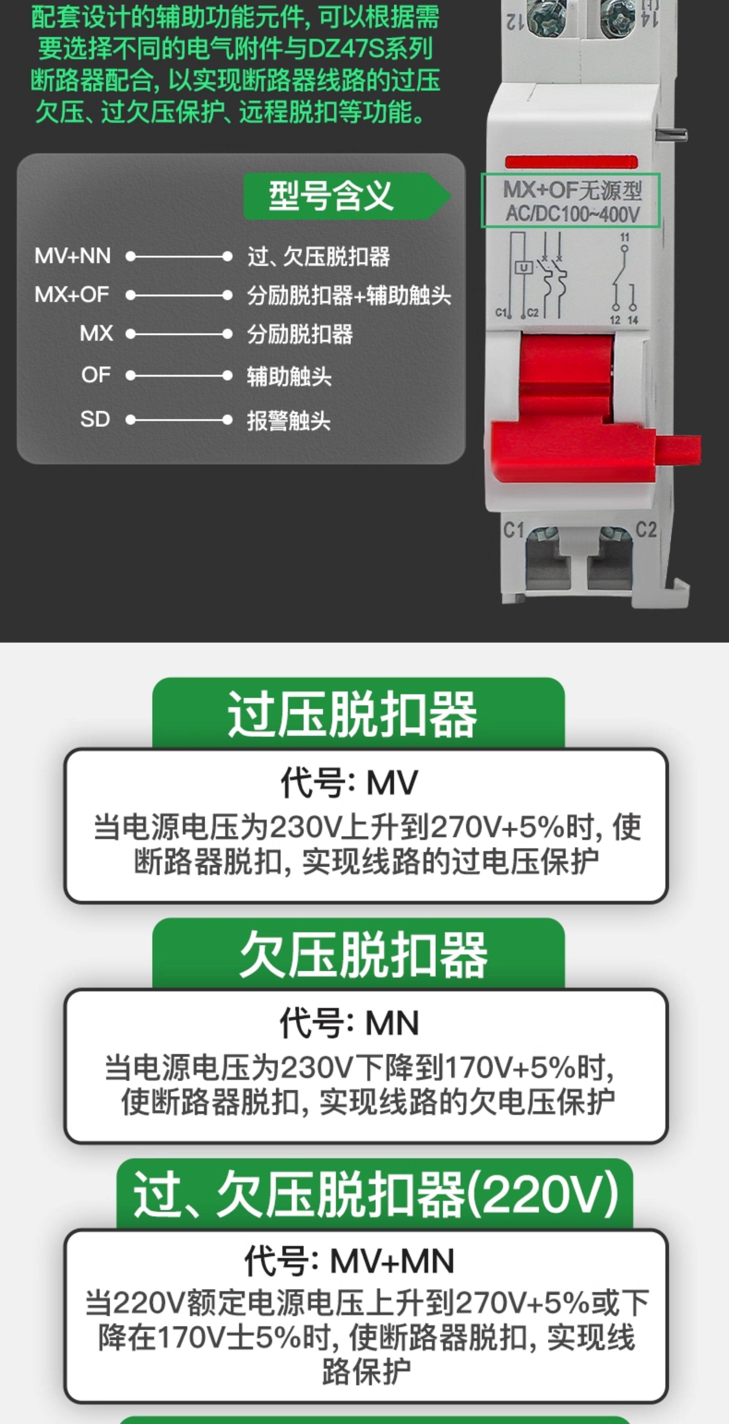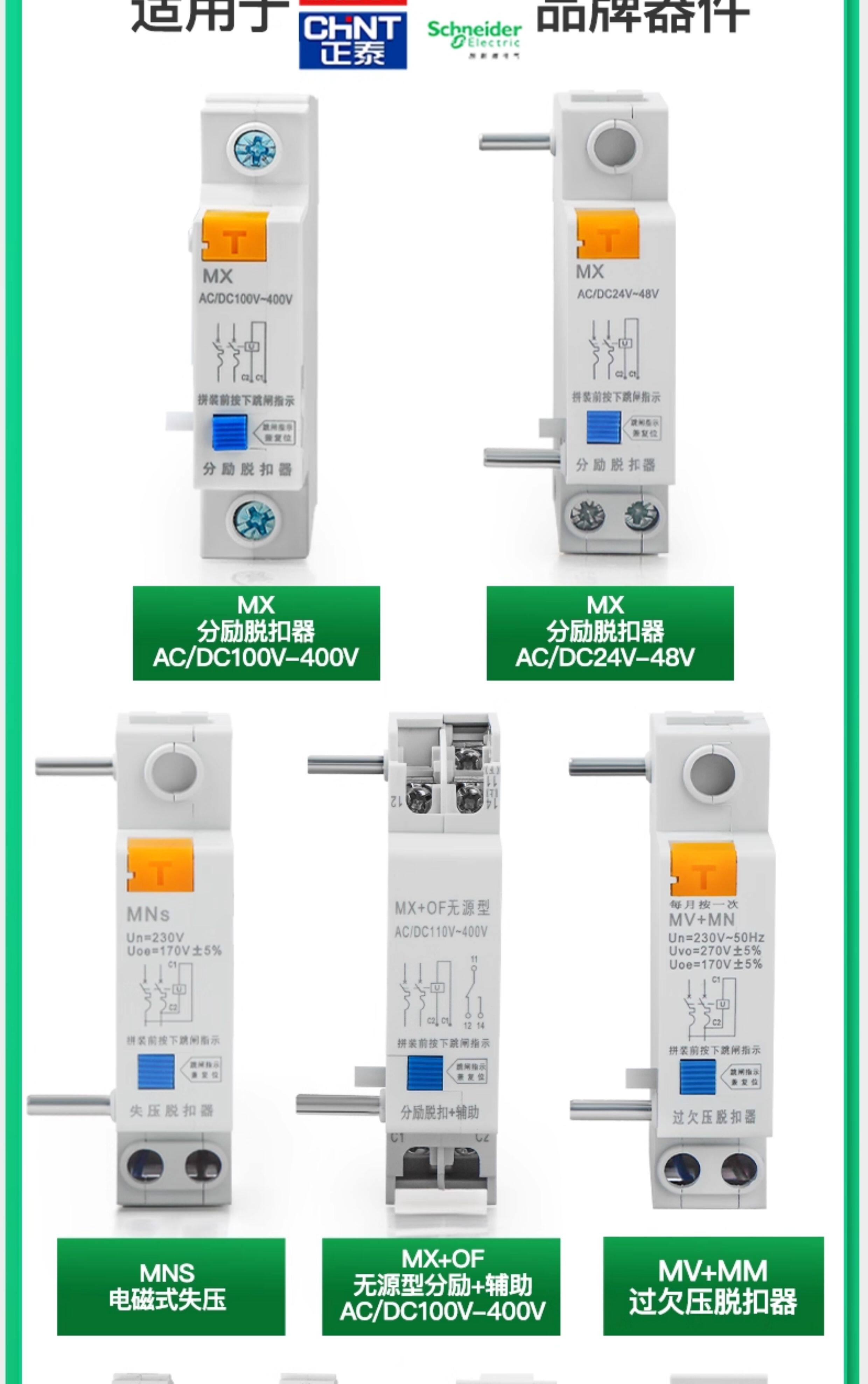 Color Classification Mx+Of Passive Type-110-220V Chint Nxb Type,Mx+Of Passive Type-24-48V Chint Nxb Type,Mx Auxiliary Contact Release - 110-220V Chint Nxb Series,Mx Auxiliary Contact Release - 24-48V Chint Nxb Series,Of Auxiliary Contact-110-220V Chint Nxb Type,Of Auxiliary Contact-24-48V Chint Nxb Type,Sd Alarm Contact-110-220V Chint Nxb Type,Sd Alarm Contact-24-48V Chint Nxb Type,Mv+Mn over and under Voltage-110-220V Chint Nxb Type,Mv Overvoltage Release-110-220V Chint Nxb Type,Mv+Mn Three-Phase Four-Wire Over- and Under-Voltage-110-220V Chint Nxb Type,Mns Electromagnetic Pressure Loss Release-110-220V Chint Nxb Type,Mx+Of Passive Type-110-220V Delixi Dz47S Type,Mx+Of Passive Type-24-48V Delixi Dz47S Type,Mx Auxiliary Contact Release - 110-220V Delixi Dz47S Type,Mx Auxiliary Contact Release - 24-48V Delixi Dz47S Type,Of Auxiliary Contact-110-220V Delixi Dz47S Type,Of Auxiliary Contact-24-48V Delixi Dz47S Type,Sd Alarm Contact-110-220V Delixi Dz47S Type,Sd Alarm Contact-24-48V Delixi Dz47S Type,Mv+Mn over and under Voltage-110-220V Delixi Dz47S Type,Mv Overvoltage Release-110-220V Delixi Dz47S Type,Mv+Mn Three-Phase Four-Wire Over- and Under-Voltage-110-220V Delixi Dz47S Type,Mns Electromagnetic Pressure Loss Release-110-220V Delixi Dz47S Type,Mx+Of Passive Type-110-220V Tianzheng Tgb1N Type,Mx+Of Passive Type-24-48V Tianzheng Tgb1N Type,Mx Auxiliary Contact Release - 110-220V, Tgb1N Model by Tianzheng,Mx Auxiliary Contact Release - 24-48V Tianzheng Tgb1N Type,Of Auxiliary Contact-110-220V Tianzheng Tgb1N Type,Of Auxiliary Contact-24-48V Tianzheng Tgb1N Type,Sd Alarm Contact-110-220V Tianzheng Tgb1N Type,Sd Alarm Contact-24-48V Tianzheng Tgb1N Type,Mv+Mn over and under Voltage-110-220V Tianzheng Tgb1N Type,Mv Overvoltage Release-110-220V Tianzheng Tgb1N Type,Mv+Mn Three-Phase Four-Wire Over- and Under-Voltage-110-220V Tianzheng Tgb1N Type,Mns Electromagnetic Pressure Loss Release-110-220V Tianzheng Tgb1N Type,Mx+Of Passive Type-110-220V-Market Dz47 Type,Mx+Of Passive Type-24-48V-Market Dz47 Type,Mx Auxiliary Contact Release - 110-220V - Market Dz47 Type,Mx-Shunt Trip Unit - 24-48V - Market Standard Dz47 Type,Of Auxiliary Contact-110-220V-Market Dz47 Type,Of Auxiliary Contact-24-48V-Market Dz47 Type,Sd Alarm Contact - 110-220V - Market Dz47 Type,Sd Alarm Contact - 24-48V - Market Dz47 Type,Mv+Mn over and under Voltage-110-220V-Market Dz47 Type,Mv Overvoltage Release - 110-220V - Market Standard Dz47 Type,Mv+Mn Three-Phase Four-Wire Over- and Under-Voltage-110-220V-Market Dz47 Type,Mns Electromagnetic Power Loss Release - 110-220V - Market Standard Dz47 Type,Mx+Of Passive Type-110V-400V-Schneider Ic65-63 Type,Mx+Of Passive Type-24V-48V-Schneider Ic65-63 Type,Mv+Mn(Imnv) over and under Voltage-110V-400V-Schneider Ic65-63 Type,Mv+Mn Three-Phase Four-Wire Over- and Under-Voltage-110V-400V-Schneider Ic65-63 Type,Mv(Imsu) Overvoltage-110V-400V-Schneider Ic65-63 Type,Mx Auxiliary Contact Release-110V-400V-Schneider Ic65-63 Type,Mx Auxiliary Contact Release-24V-48V-Schneider Ic65-63 Type,Of Auxiliary Contact - Universal - Schneider Ic65-63 Type,Sd Alarm Contact-Universal-Schneider Ic65-63 Type,Mx+Of Passive Type-110V-400V-Schneider Nb1/Ea9,Mx+Of Passive Type-24V-48V-Schneider Nb1/Ea9,Mv+Mn(Imnv) over and under Voltage-110V-400V-Schneider Nb1/Ea9,Mv+Mn Three-Phase Four-Wire Over- and Under-Voltage-110V-400V-Schneider Nb1/Ea9,Mv(Imsu) Overvoltage-110V-400V-Schneider Nb1/Ea9,Mx-Shunt Release - 110V-400V - Schneider Nb1/Ea9,Mx-Shunt Release - 24V-48V - Schneider Nb1/Ea9,Of Auxiliary Contact - Universal - Schneider Nb1/Ea9,Sd Alarm Contact-Universal-Schneider Nb1/Ea9,Mx+Of Passive Type-110V-400V-Schneider Ls8-63 (New Model),Mx+Of Passive Type-24V-48V-Schneider Ls8-63 (New Model),Mv+Mn(Imnv) over and under Voltage-110V-400V-Schneider Ls8-63 (New Model),Mv+Mn Three-Phase Four-Wire Over- and Under-Voltage-110V-400V-Schneider Ls8-63 (New Model),Mv(Imsu) Overvoltage-110V-400V-Schneider Ls8-63 (New Model),Mx-Shunt Trip Unit - 110V-400V - Schneider Ls8-63 (New Model),Mx-Shunt Trip Unit - 24V-48V - Schneider Ls8-63 (New Model),Of Auxiliary Contact - Universal - Schneider Ls8-63 (New Model),Sd Alarm Contact-Universal-Schneider Ls8-63 (New Model)
