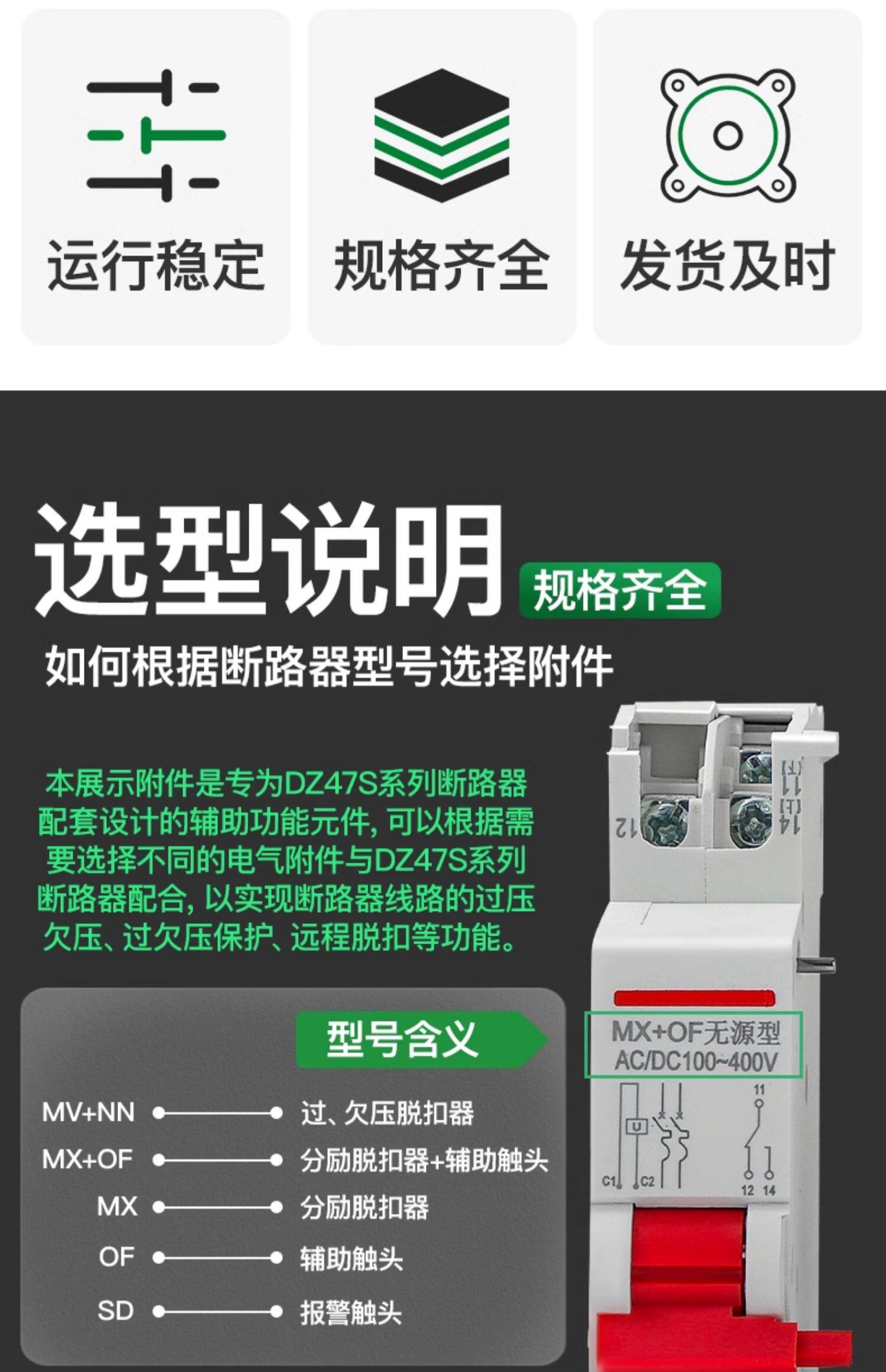 Color Classification Mx+Of Passive Type-110-400V-Delixi,Mx+Of Passive Type - 24-48V - Delixi,Mx-Shunt Trip Unit - 110-400V - Delixi,Mx-Shunt Trip Unit - 24-48V - Delixi,Of Auxiliary Contact - 110-400V - Delixi,Of Auxiliary Contact - 24-48V - Delixi,Sd Alarm Contact 110-400V - Delixi,Sd Alarm Contact - 24-48V - Delixi,Mv+Mn over and under Voltage-110-400V-Delixi,Mv Overvoltage Release-110-400V-Delixi,Mn Undervoltage Release-110-400V Delixi,Mv+Mn Three-Phase Four-Wire Over- and Under-Voltage-110-400V-Delixi,Mns Electromagnetic Pressure Loss Release-110-400V-Delixi,Mx+Of Passive Type-110-400V-Chint,Mx+Of Passive Type-24-48V--Chint,Mx-Shunt Release - 110-400V - Chint,Mx-Shunt Trip Unit - 24-48V - Chint,Of Auxiliary Contact-110-400V-Chint,Of Auxiliary Contact - 24-48V - Chint,Sd Alarm Contact-110-400V-Chint,Sd Alarm Contact-24-48V--Chint,Mv+Mn over and under Voltage-110-400V-Chint,Mv Overvoltage Release-110-400V-Chint,Mn Undervoltage Release-110-400V-Chint,Mv+Mn Three-Phase Four-Wire Over- and Under-Voltage-110-400V-Chint,Mns Electromagnetic Pressure Loss Release-110-400V-Chint,Mx+Of Passive Type-110-400V-Tianzheng,Mx+Of Passive Type-24-48V-Tianzheng,Mx-Shunt Release - 110-400V - Tianzheng,Mx-Shunt Trip Unit - 24-48V - Tianzheng,Of Auxiliary Contact-110-400V-Tianzheng,Of Auxiliary Contact-24-48V--Tianzheng,Sd Alarm Contact-110-400V-Tianzheng,Sd Alarm Contact-24-48V--Tianzheng,Mv+Mn over and under Voltage-110-400V-Tianzheng,Mv+Mn Three-Phase Four-Wire Over- and Under-Voltage-110-400V-Tianzheng,Mns Electromagnetic Pressure Loss Release-110-400V-Tianzheng,Mx+Of Passive Type - 110-400V - Market Model,Mx+Of Passive Type - 24-48V - Market Leading Model,Mx Shunt Trip Unit - 110-400V - Standard Model,Mx Shunt Trip Unit - 24-48V - Standard Model,Of Auxiliary Contact - 110-400V - Standard Model,Of Auxiliary Contact - 24-48V - Standard Model,Sd Alarm Contact - 110-400V - Standard Model,Sd Alarm Contact - 24-48V Standard Model,Mv+Mn Over/Under Voltage - 110-400V - Standard Model,Mv+Mn Three-Phase Four-Wire Over- and Under-Voltage-110-400V-Market Model,Mns Electromagnetic Power-Operated Circuit Breaker - 110-400V - Standard Model