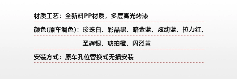 Color Classification Unpainted, Painted (Original Factory Quality, 4S Shop Quality Inspection),Crystal Purple Paint (Original Factory Quality, 4S Shop Quality Inspection),Amber Orange Paint (Original Quality, 4S Store Quality Inspection),Taffeta White, Painted Finish (Original Equipment Quality, 4S Shop Quality Inspected),Titanium Crystal Silver Paint (Original Quality, 4S Store Quality Inspection),Shenghui Silver Paint (Original Factory Quality, 4S Shop Quality Inspection),Black Paint (Original Quality, 4S Store Quality Inspection),Tensile Red Paint (Original Quality, 4S Store Quality Inspection),Snowflake Silver Paint (Original Quality, 4S Store Quality Inspection),Neutron Blue Paint (Original Quality, 4S Store Quality Inspection),Pearl White Paint (Original Factory Quality, 4S Shop Quality Inspection),For Other Colors, Please Contact Customer Service (Original Factory Quality, 4S Store Quality Inspection)