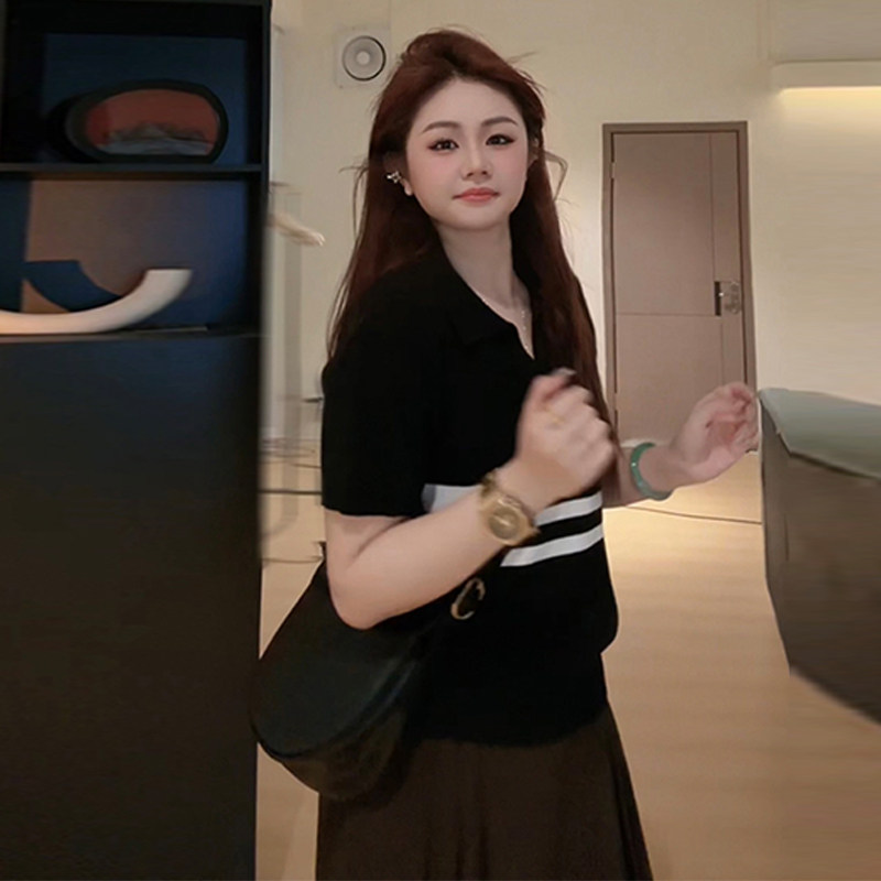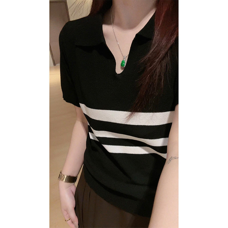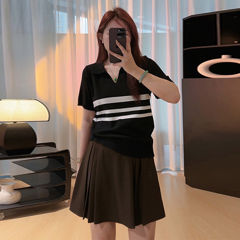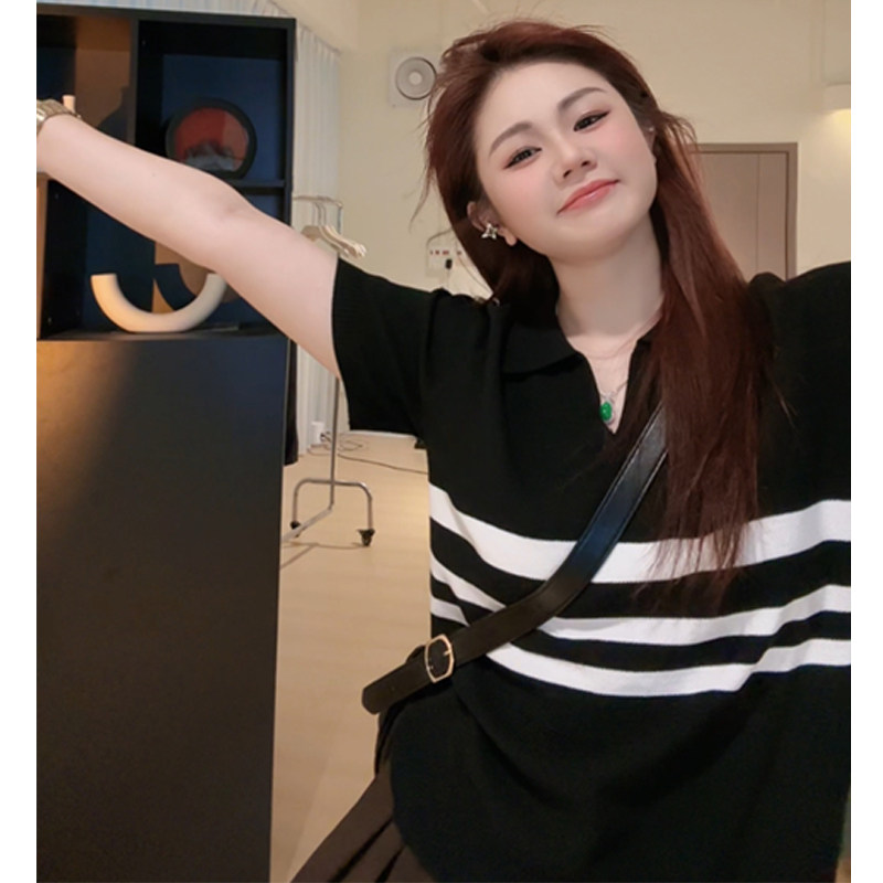 Plus-Size Polo Collar Short-Sleeve T-Shirt for Women, Summer, Slightly Chubby, Slimming, Loose, Covers Body, Striped, Versatile V-Neck Top
