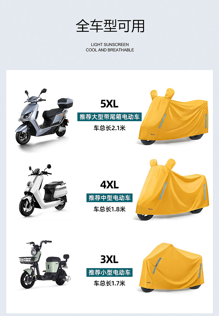 Color Classification 5XL (Large-Electric Vehicle)--Yellow,5XL (Large-Electric Vehicle)--Light Blue,5XL (Large-Electric Vehicle)--Grey,5XL (Large-Electric Vehicle)--Black,5XL (Large-Electric Vehicle)-- Navy Blue,4XL---(Medium-Electric Vehicle)-Yellow,4XL--(Medium-Electric Vehicle)-Light Blue,4XL--(Medium-Electric Vehicle)-Gray,4XL--(Medium-Electric Vehicle)-Black,4XL--(Medium-Electric Vehicle)- Navy Blue,3XL (Small Electric Vehicle-No Reflector Cover)-Yellow,3XL (Small Electric Vehicle-No Reflector Cover)-Light Blue,3XL (Small Electric Vehicle-No Reflector Cover)-Grey,3XL (Small Electric Vehicle-No Reflector Cover)-Black,3XL (Small Electric Car-No Reflector Cover)- Navy Blue