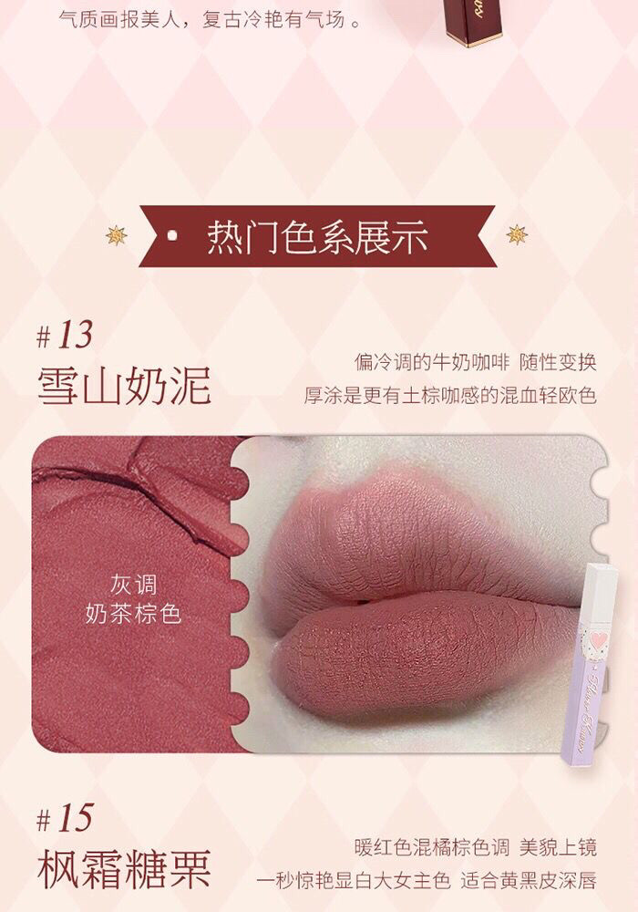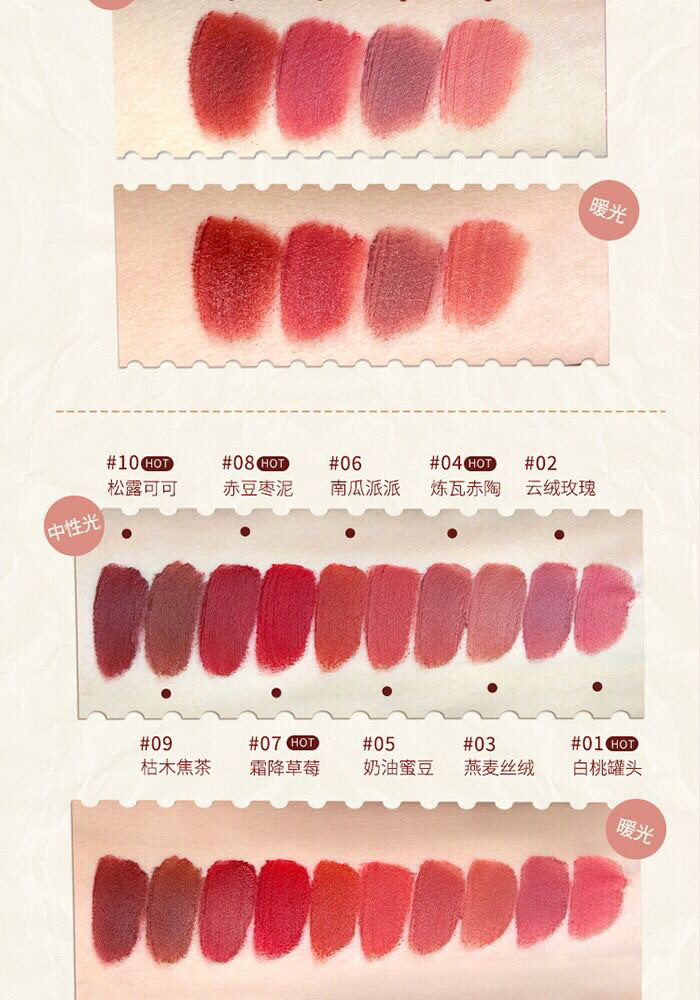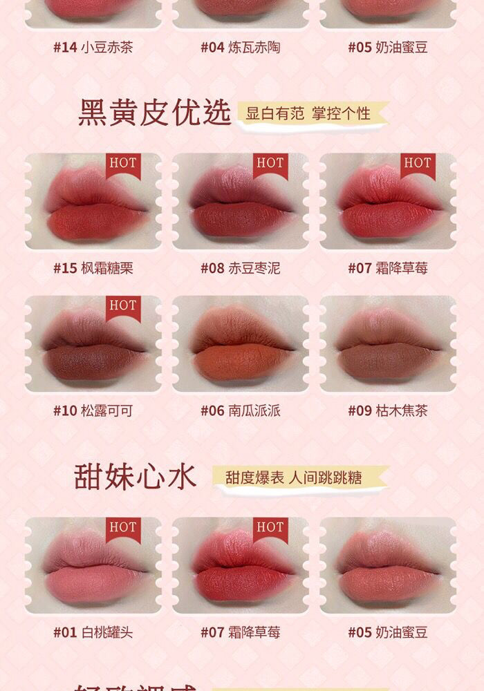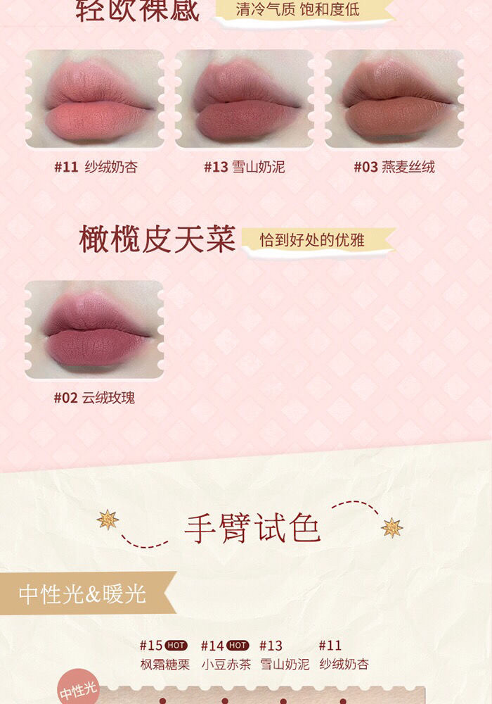 Color Classification 01Canned White Peach,02 Cloud Velvet Rose,03Oatmeal Velvet,04 Refined Brick Terracotta,05 Cream Honey Beans,06Pumpkin Pie Pie,07 Frost Strawberry,08 Red Bean and Jujube Paste,09 Dead Wood Burnt Tea,10 Truffle Cocoa,11 Gauze Velvet Milk Apricot (No Plastic Packaging),12 Pink Mist Cloud Cream (No Plastic Packaging),13Snow Mountain Milk Mud,14 Adzuki Red Tea,15 Maple Frost Sugar Chestnut