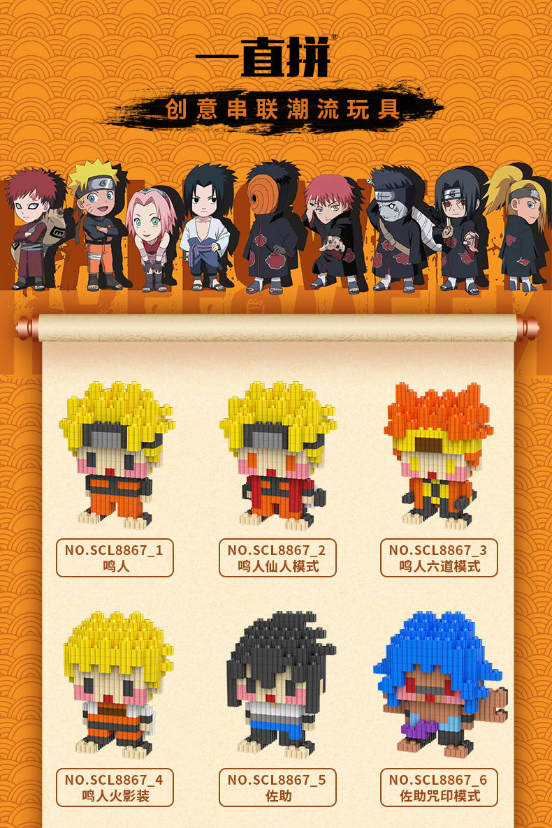 Color Classification Choose Three Models of Your Choice (Write in the Remarks),Choose Any Six Models (Write in the Remarks),Choose from Nine Models (Write in the Remarks),Naruto,Naruto Sage Mode,Naruto Six Paths Mode,Naruto,Uchiha Sasuke,Jutsu Sasuke,Sasuke with Broken Arm,Uchiha Itachi,Sakura,Hinata,Kakashi,Jiraiya,Hoshikage,Orochimaru,Shikamaru,Ningji,Minato Namikaze,Uchiha Class,Six Paths of Pain,Xiaonan,Deidara,Dried Persimmon Kisame,Kakuzu,Flying Section,White Jue,Naruto Building Blocks Set