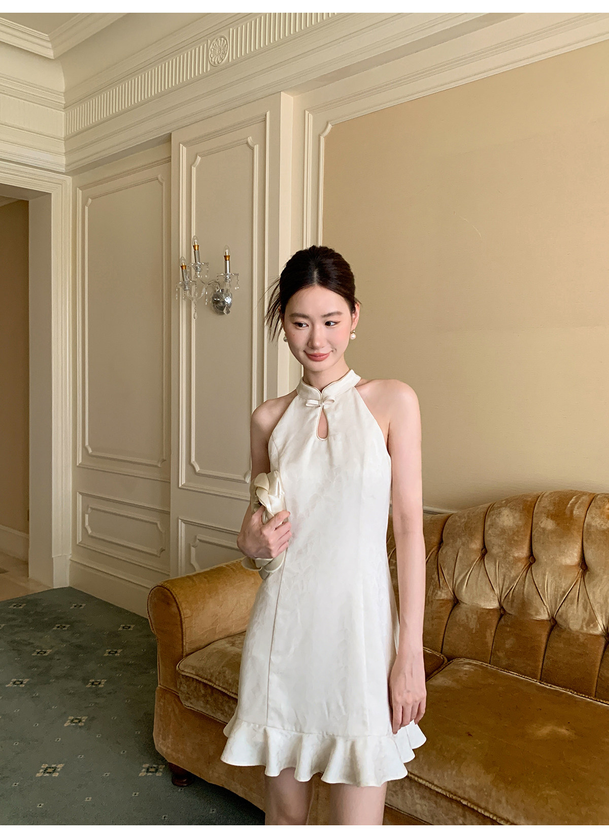 XXNING New Chinese-style Chinese-style plate-button halter-neck dress, elegant, high-end, waist-cinching lace long skirt