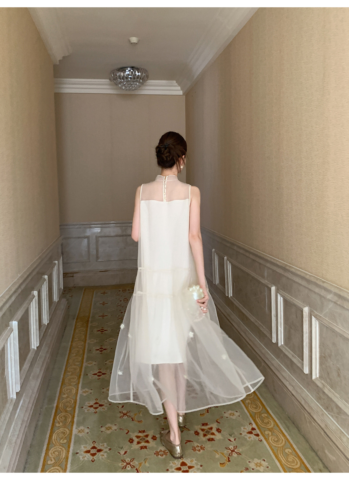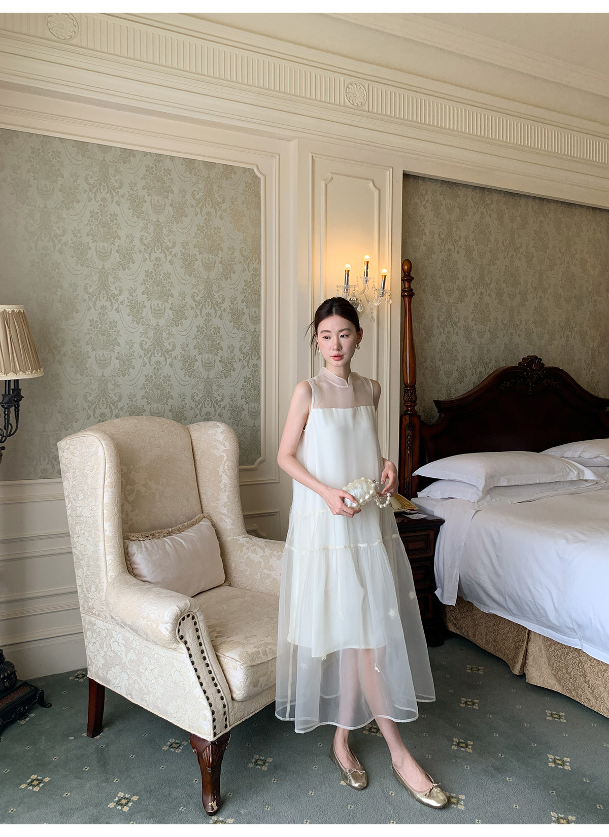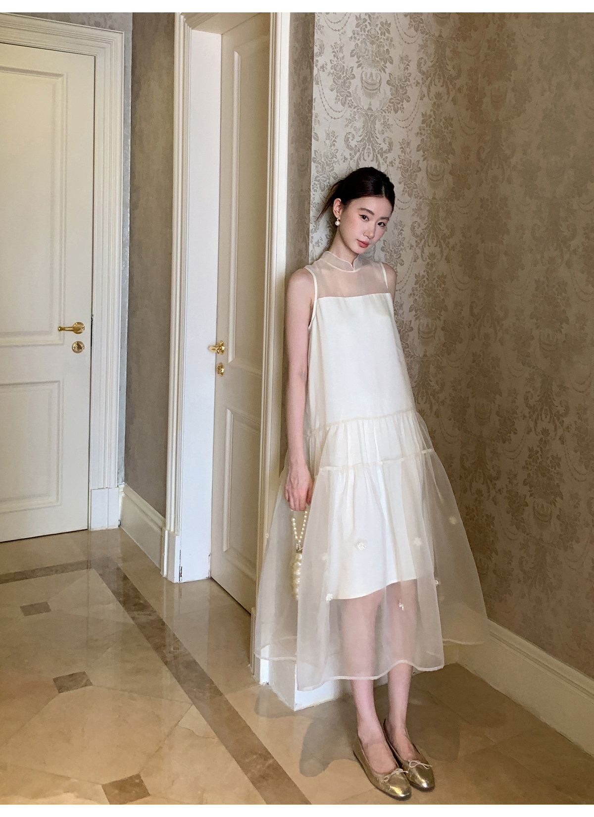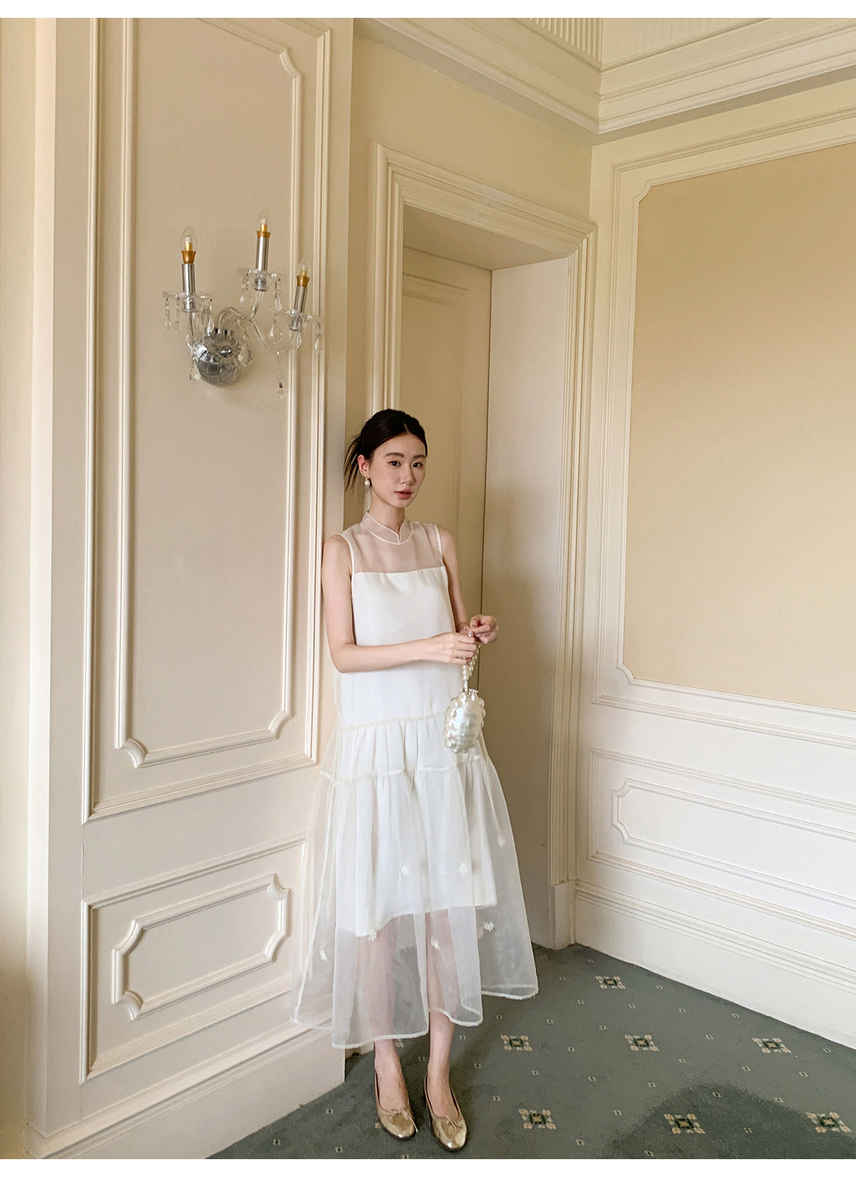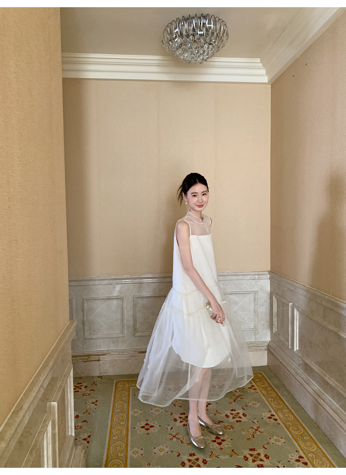Xxning French-Style Mesh Patchwork Stand-Up Collar See-Through Tiered Dress for Women, Hepburn-Style White Fairy Dress