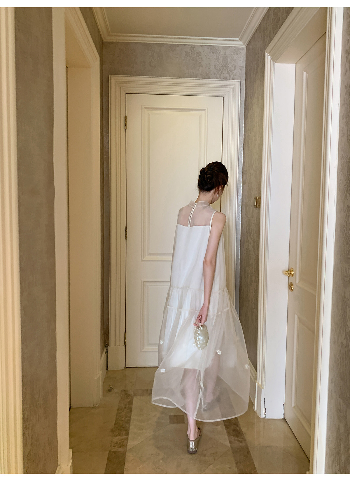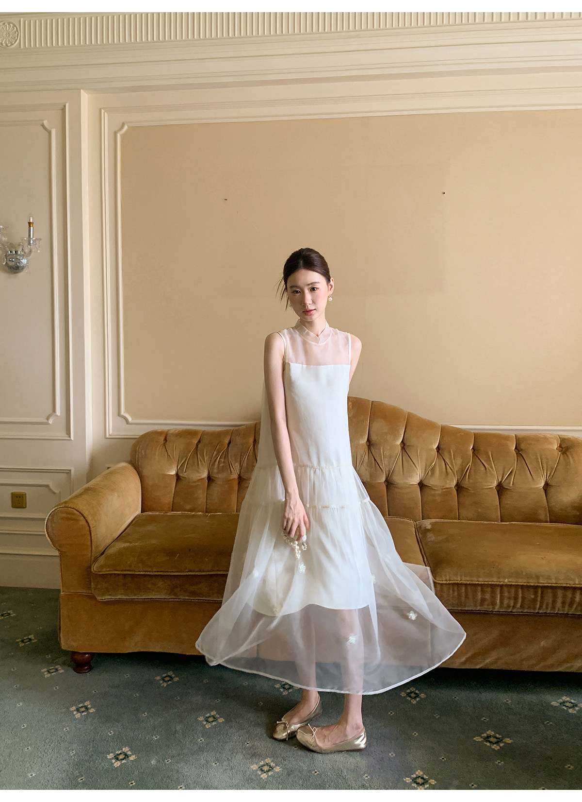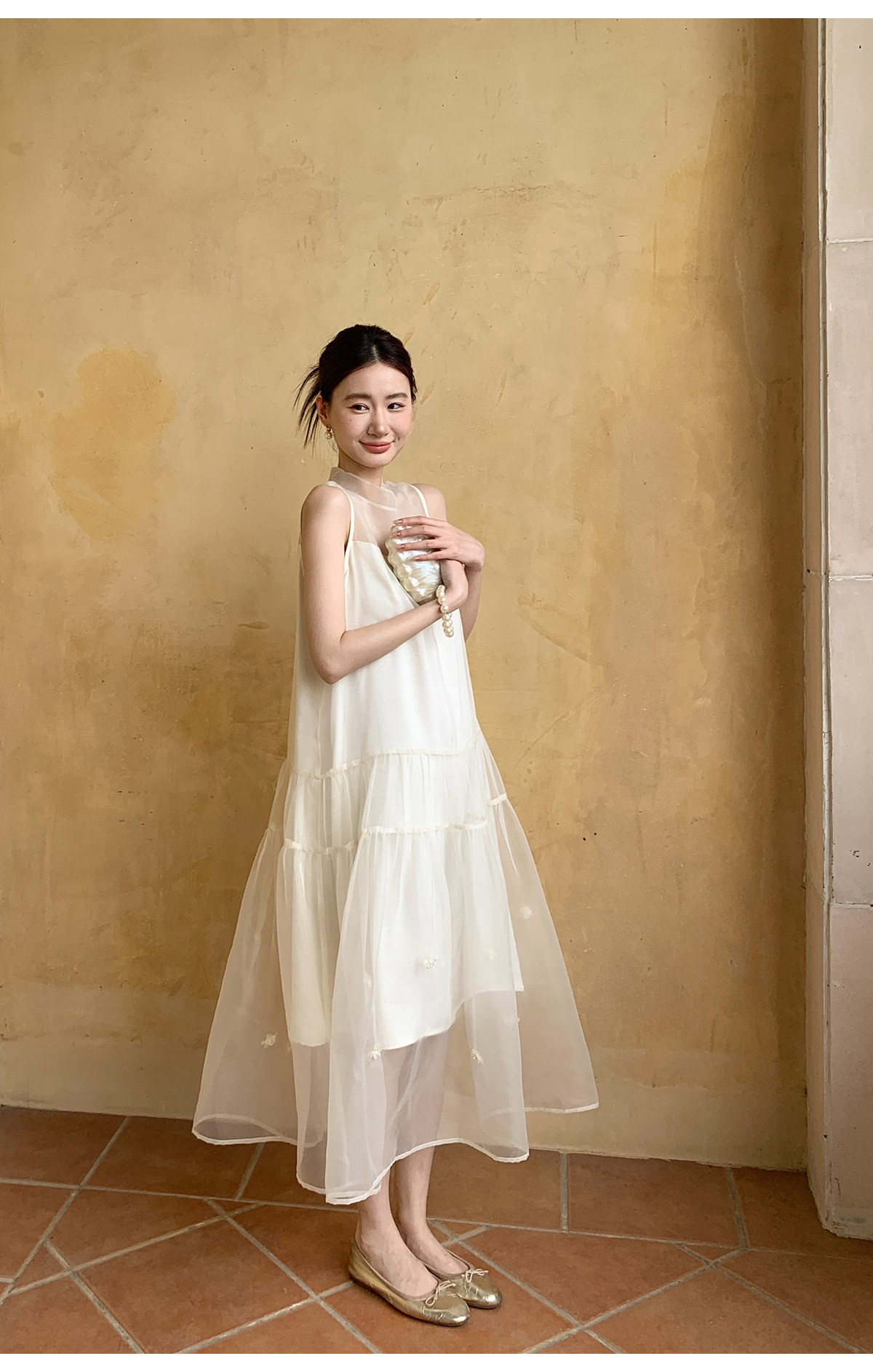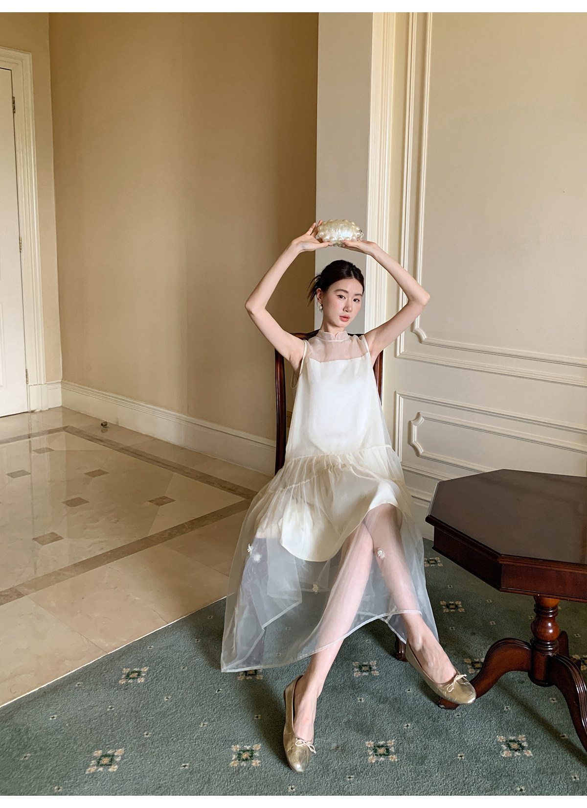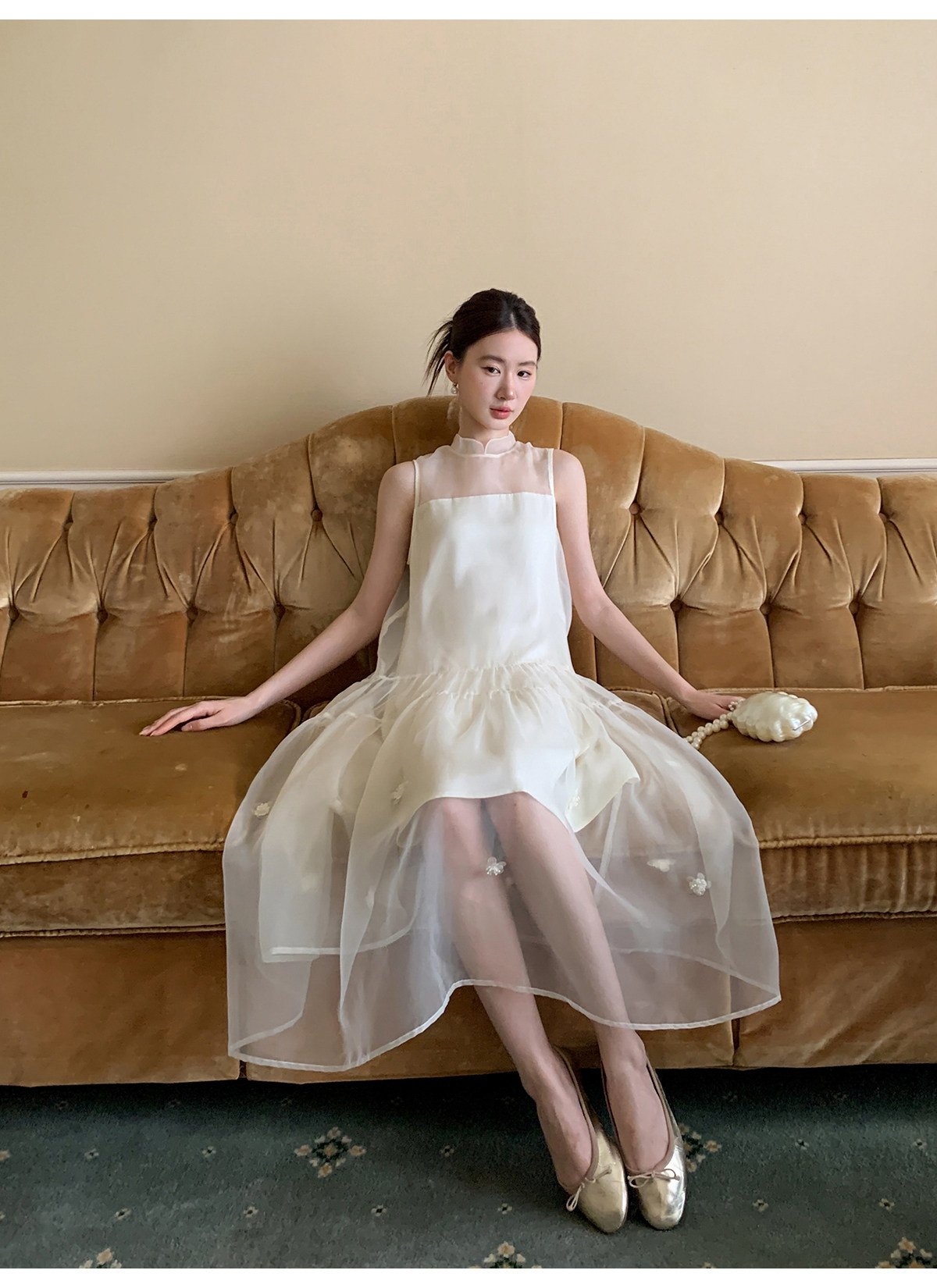 Xxning French-Style Mesh Patchwork Stand-Up Collar See-Through Tiered Dress for Women, Hepburn-Style White Fairy Dress