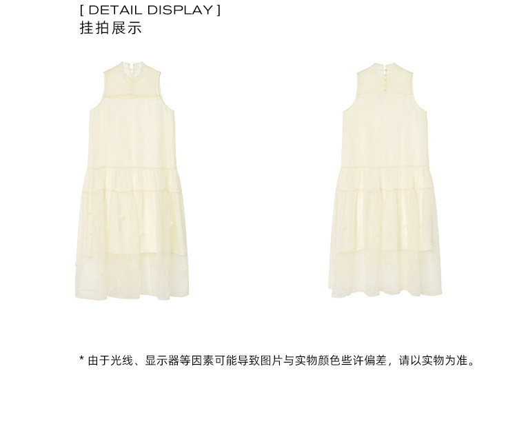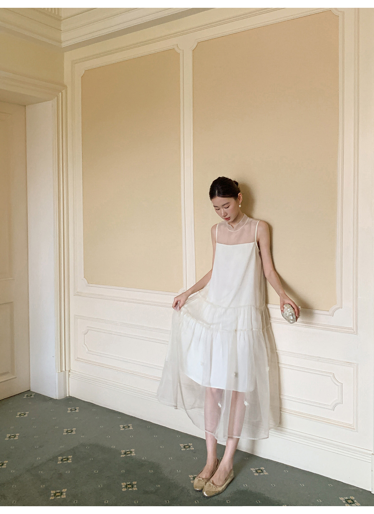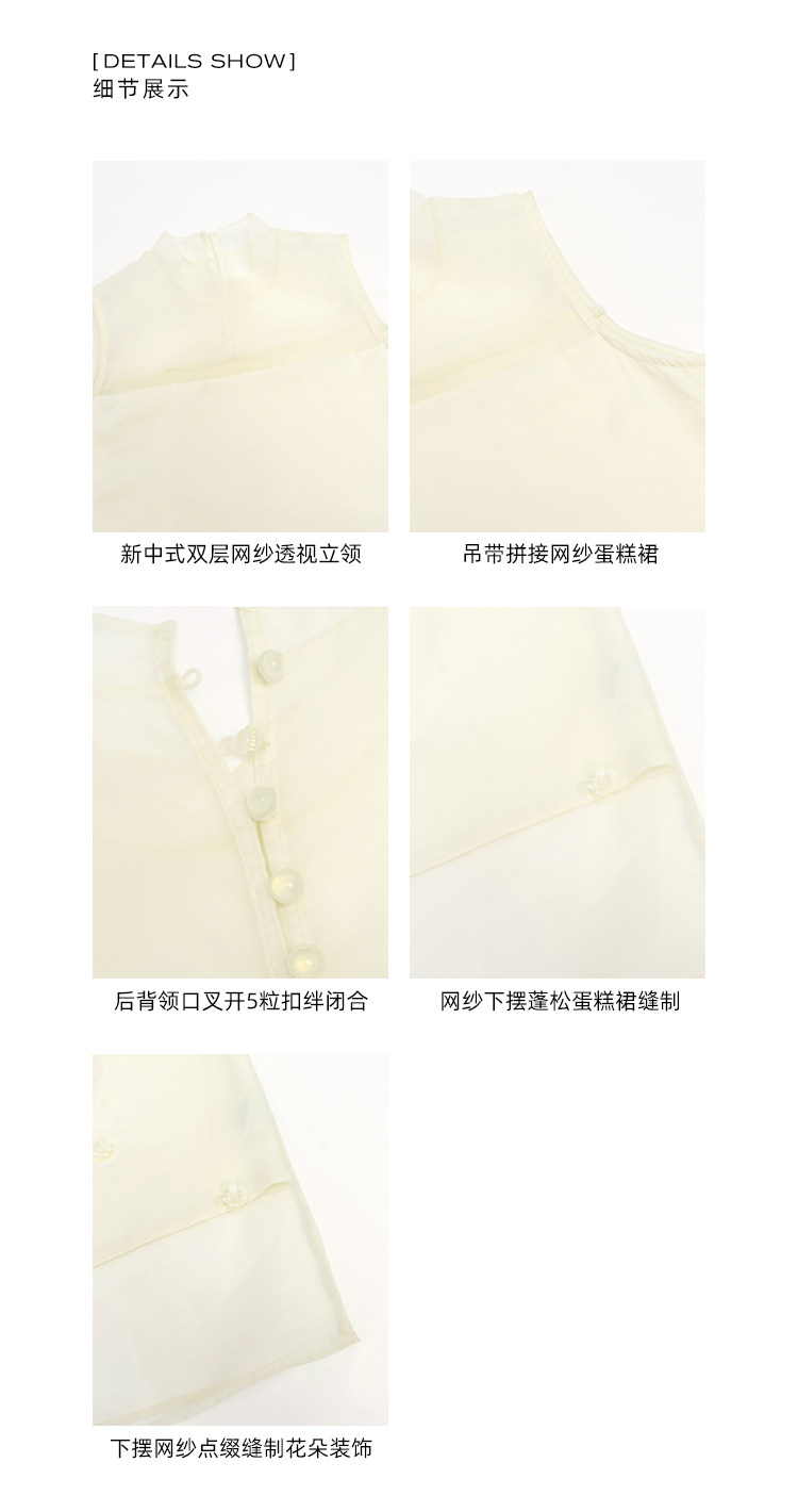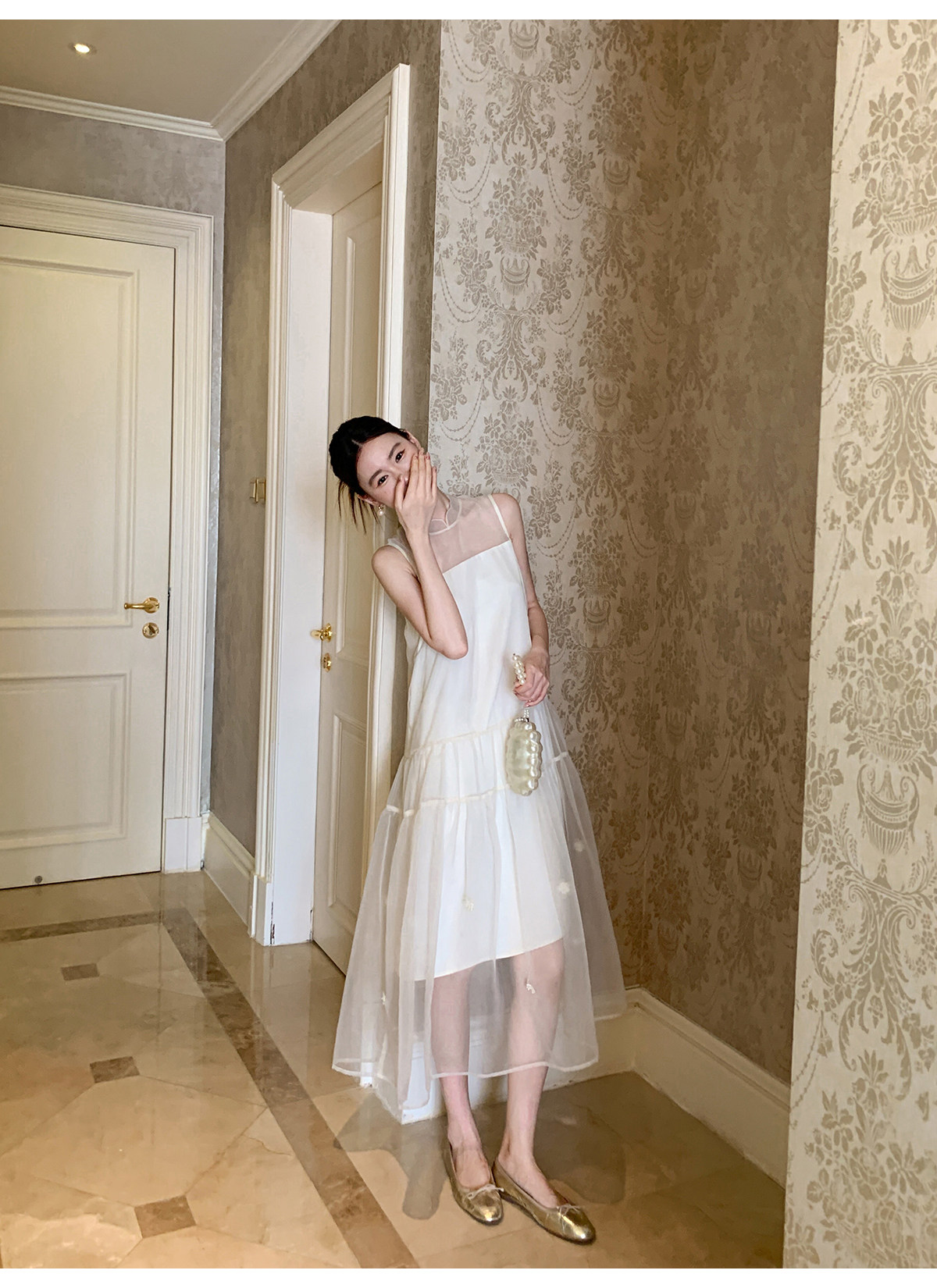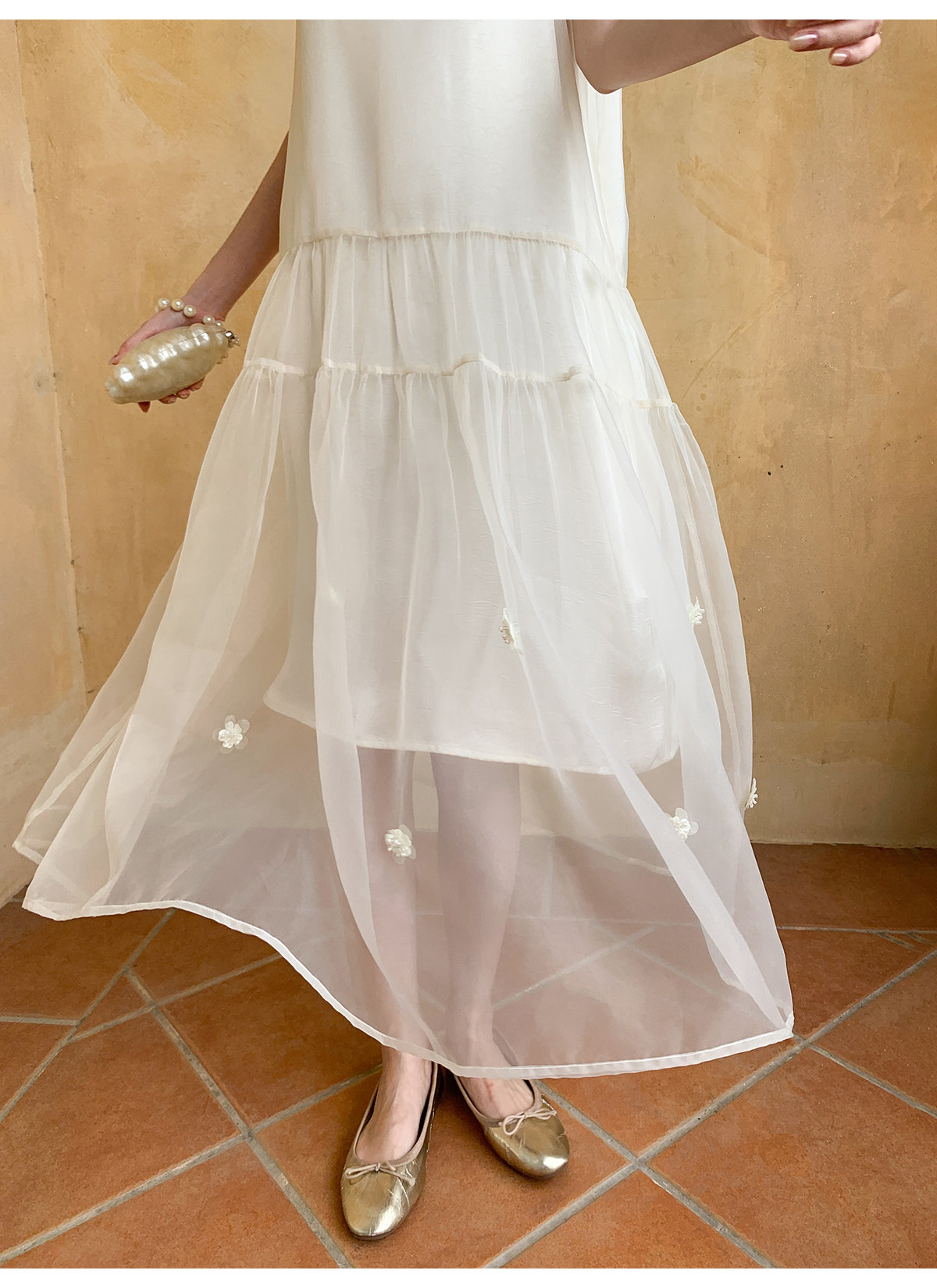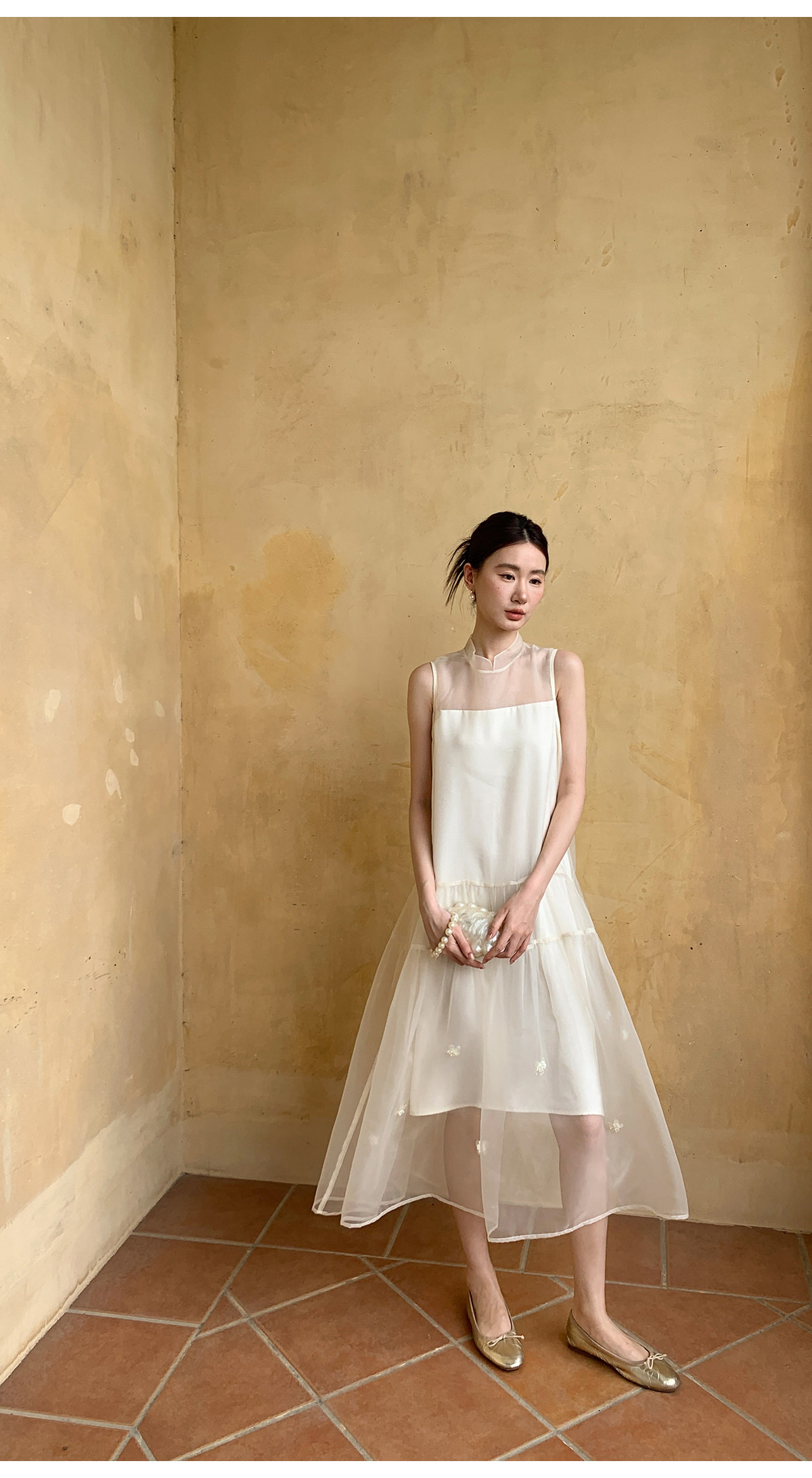 Xxning French-Style Mesh Patchwork Stand-Up Collar See-Through Tiered Dress for Women, Hepburn-Style White Fairy Dress
