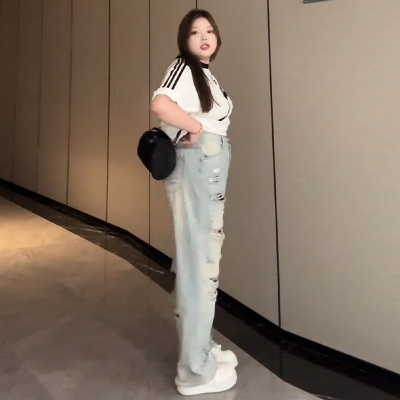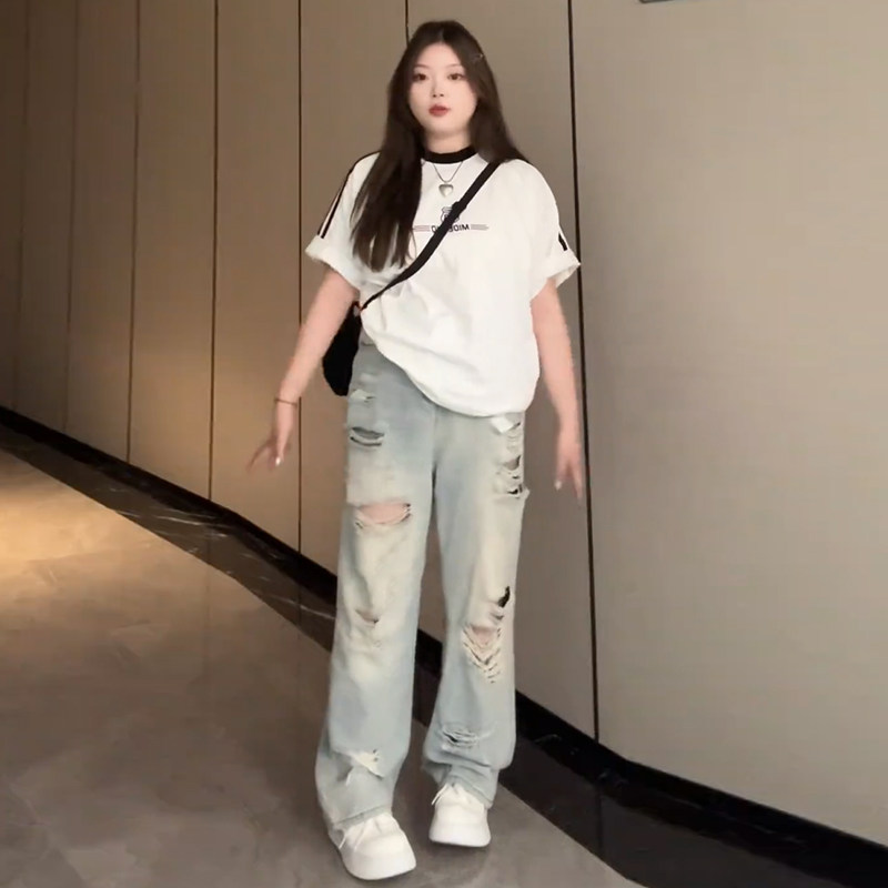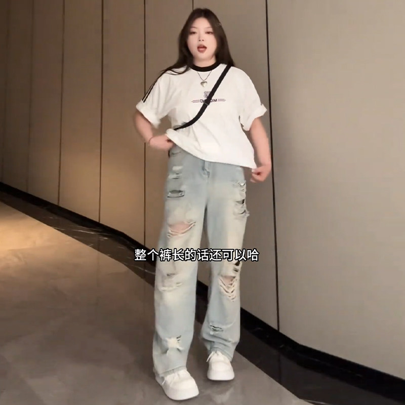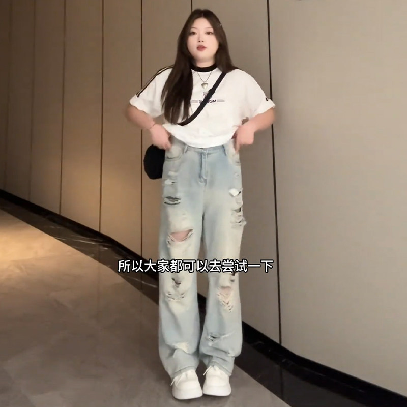 Plus-Size Distressed Ripped Jeans for Women, Summer, Slimming, Straight-Leg, Loose, Trendy, American Retro High Street Pants