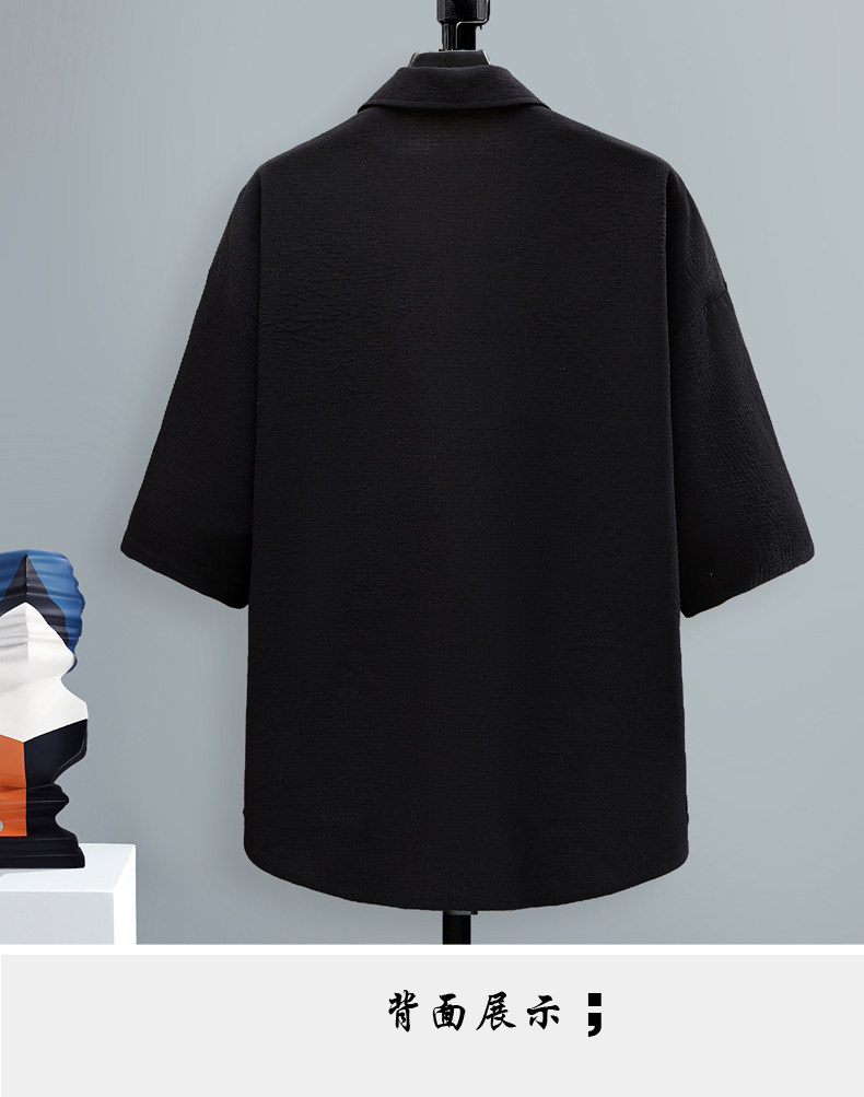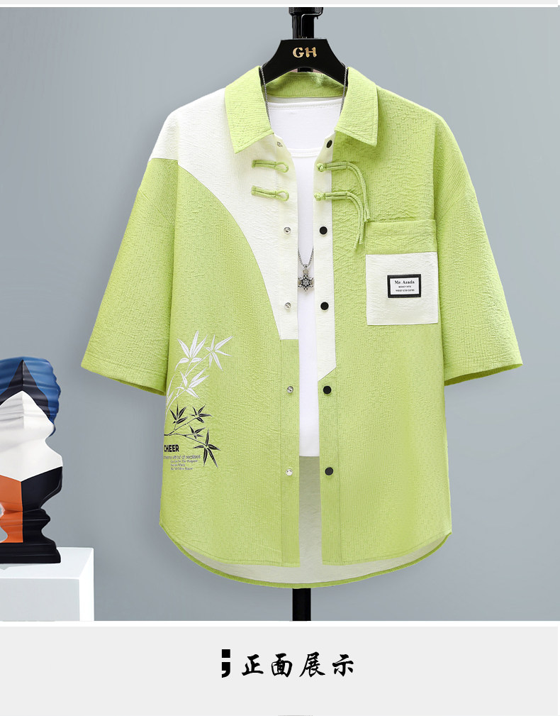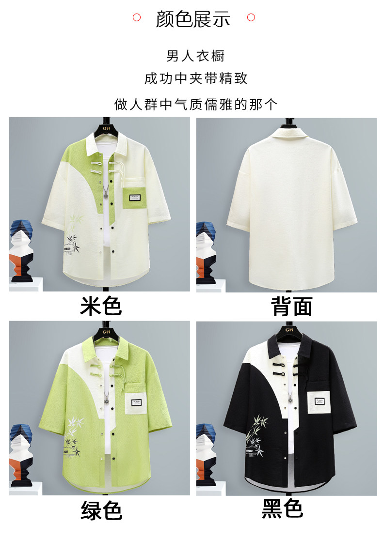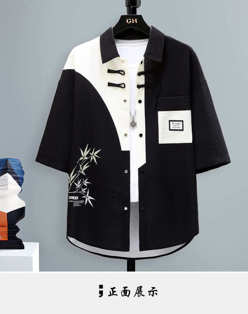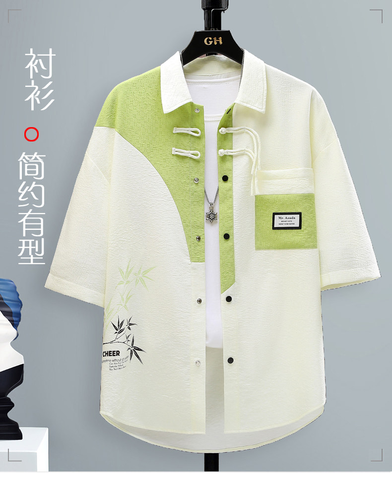 Chinese Style Short-Sleeved Shirt for Men, Summer Loose Fit, Trendy and Cool, Five-Quarter Sleeves, New Chinese Style, Color-Blocking, Versatile and Stylish Shirt