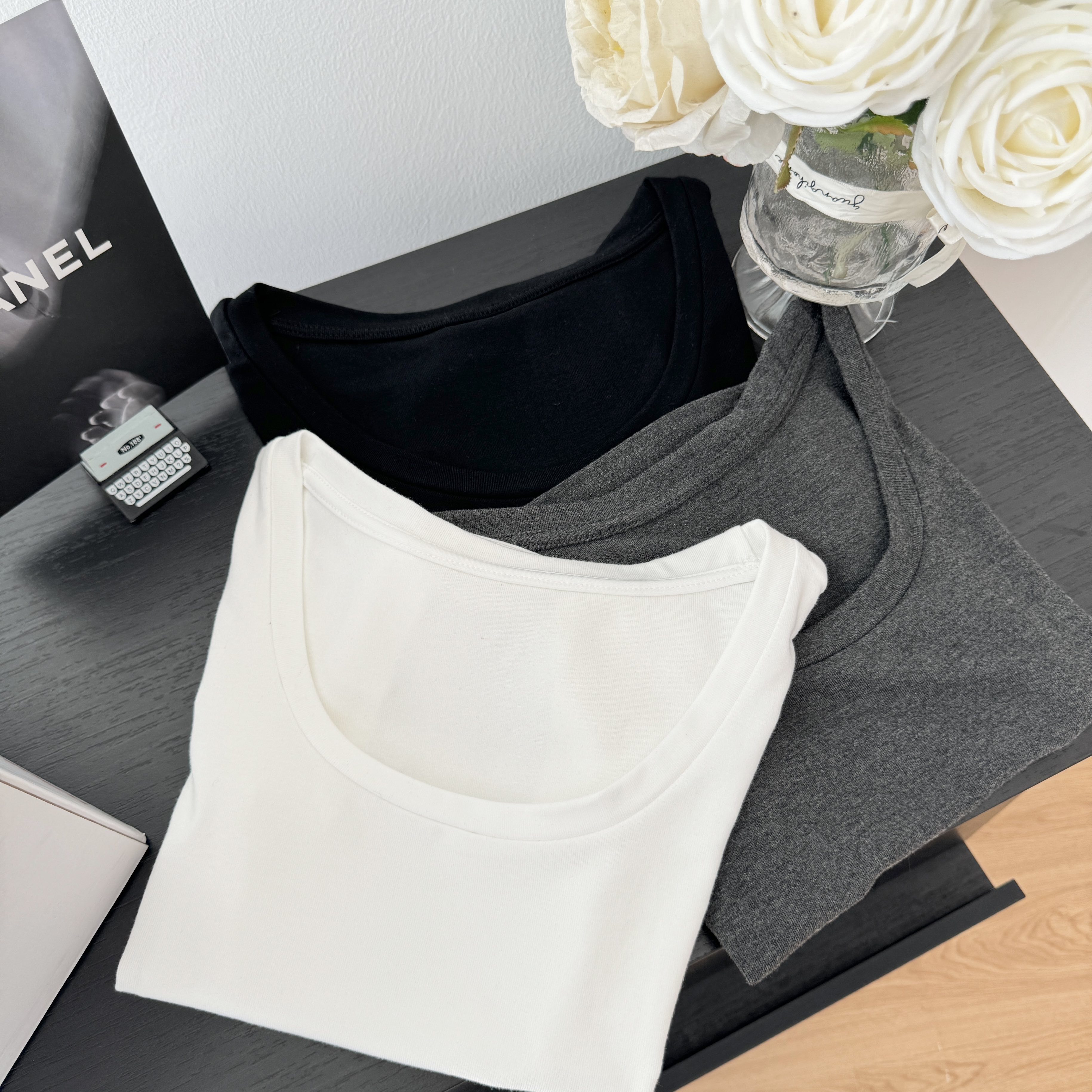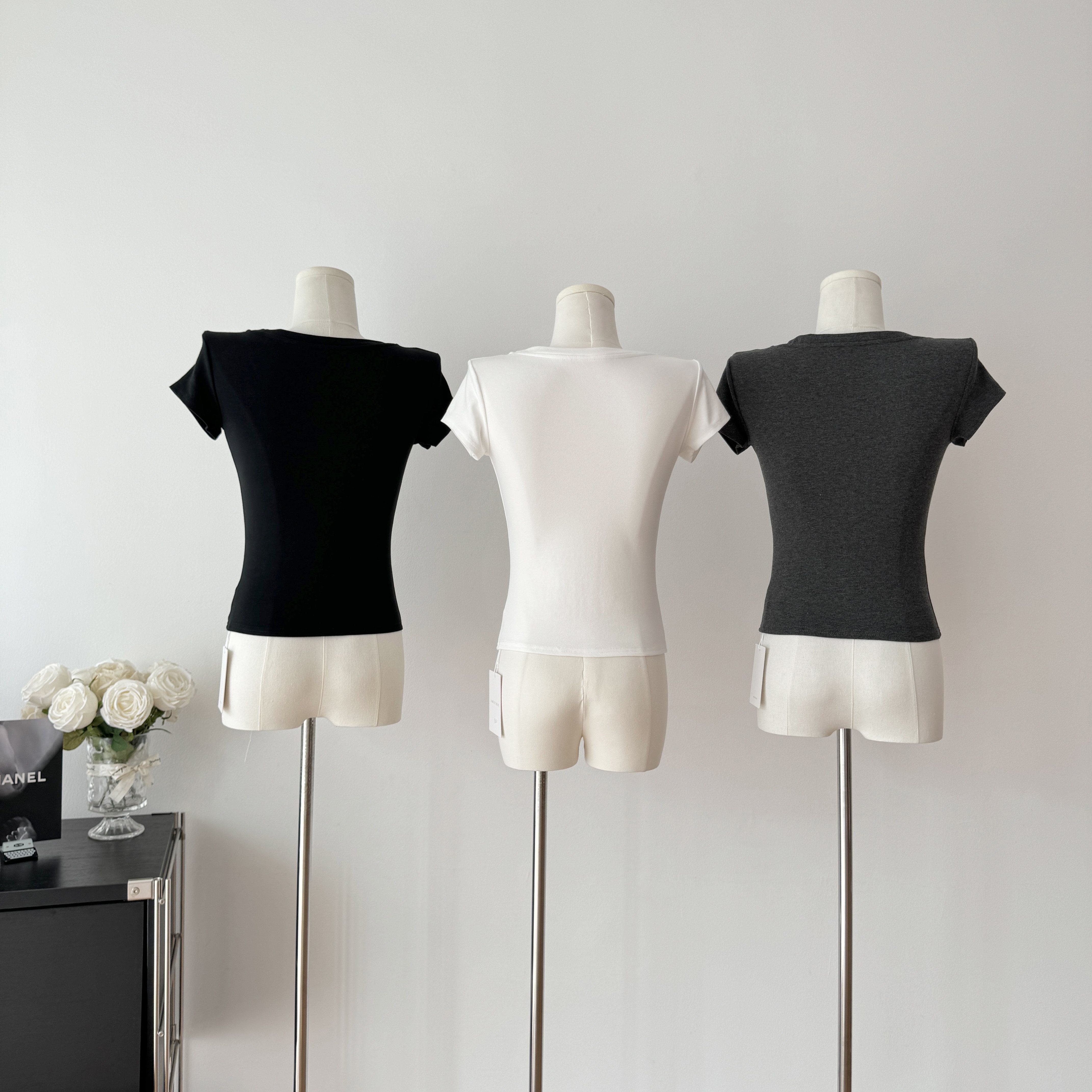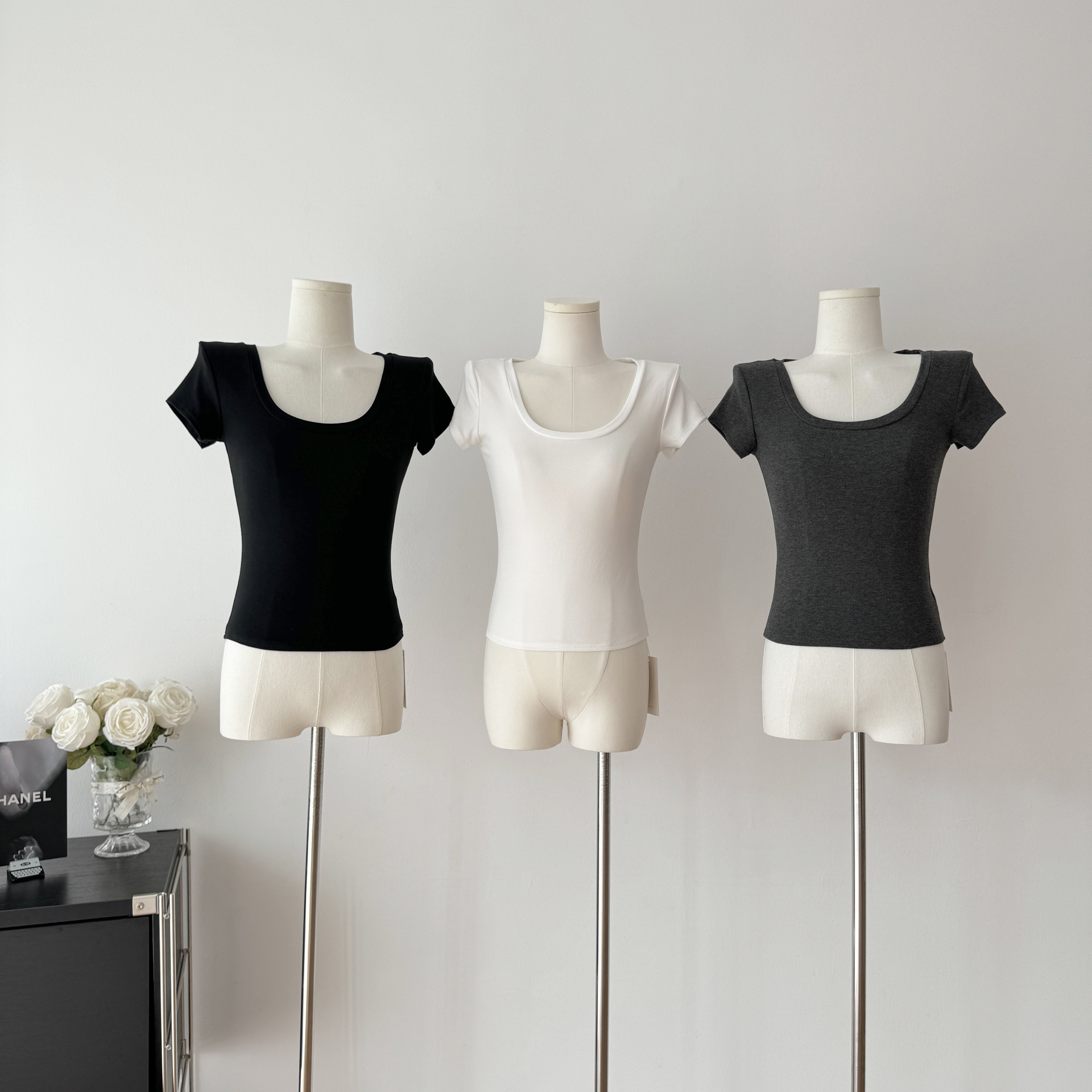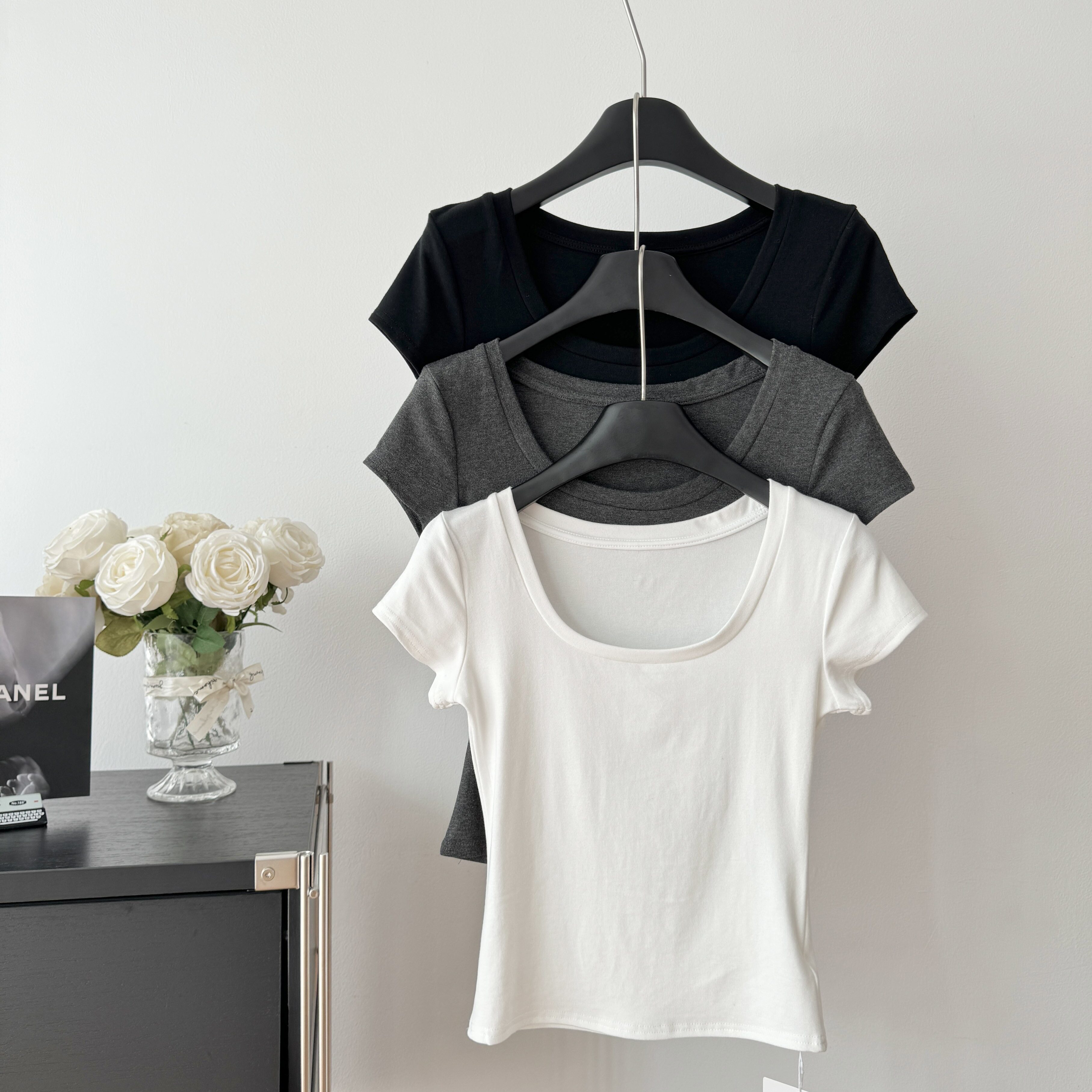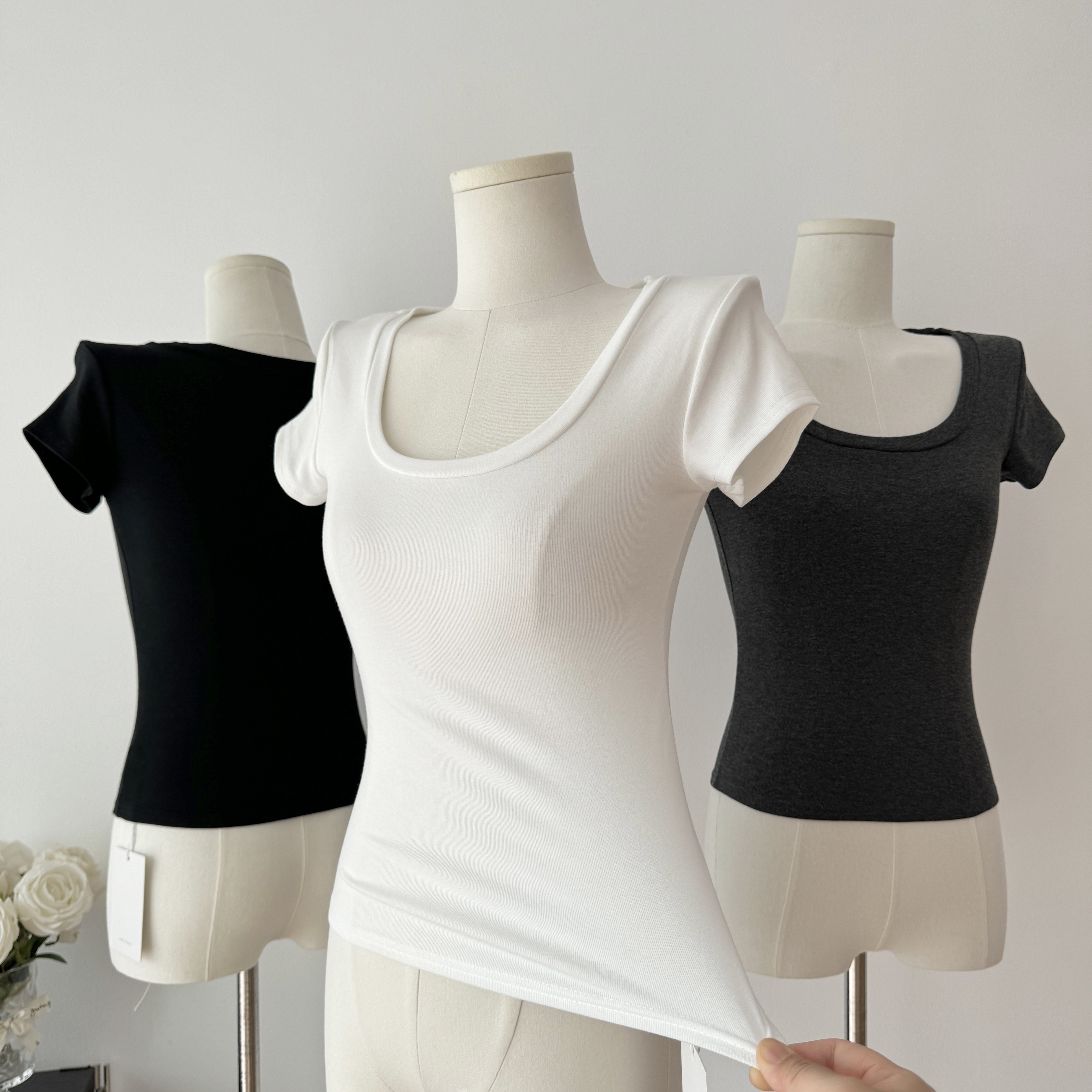 Popw LAOSHU Minimalist Large U-Neck Short-Sleeved T-Shirt for Women 2024 Summer New Style White Slim Short Shoulder Top